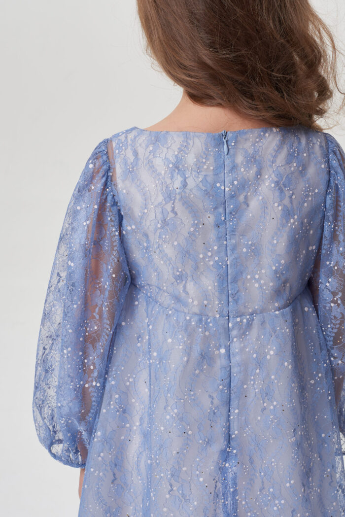 This elegant lace dress in delicate blue colour has an elegant boat neckline, which emphasises the neck and shoulders, giving the look of sophistication. The high waist creates an effect of lightness and playfulness, emphasising the silhouette. Voluminous sleeves add airiness to the outfit and provide freedom of movement. The front of the dress is decorated with elegant decorative elements in the form of charming flowers. Shiny sequins are scattered all over the surface of the dress. This model will be an ideal choice for special occasions. The dress fastens at the back with a zip.