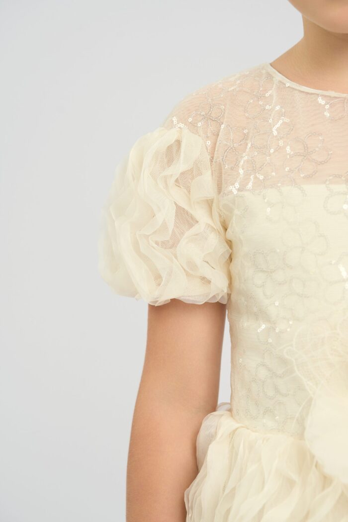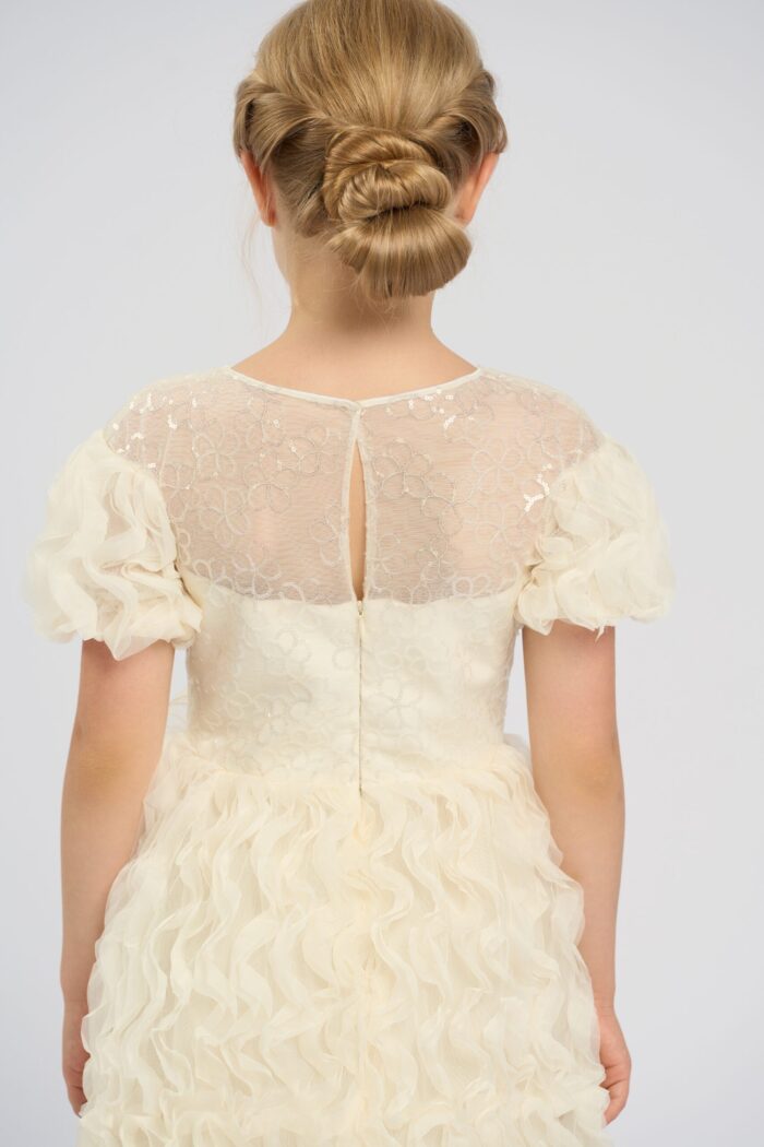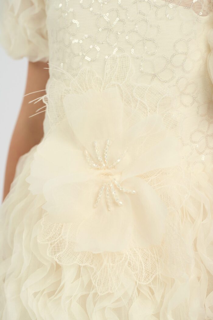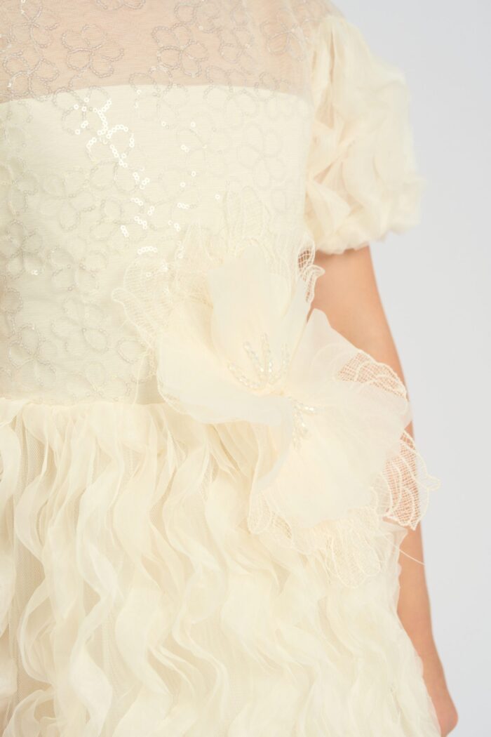 The dress in delicate ecru colour for a girl is an ideal choice for special occasions. The skirt of the dress made of light material is decorated with vertical wavy flounces of tulle, which give it volume and dynamism, creating the effect of lightness and airiness. At the waist there is a lush floral decoration, which accentuates the silhouette. Short voluminous sleeves make the dress playful and elegant, and the textured bodice with a transparent insert under the round neckline adds elegance and sophistication to the model. The zip fastening at the back ensures a comfortable and secure fit, making the dress easy to put on and take off.