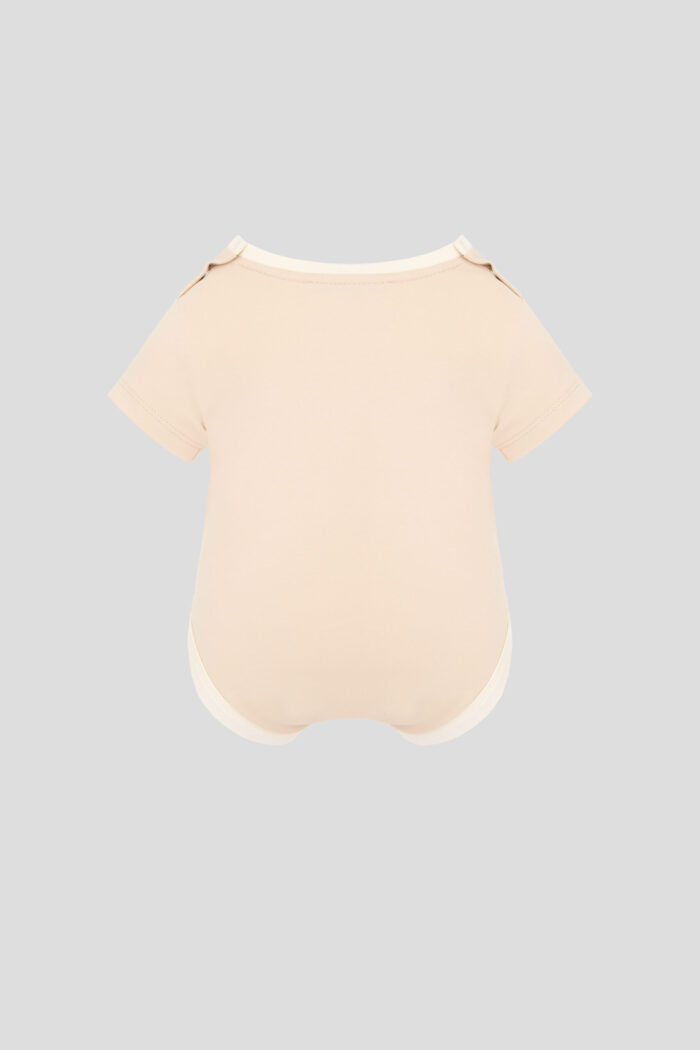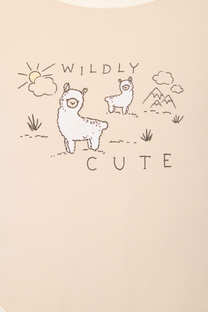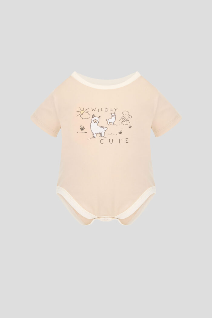 Soft knitted bodysuit in basic ecru colour is decorated with a print of cute alpacas. The model has a round neckline and short sleeves. It comfortably fits the baby’s body without restricting movements. For the convenience of changing clothes between the legs there is a button fastener. There is also a button fastener on the shoulders. The natural cotton is breathable, which ensures the comfort of the baby.