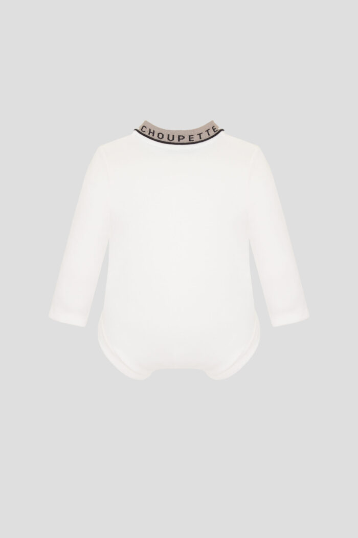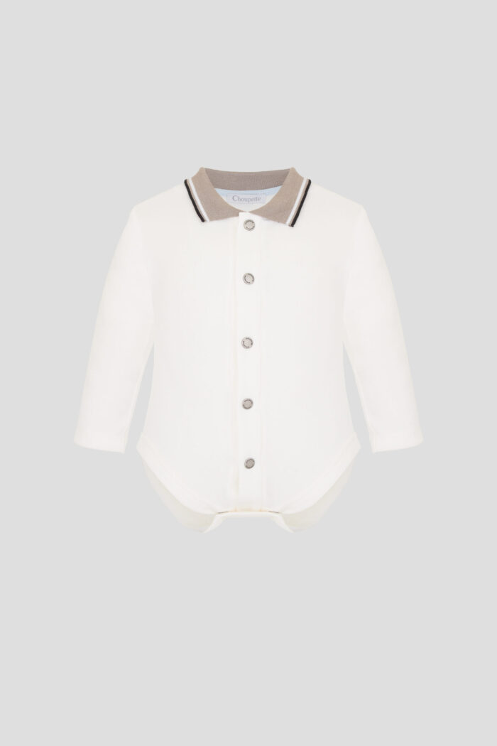 The bodysuit for a little boy is made of natural cotton in ecru colour. The comfortable fastening is located along the entire length of the item and between the legs. The elastic collar in contrasting colour gives the item a stylish look. The bodysuit has long sleeves, which gives comfort and warmth to the baby. Soft and pleasant to the touch fabric and comfortable fit provide freedom of movement for the child. The model is ideal for everyday wardrobe.