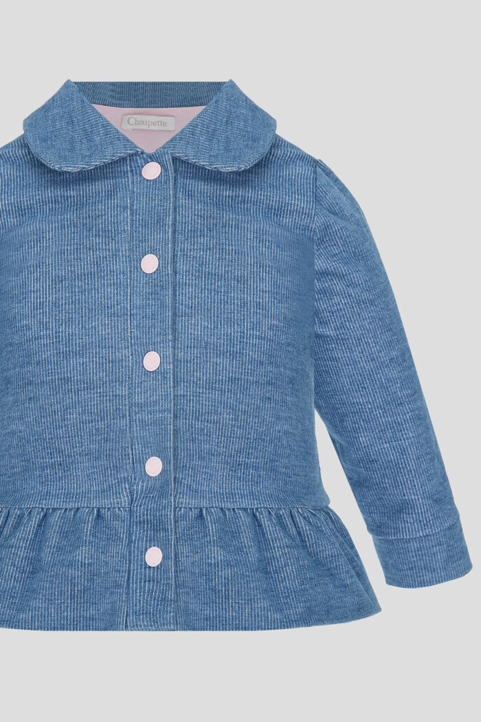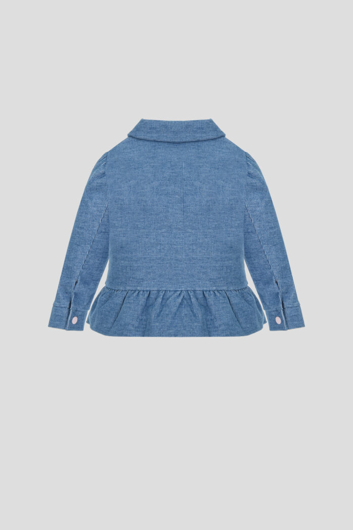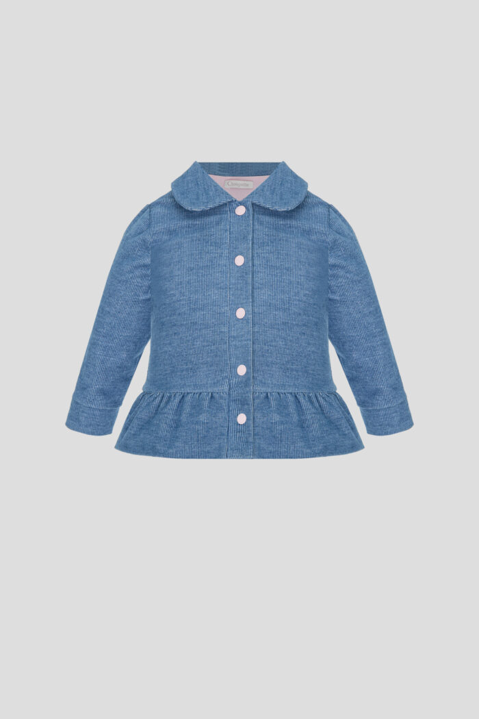 Knitted jacket in denim color for a baby girl. The model made of quality cotton will be ideal for everyday wear. Convenient button closure makes it easy to dress, and shirt collar gives the product an elegant and neat look. The peculiarity of the jacket is the basque on the waist. Original decorative elements make it a great choice for creating both casual and more dressy sets. The jacket will be a great addition to both jeans and skirts.