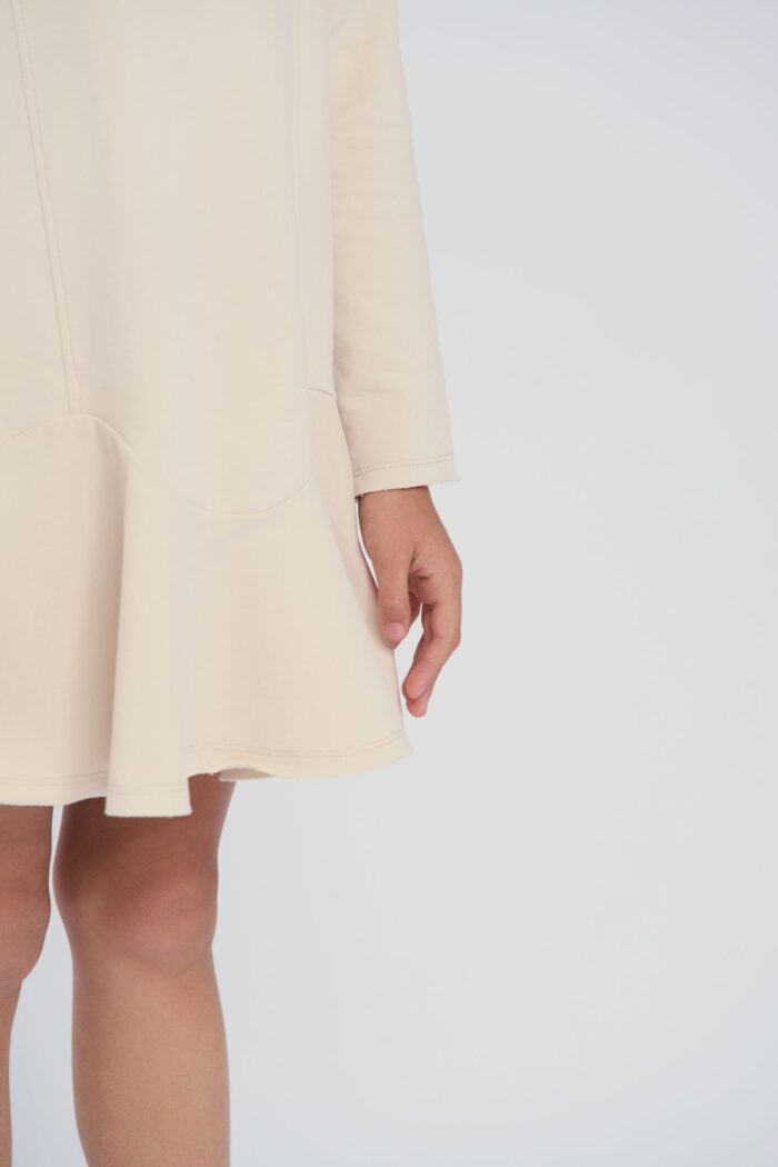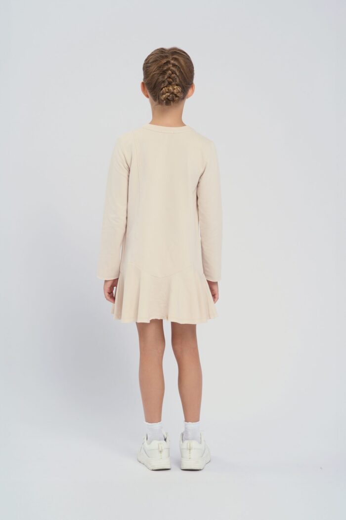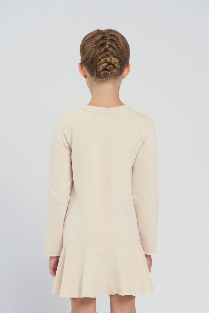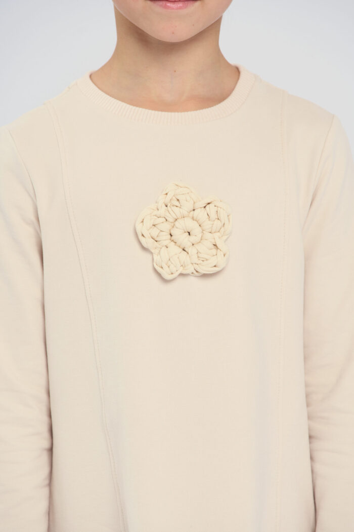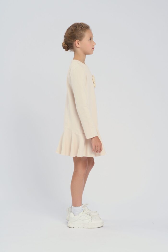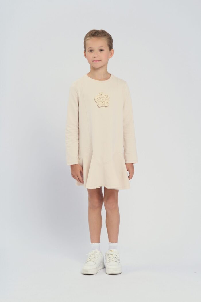 Knitted dress is made of fouter of beautiful beige shade. The model has a wide flounce on the edge. Round neckline and comfortable loose silhouette guarantee comfort to the child, so the dress suitable for everyday wardrobe and active wear. A voluminous knitted flower, located in the centre of the dress, serves as an effective decoration of the design. High-quality blended fabric has good elasticity, does not stretch and quickly restores its shape.