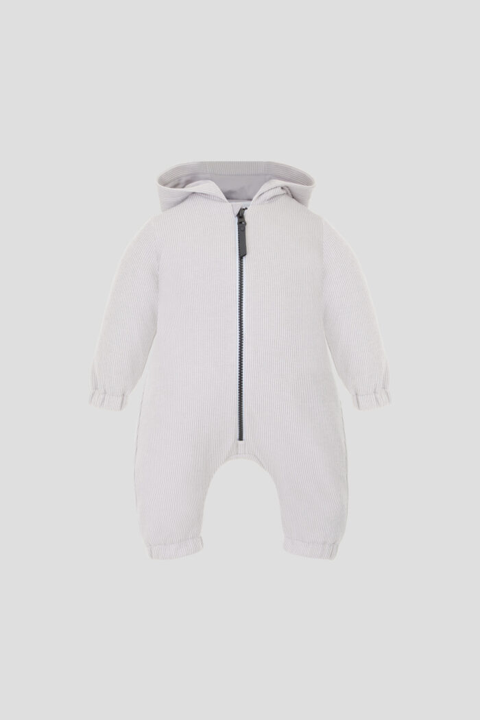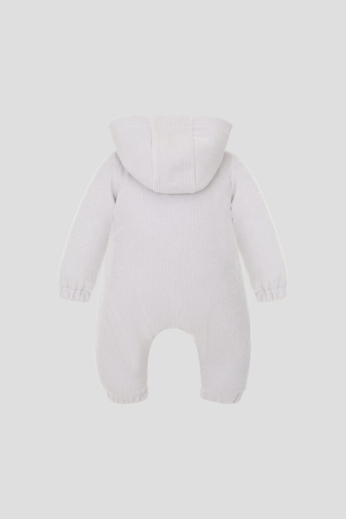 Basic baby overalls with hood are made in grey melange colour and have a textured knit in the form of „noodles“. The fabric of the item is dense and soft. The zip is located along the entire length of the overalls, which makes it easy to change the baby’s clothes. The hood protects the head from the wind. The overalls have a comfortable fit that does not restrict the baby’s movements. The sleeves and the bottom of the pants have comfortable cuffs.