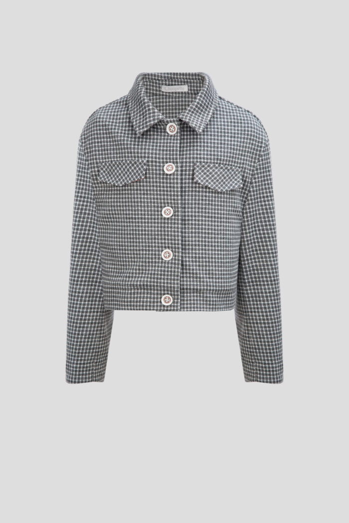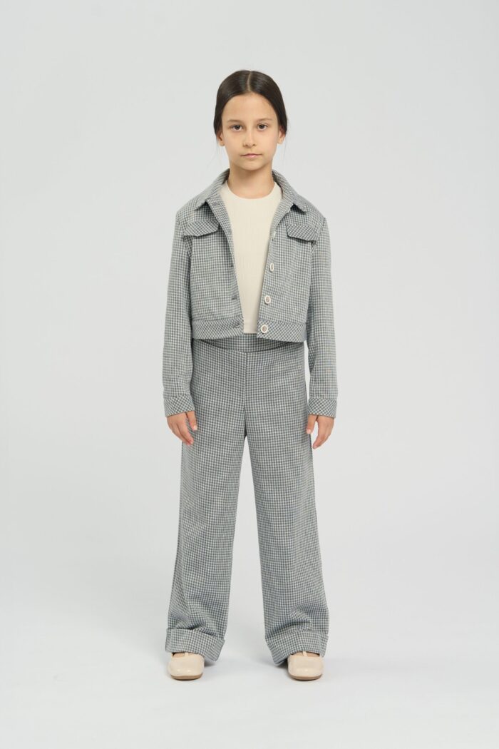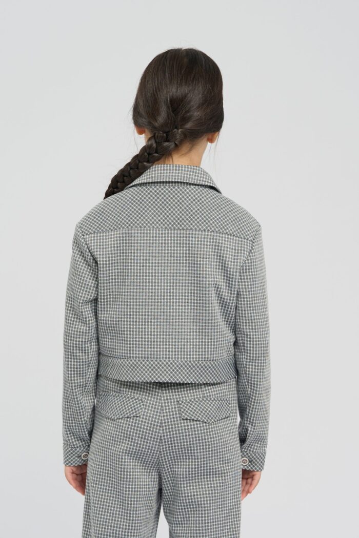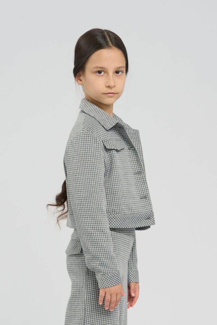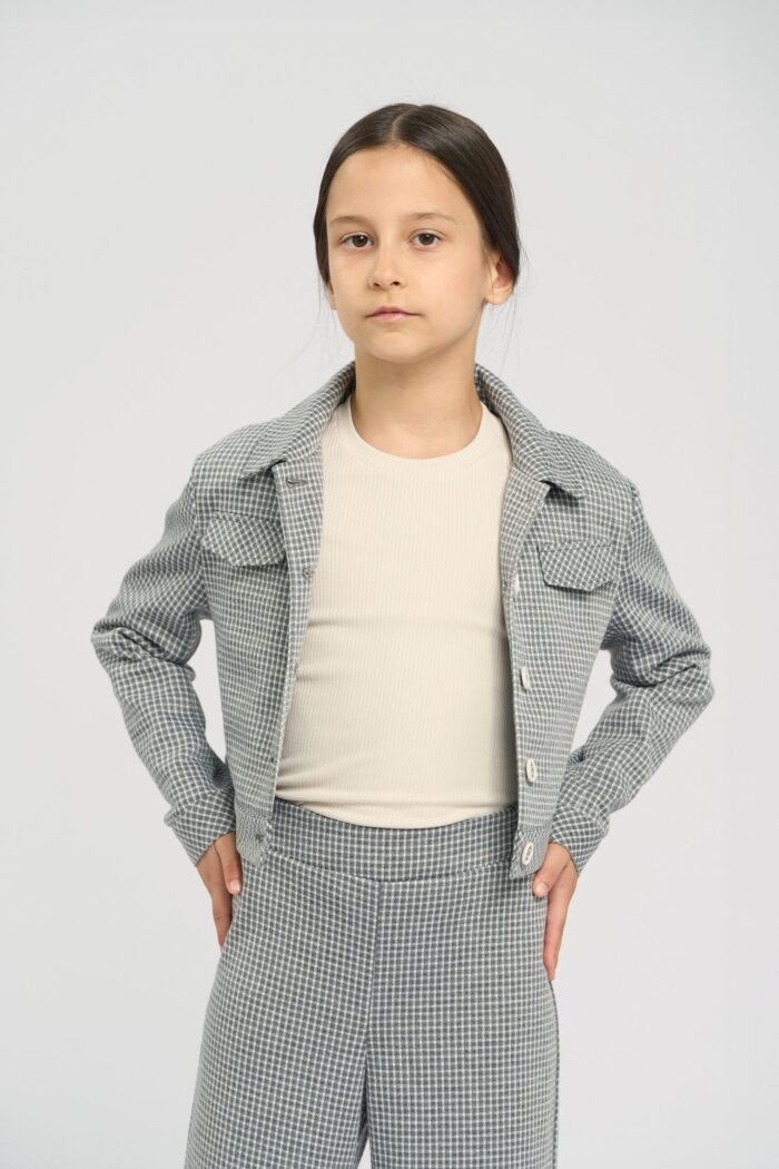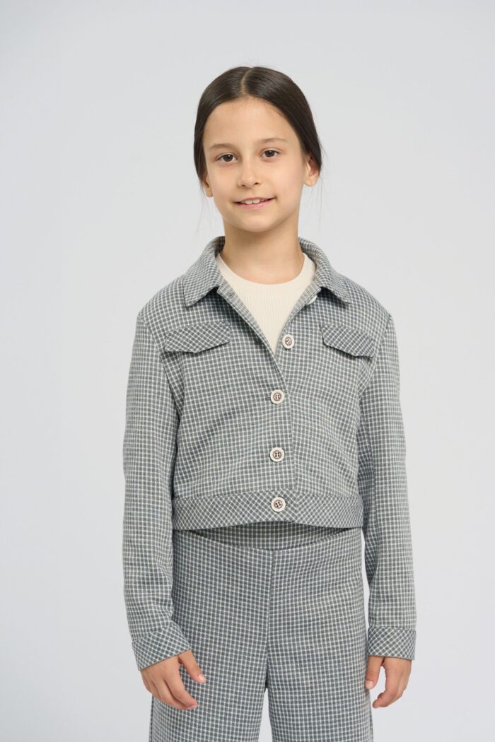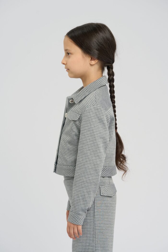 Stylish jacket for girls is made of soft jersey and decorated with a small plaid print. The model has a slightly shorter length and thanks to its laconic design will perfectly complement any bottom. Fake pockets on the chest additionally decorate the design. The high-quality material is practically wrinkle-free, which allows the child to keep a neat appearance throughout the day. The jacket fastens with contrasting buttons. The model has a lining of cotton fabric.