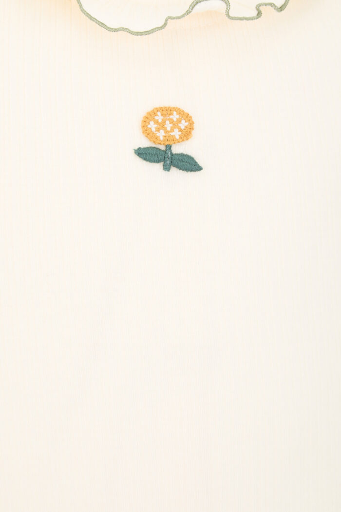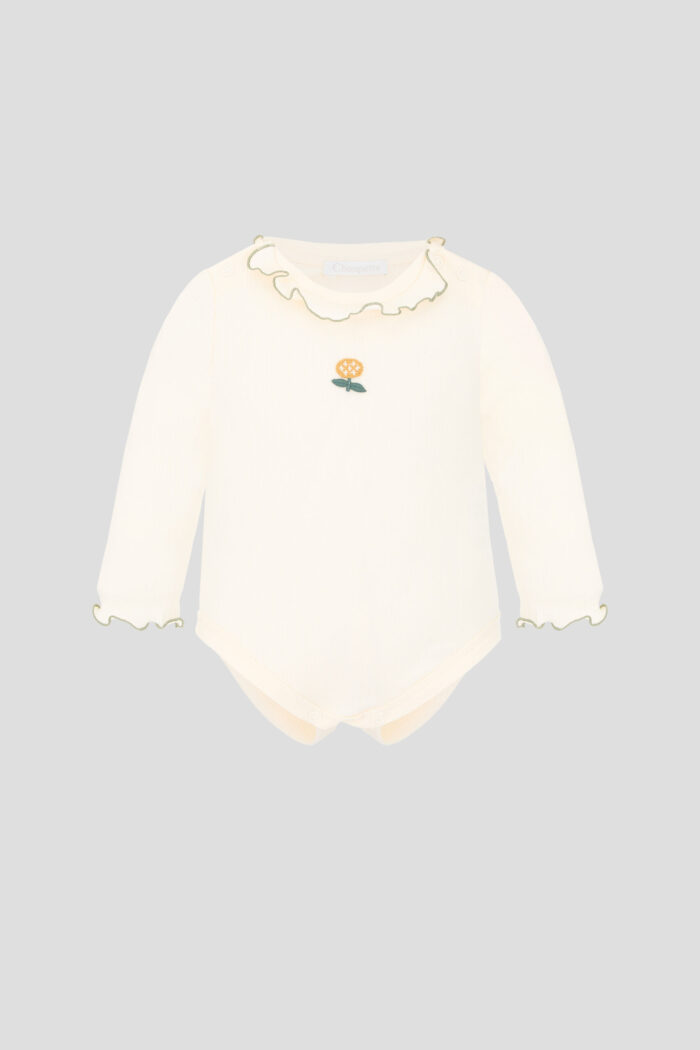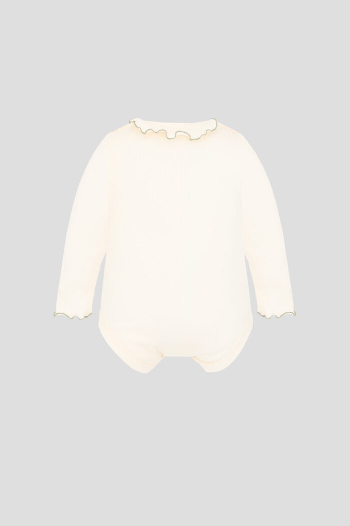 This cream-coloured knitted baby bodysuit is a perfect addition to your little girl’s wardrobe. The model with a round neckline is decorated with a ruffle. Floral patch under the neckline adds charm to the design. Functional button fastenings on the shoulder and between the legs allow for quick donning and doffing. The natural cotton-based material does not cause allergic reactions on the sensitive skin of babies. It is highly breathable, which prevents overheating and ensures comfort.
