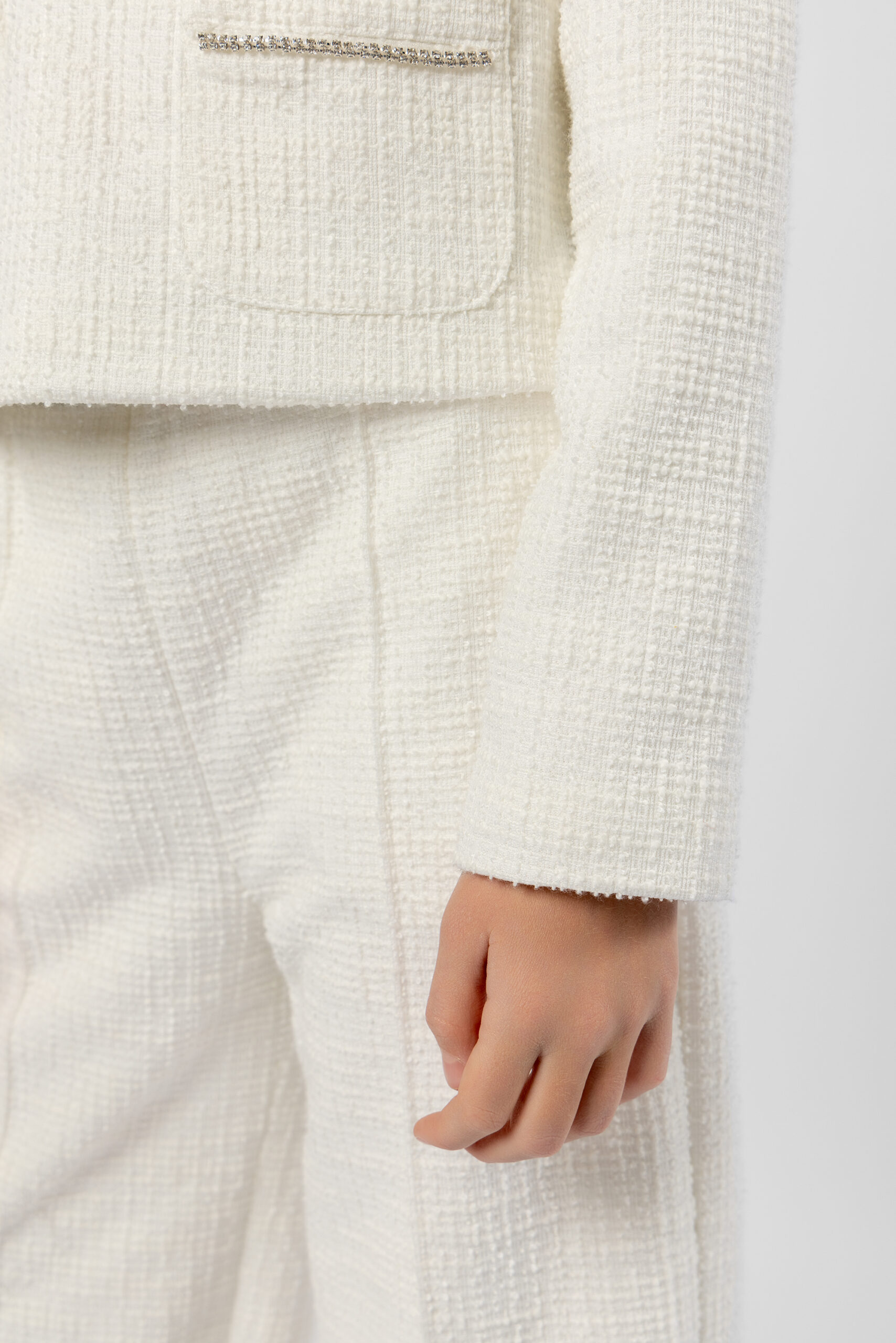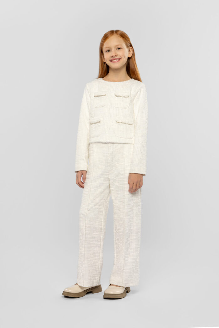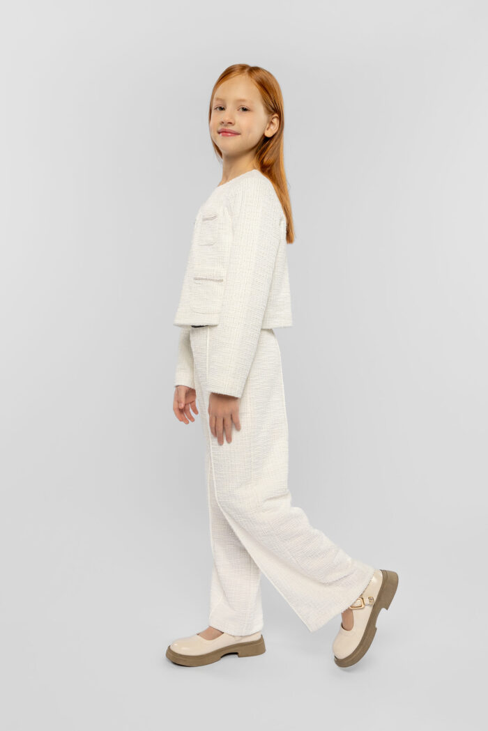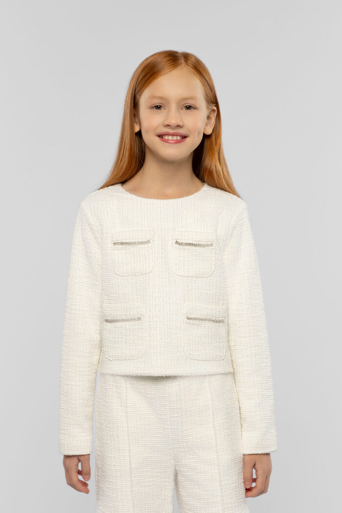 This elegant jacket for girls in a warm white shade will emphasise individuality and become a versatile addition to any wardrobe. The loose fit of the model looks stylish and very elegant. The stylish faux pockets decorated with an elegant gold chain add a special touch. There is a full-length zip fastening at the back. This jacket is easy to combine with various outfits, and when paired with pants from the same collection, it creates a complete ensemble.