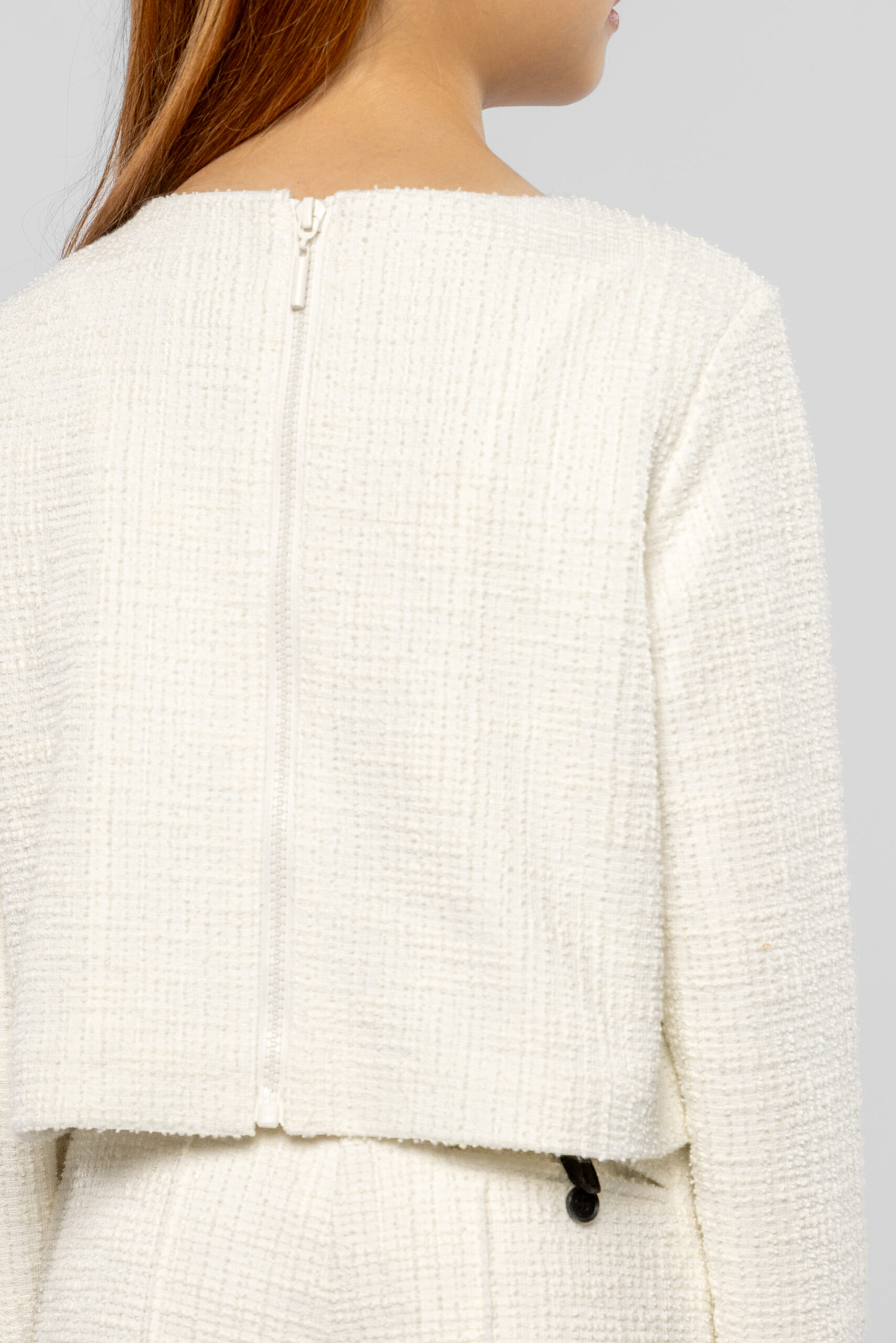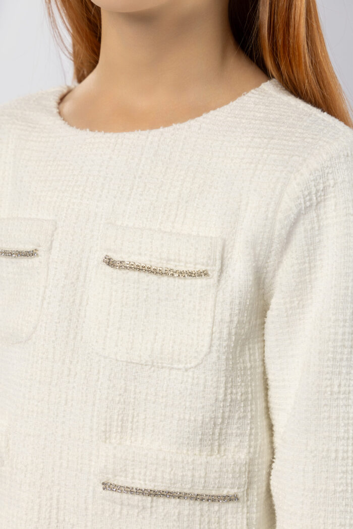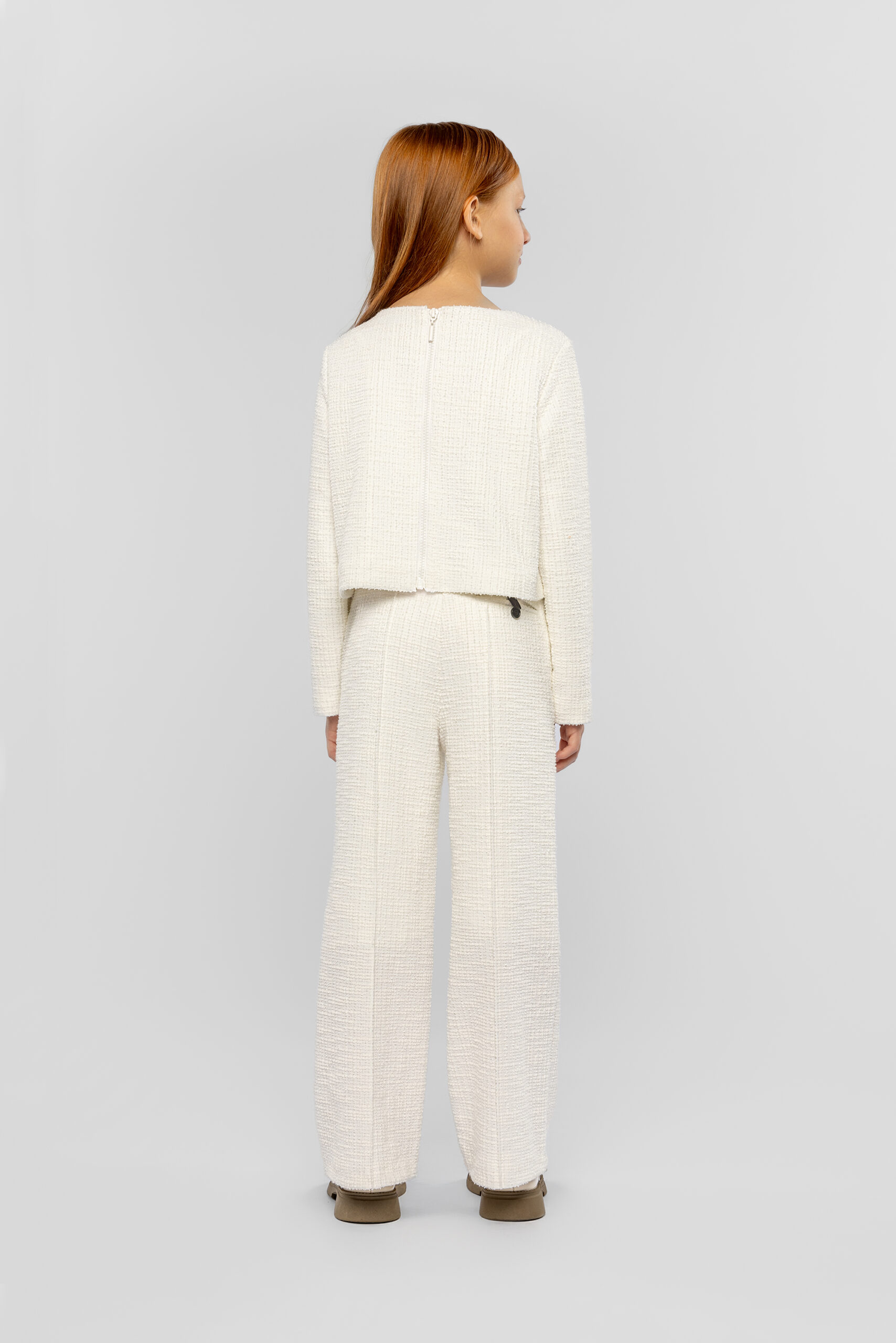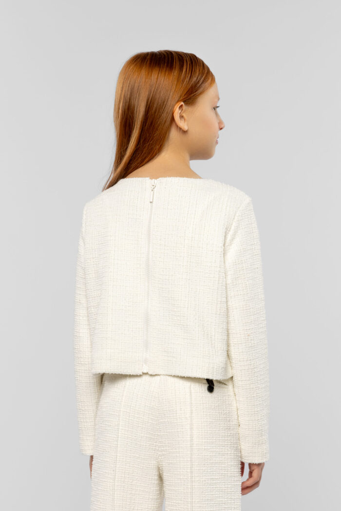 This elegant jacket for girls in a warm white shade will emphasise individuality and become a versatile addition to any wardrobe. The loose fit of the model looks stylish and very elegant. The stylish faux pockets decorated with an elegant gold chain add a special touch. There is a full-length zip fastening at the back. This jacket is easy to combine with various outfits, and when paired with pants from the same collection, it creates a complete ensemble.
