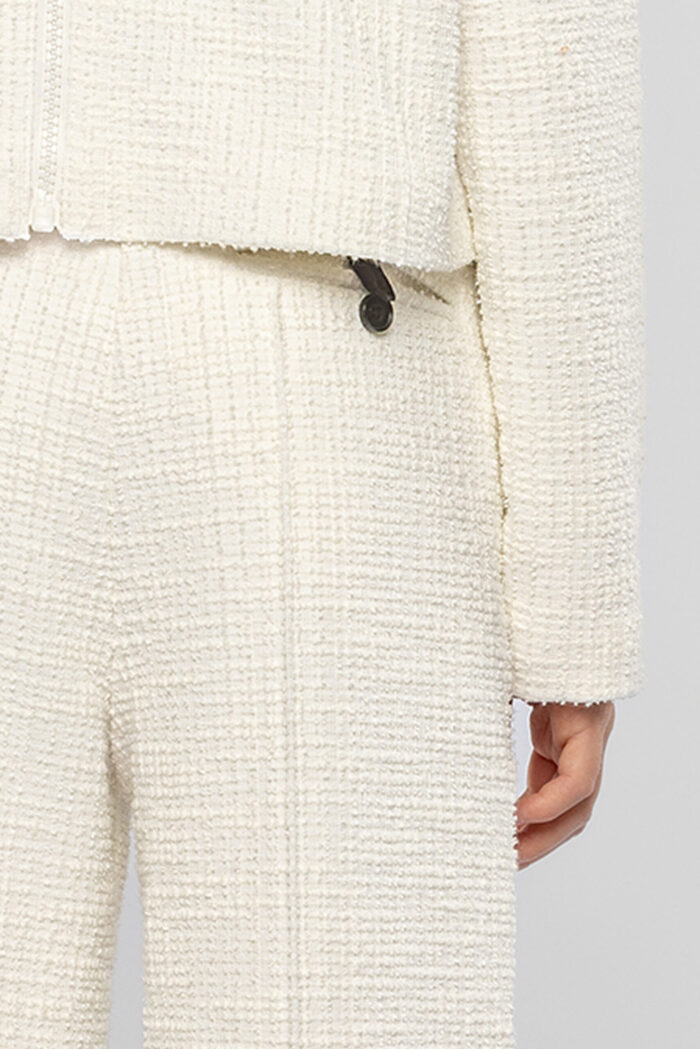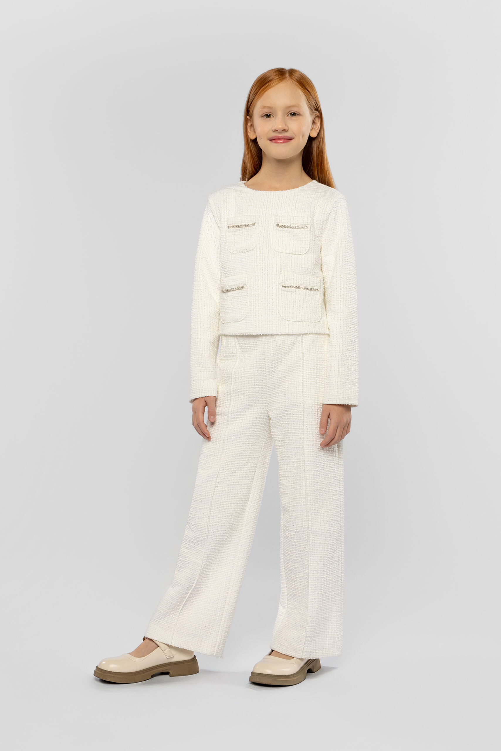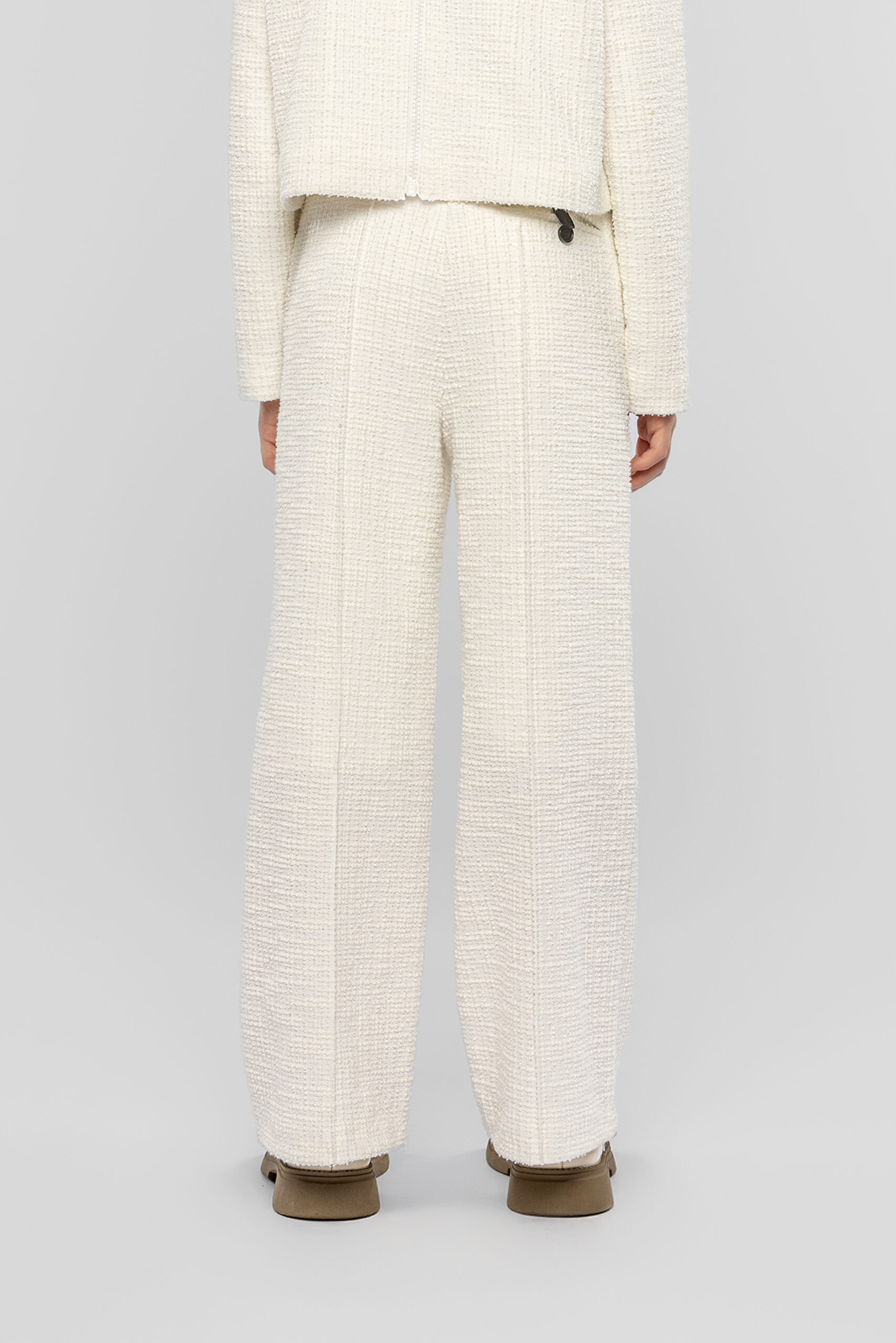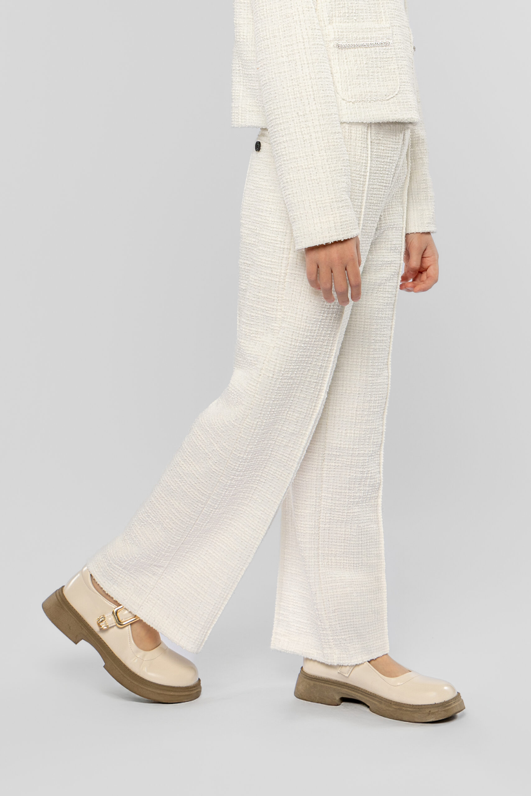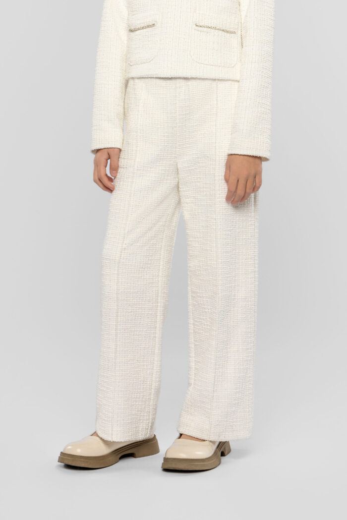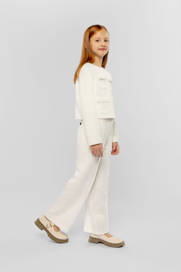 Knitted pants for girls in a fashionable warm white shade are not only stylish but also practical. The straight fit gives the look neatness and sophistication. The elastic contrasting black waistband ensures a perfect fit. The pants are decorated with a faux pocket at the back. This model goes perfectly with tops in various shades, cardigans and neutral blouses. Combined with a jacket from the same collection, they form a harmonious ensemble.