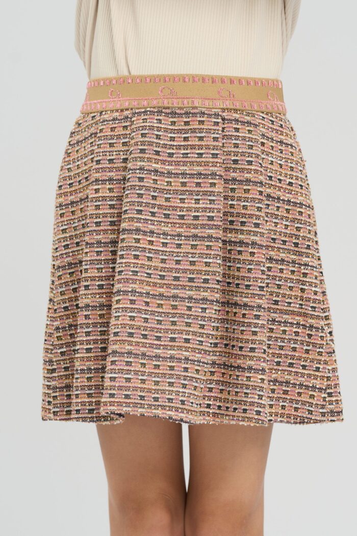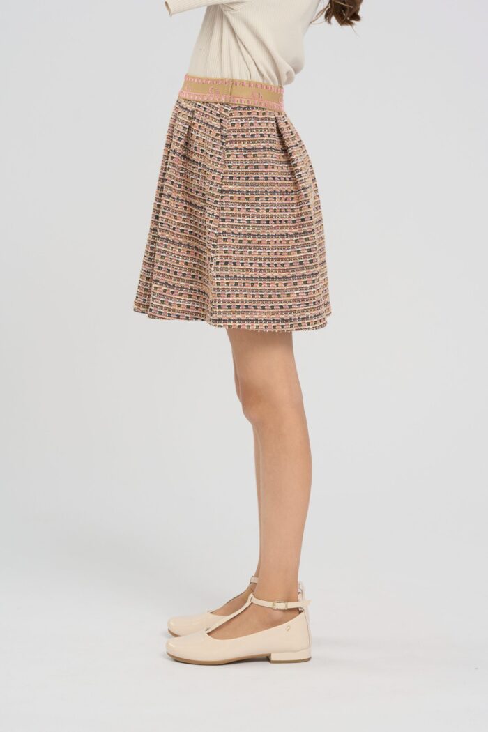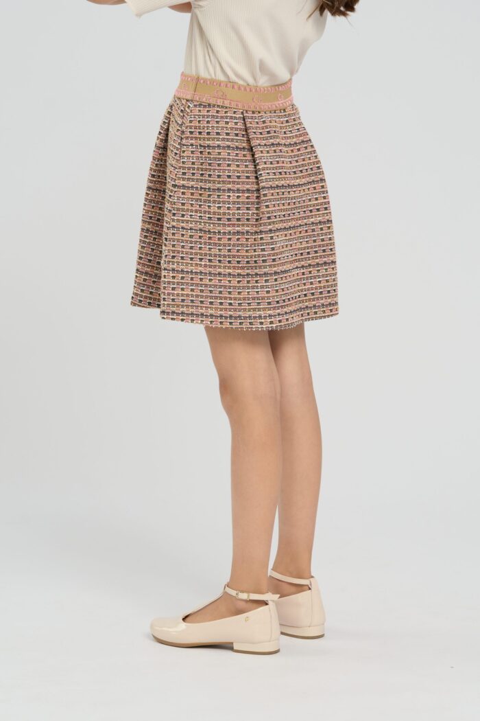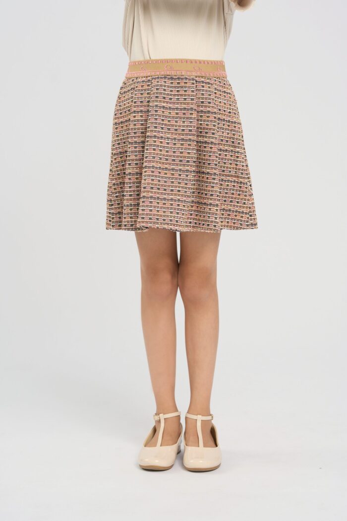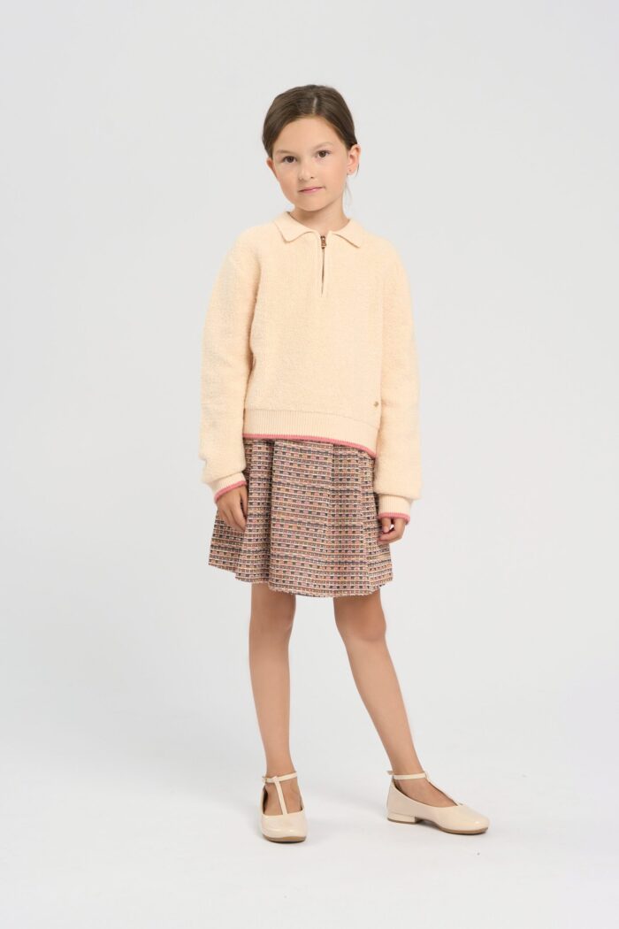 This trendy knitted skirt has a spectacular texture and an understated combination of colours, making the design incredibly elegant. The wide elasticated waistband guarantees a comfortable fit, nothing will distract the child from playing or studying. There is a beautiful embroidery on the waistband. The pleats at the waist create a nice volume to the skirt. Thought-out length allows you to combine with the skirt any top. High-quality fabric does not wrinkle, keeps its shape and looks neat throughout the day.