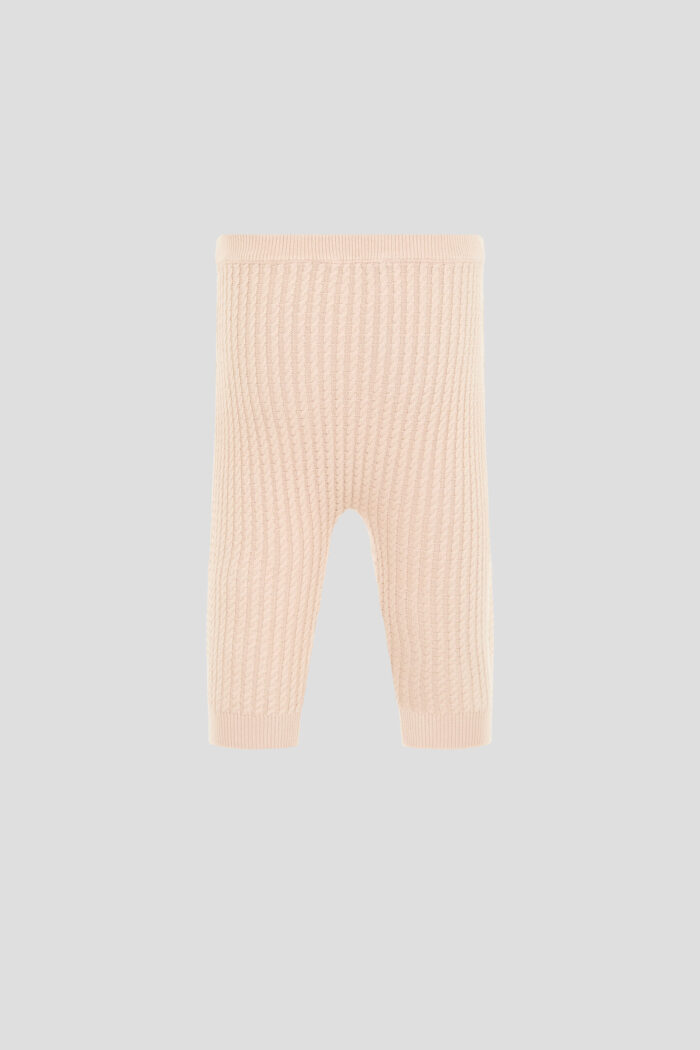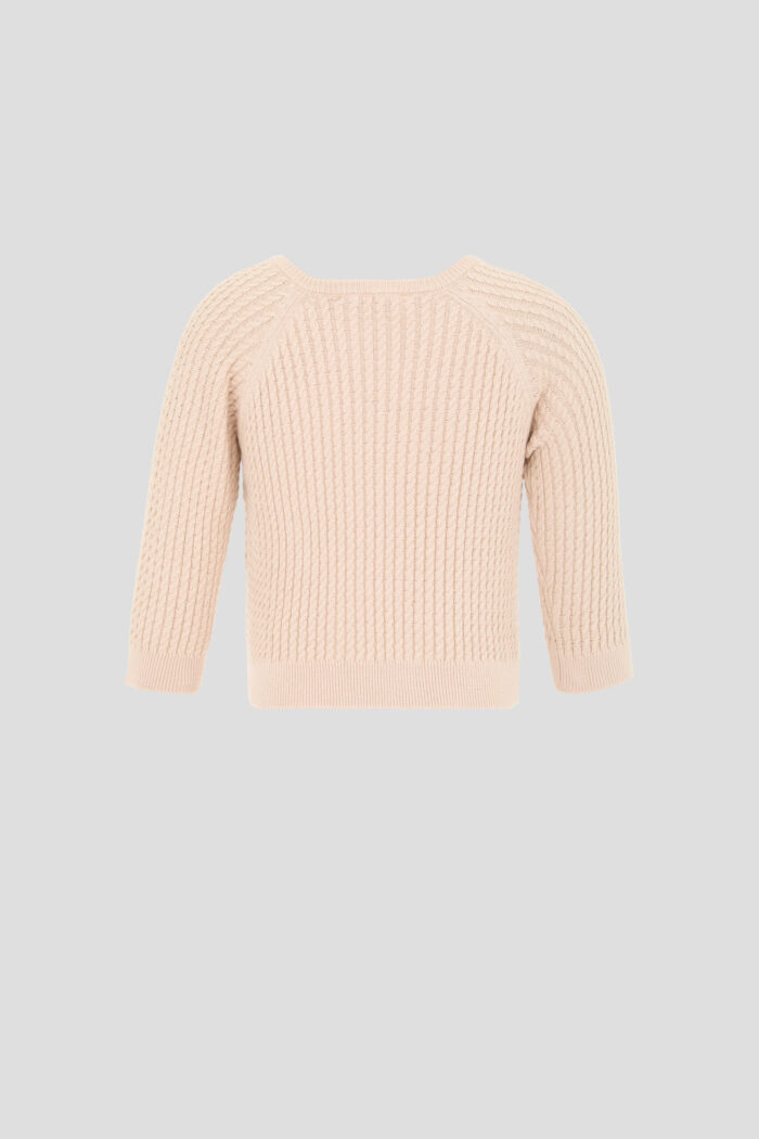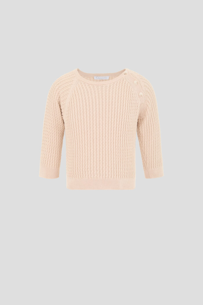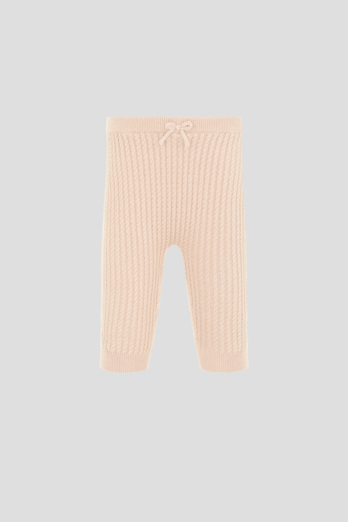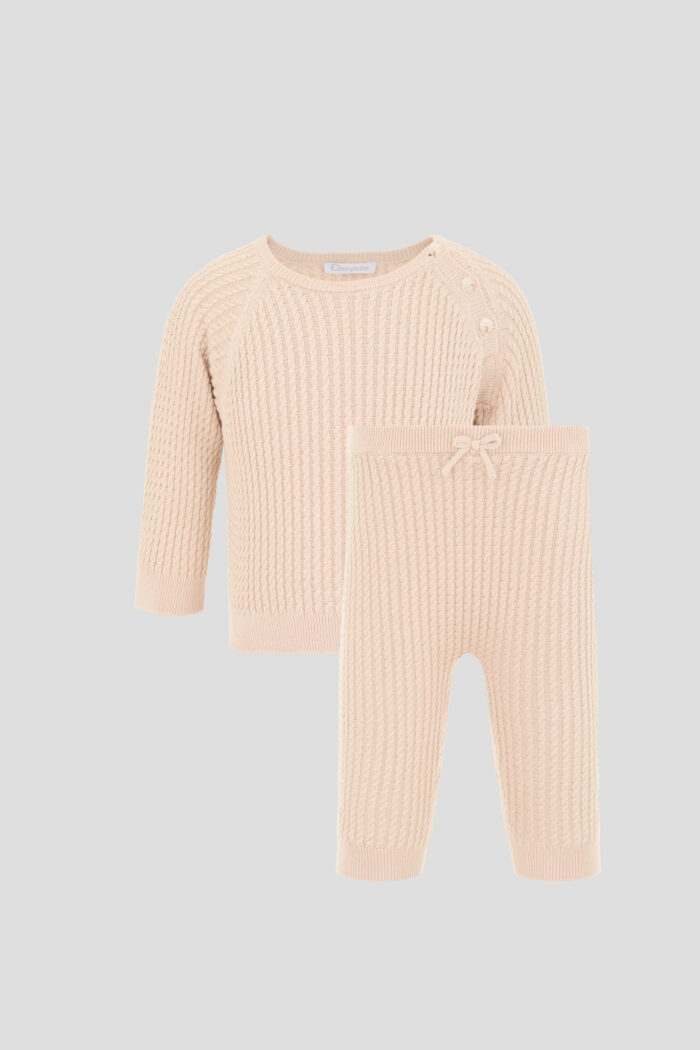 Suit of sweatshirt and pants is made in trendy laconic design. Beige shade gave the garment versatility. The main decoration of the design is a textured knitted pattern. The sweatshirt fastens with buttons located near the shoulder seam. Knitted pants with an elasticated waistband provide a comfortable fit. The natural cotton yarn is highly breathable, giving comfort to the baby’s body.
