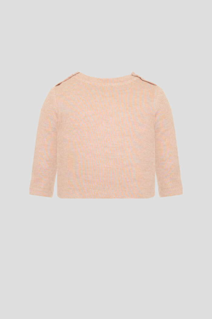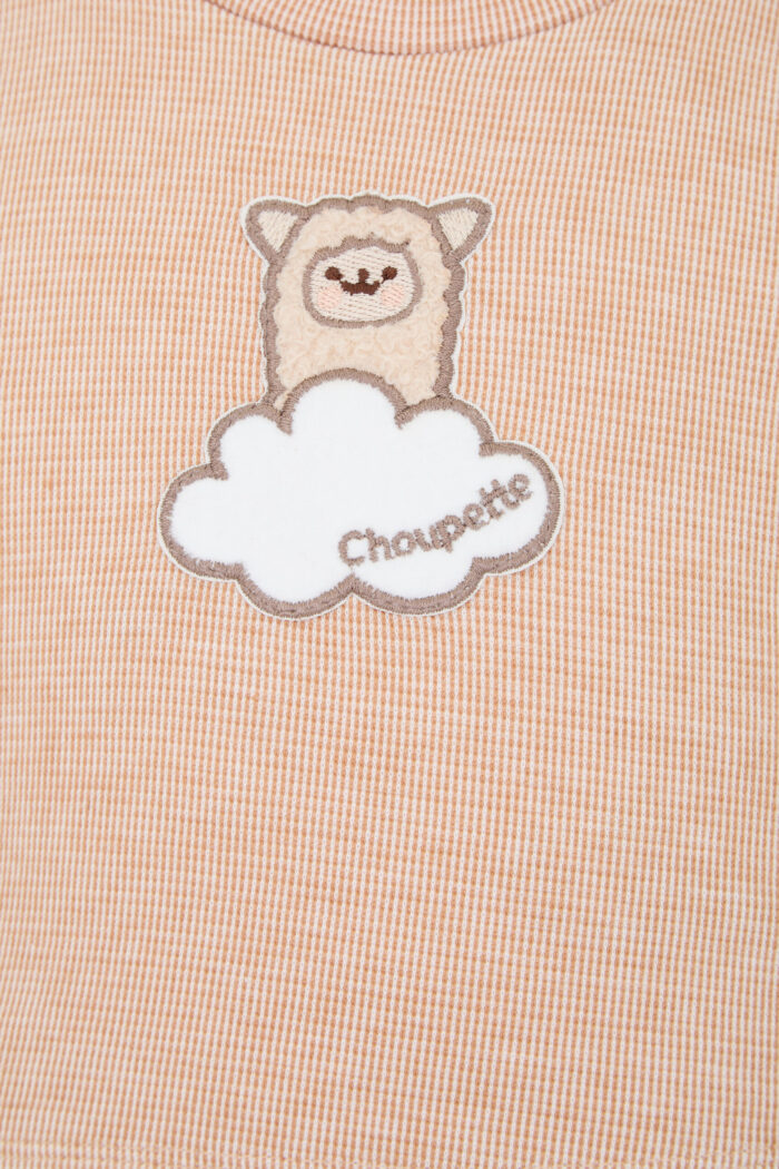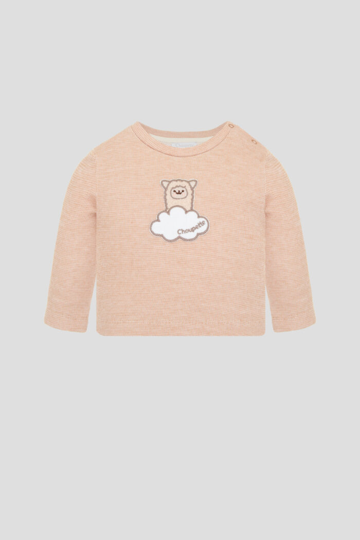 Sweatshirt in an on-trend brown shade with a cute and laconic design. The centre part is decorated with a large alpaca applique. The straight silhouette model does not press on the body thanks to the comfortable fit and elastic material. It fastens with buttons on both sides of the round neck. Natural cotton ensures optimal body temperature and prevents overheating.
