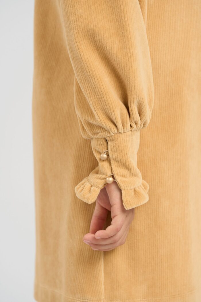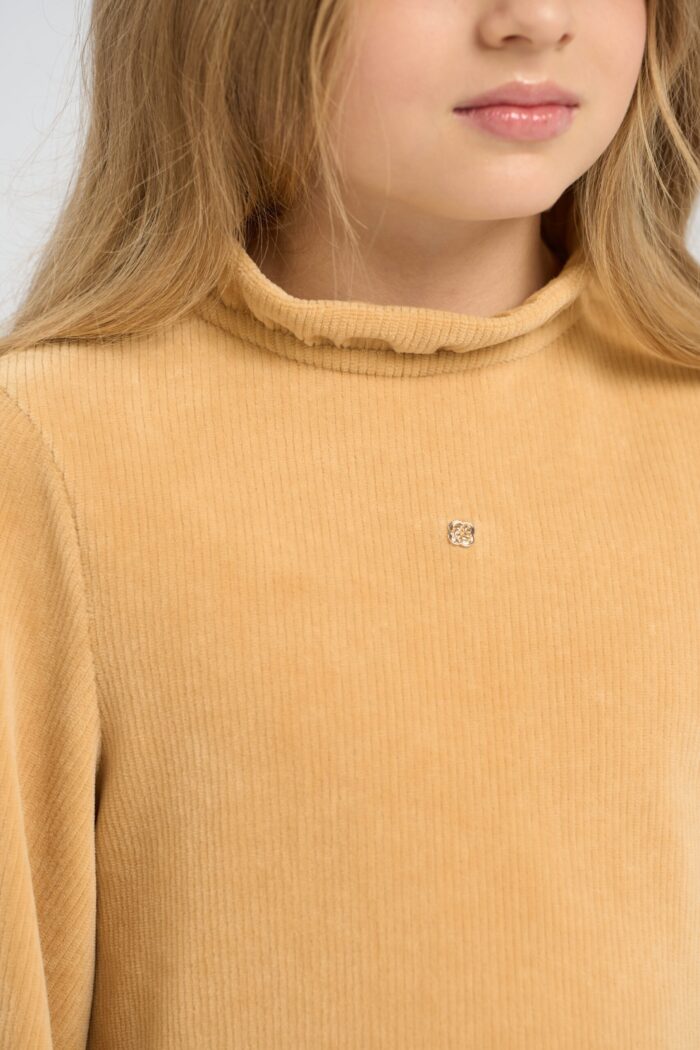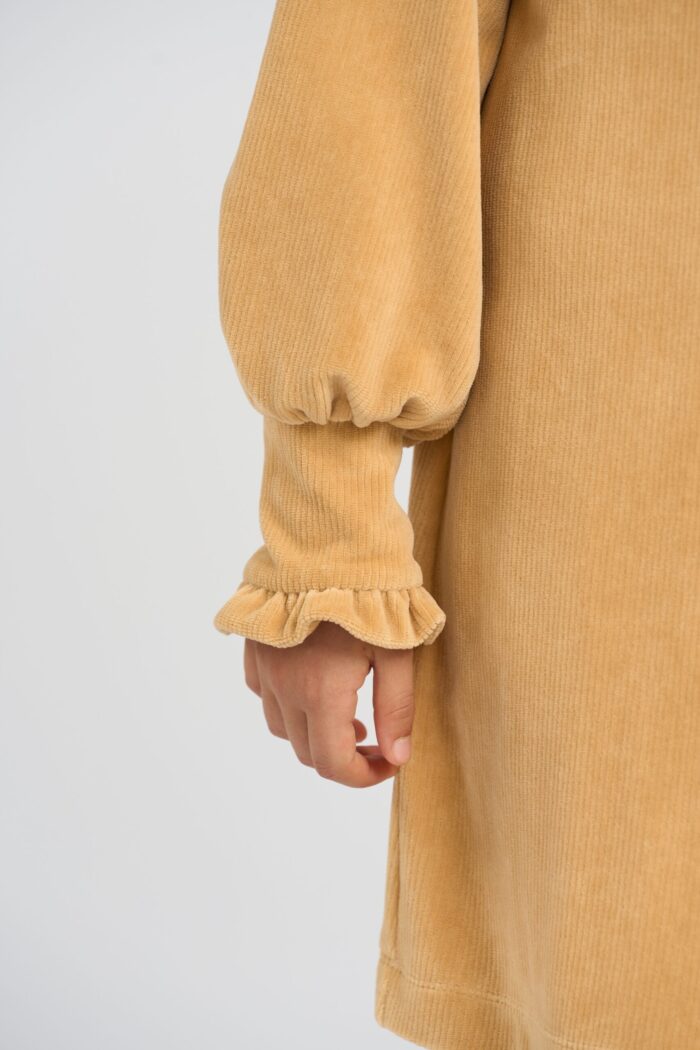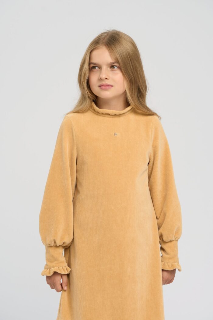 Knitted dress made of textured velour fabric in a delicate sandy shade. The model of comfortable loose silhouette gives freedom of movement, which is especially important for children. Wide cuffs with narrow ruffles are decorated with round buttons. The high collar with a ruffle fastens at the back with a heart-shaped button. The front side is decorated with a decorative element in the form of a flower. High-quality cotton-blend fabric guarantees comfort for your child even during active everyday wear.