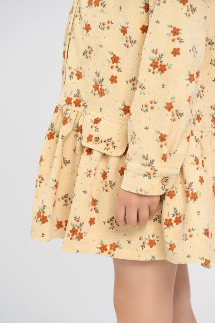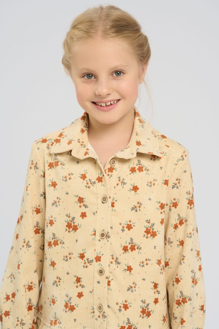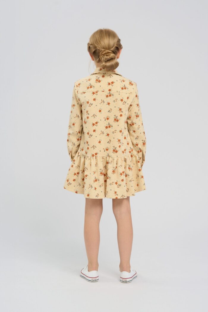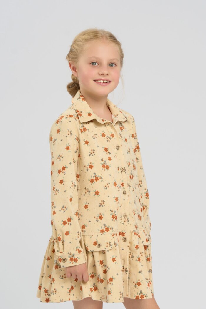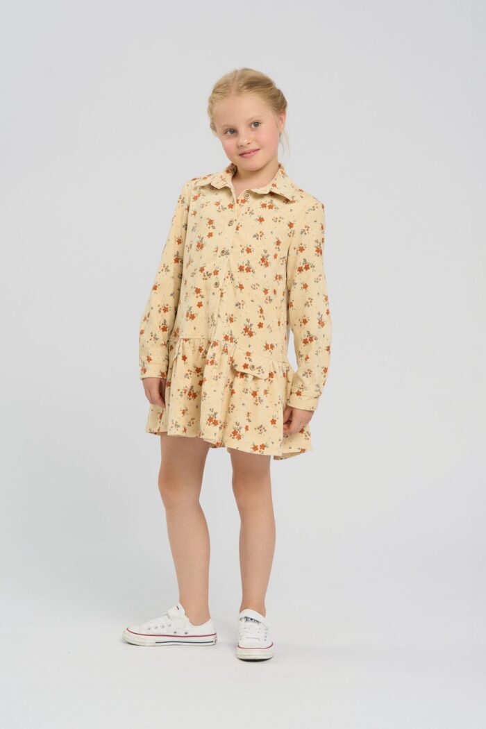 Micro velvet dress is made in beige shade and decorated with floral print. The model is made in an actual shirt cut, fastens with buttons. The bottom edge is decorated with a wide flounce, which creates an airy silhouette. The natural cotton lining is pleasant to the body, giving the child comfort even during active everyday wear. The micro velvet fabric has a beautiful texture, which additionally decorates the design.