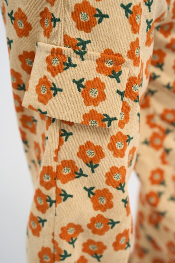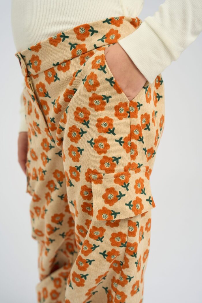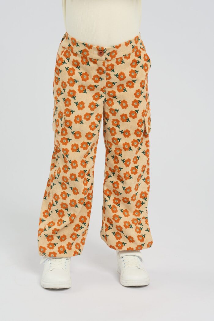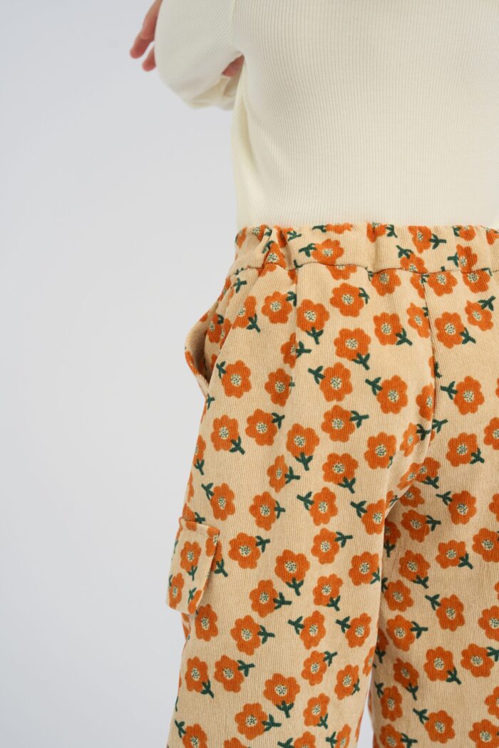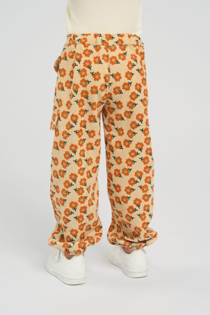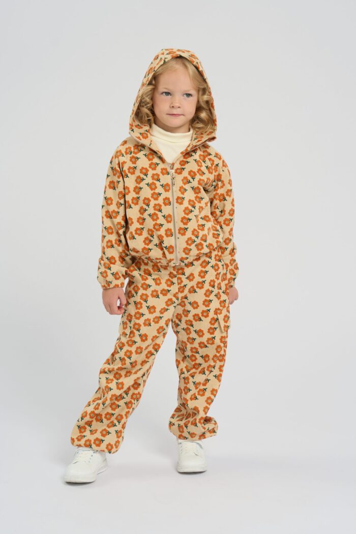 Fashionable pants made of sand-colored micro velvet are decorated with a bright floral print. The model of comfortable loose silhouette does not restrain movements. The waistband with a button fastener has an elastic insert, therefore the child is provided with a comfortable fit of the pants on the figure. There are pockets on the sides and fake pockets on the pants. The pants will effectively complement any monochrome top.