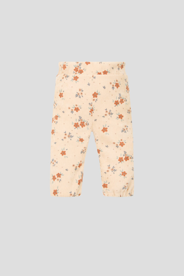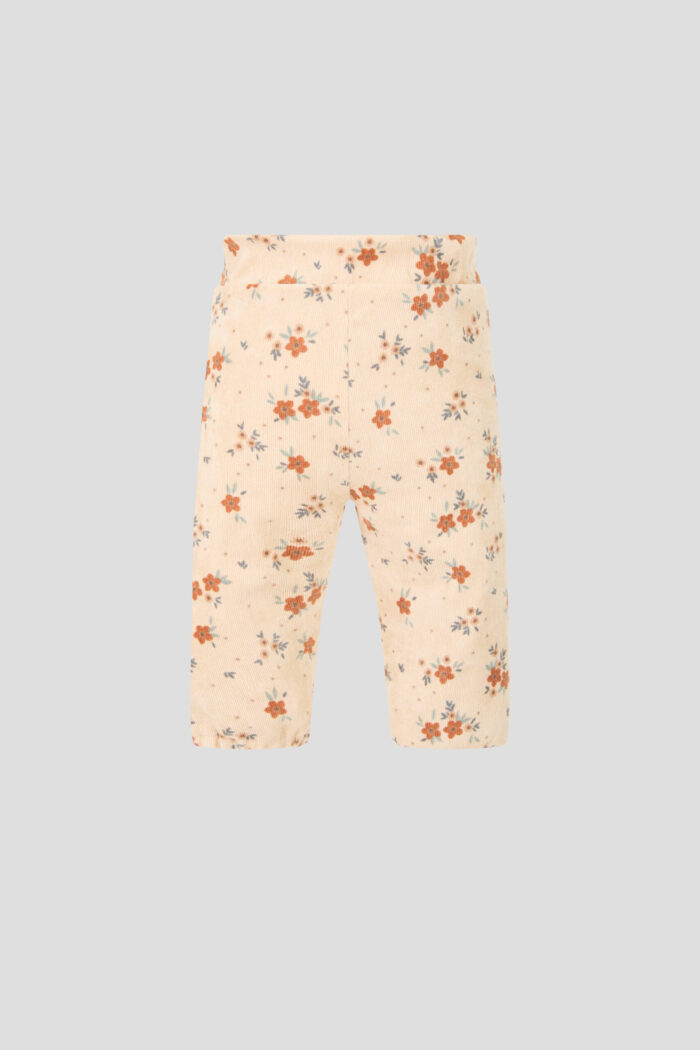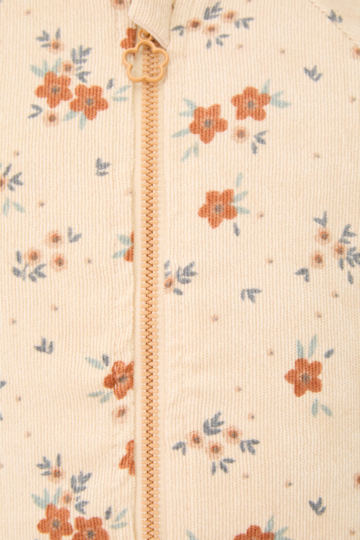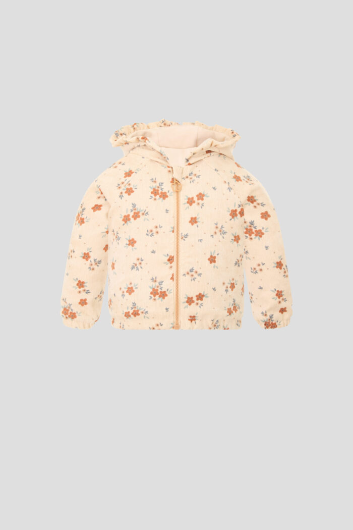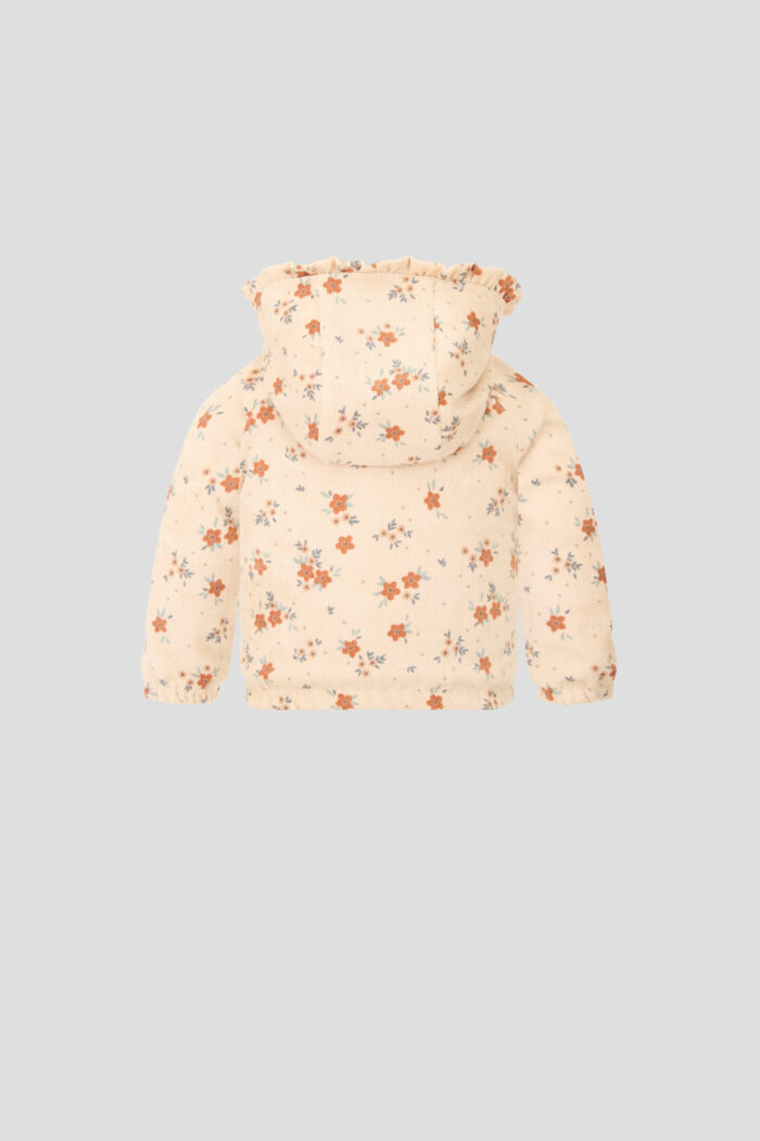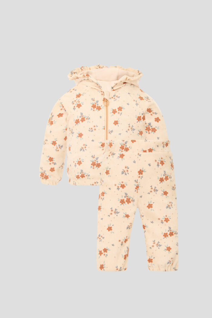 Children’s suit includes a jacket and a pants made of micro velvet in a pleasant creamy shade. The design is decorated with a charming floral pattern. The jacket with a zip fastening is complemented by a deep hood. The raglan sleeves are comfortable to wear and do not restrict movements. Wide elasticated waistband and cuffs are responsible for the comfort of the pants. The use of natural cotton in the lining of the suit makes the model suitable for sensitive children’s skin.