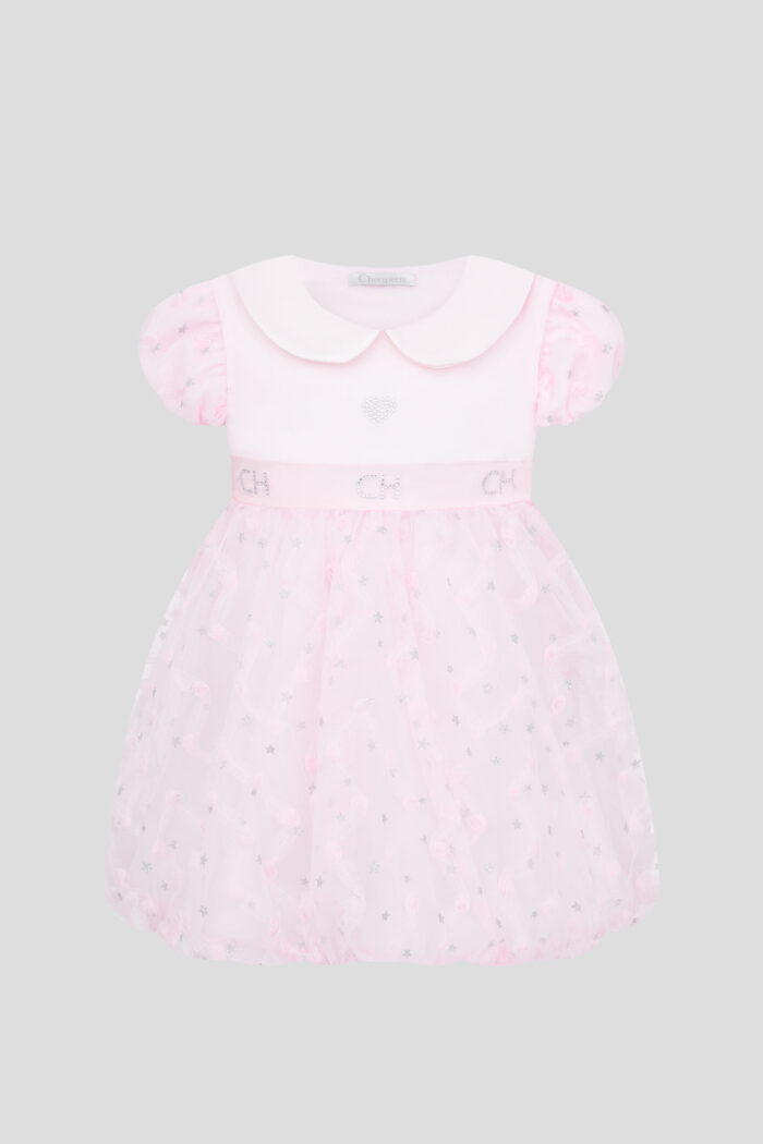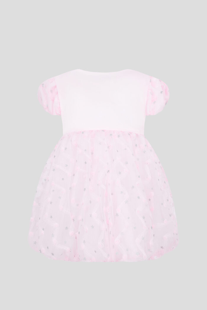 Ein hübsches einfarbiges Kleid in warmem Weiß für ein Mädchen, das ein bezauberndes Bild einer kleinen Prinzessin abgibt. Das Modell ist an der Taille abgeschnitten und hat einen Rundhalsausschnitt. Die Puffärmel und der doppellagige Rock sind mit aufgestickten Libellen verziert, die zum Stoff passen. Eine elegante Stickerei findet sich auch in der Mitte des Mieders. Die Taille wird durch einen eleganten Gürtel mit einem zartrosa Muster akzentuiert.