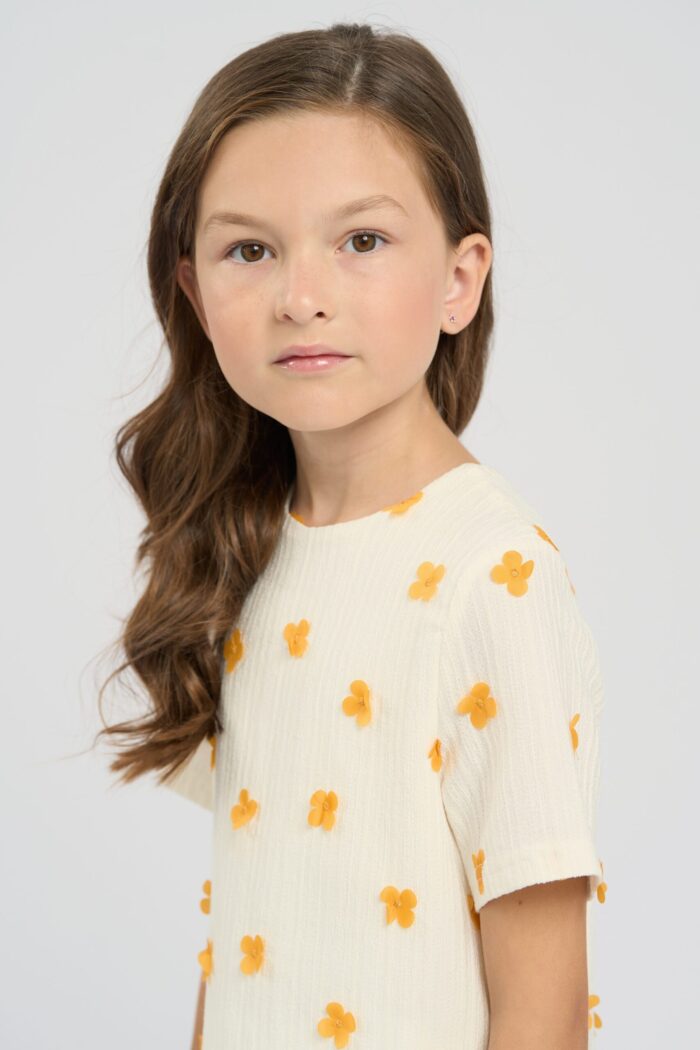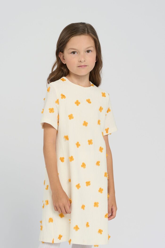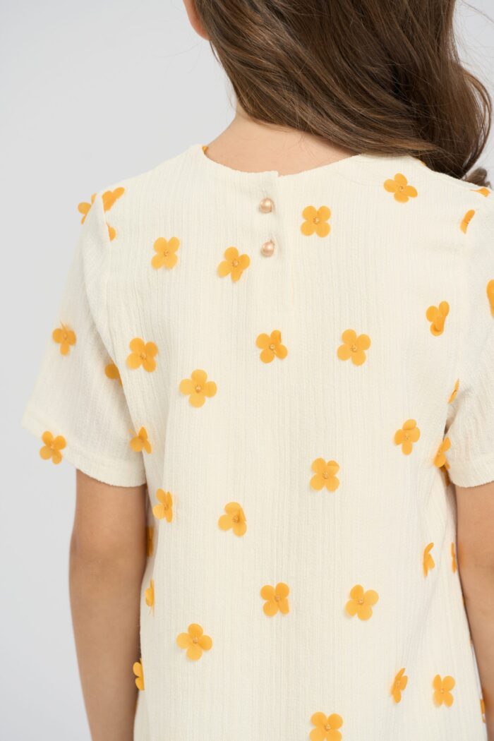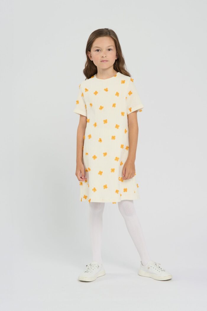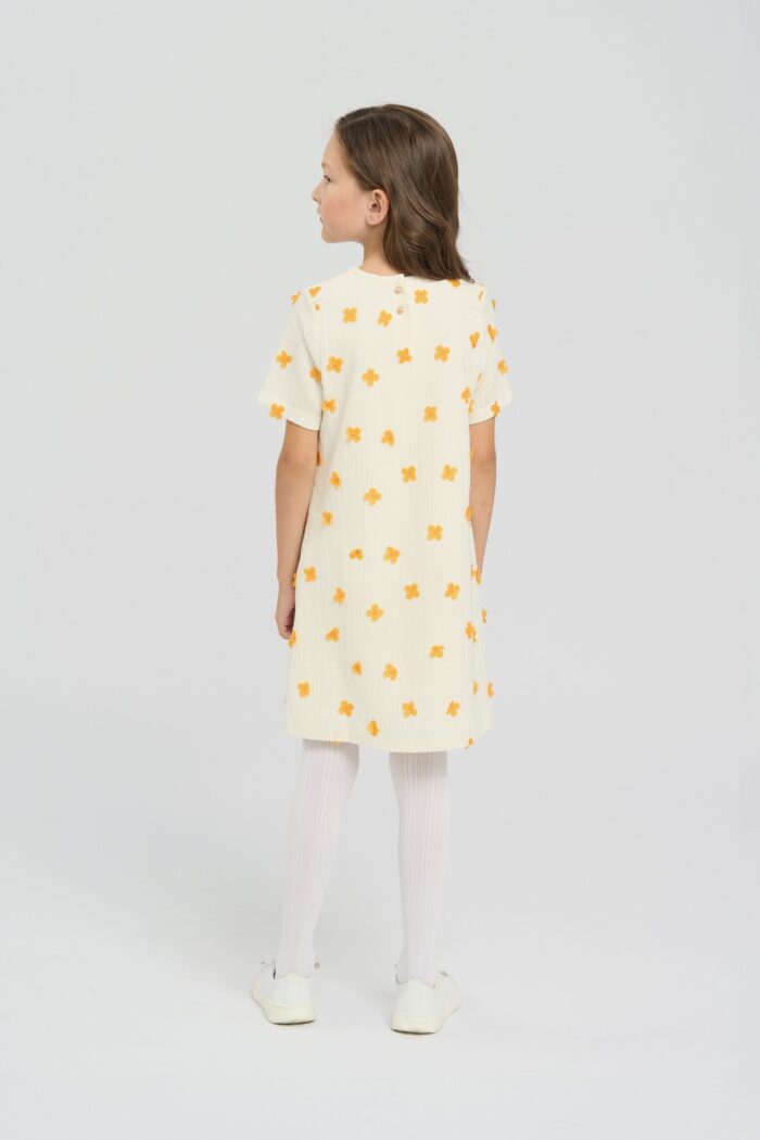 Charming children’s dress made of organza of exquisite ecru colour decorated with voluminous yellow flowers. The model of comfortable silhouette does not restrain movement. The dress has a round neckline and short sleeves. Viscose lining guarantees comfort for the girl. The dress fastens on the back with two neat buttons.