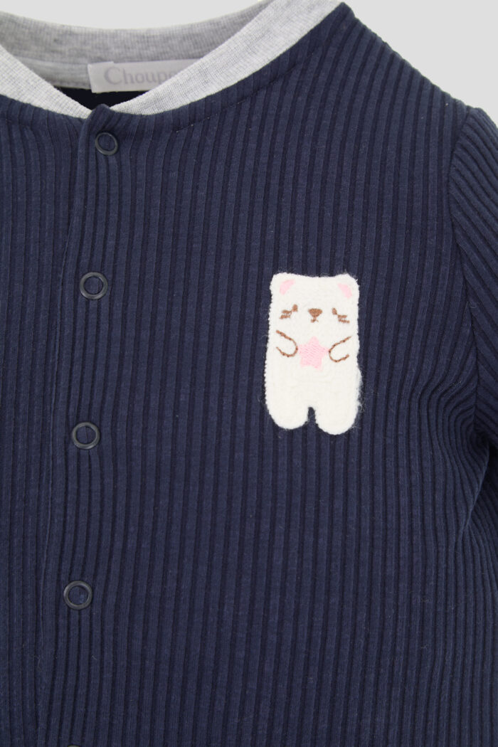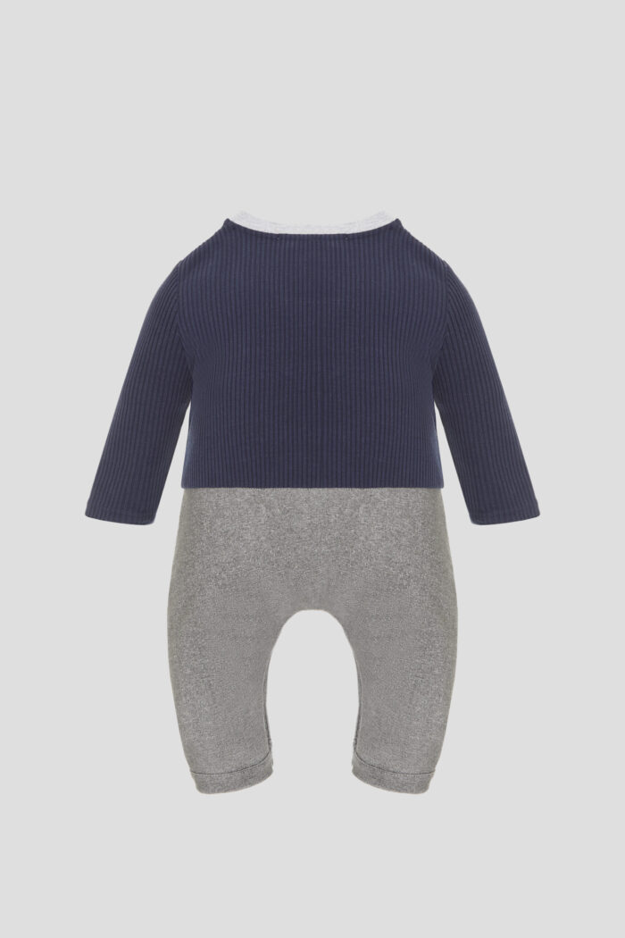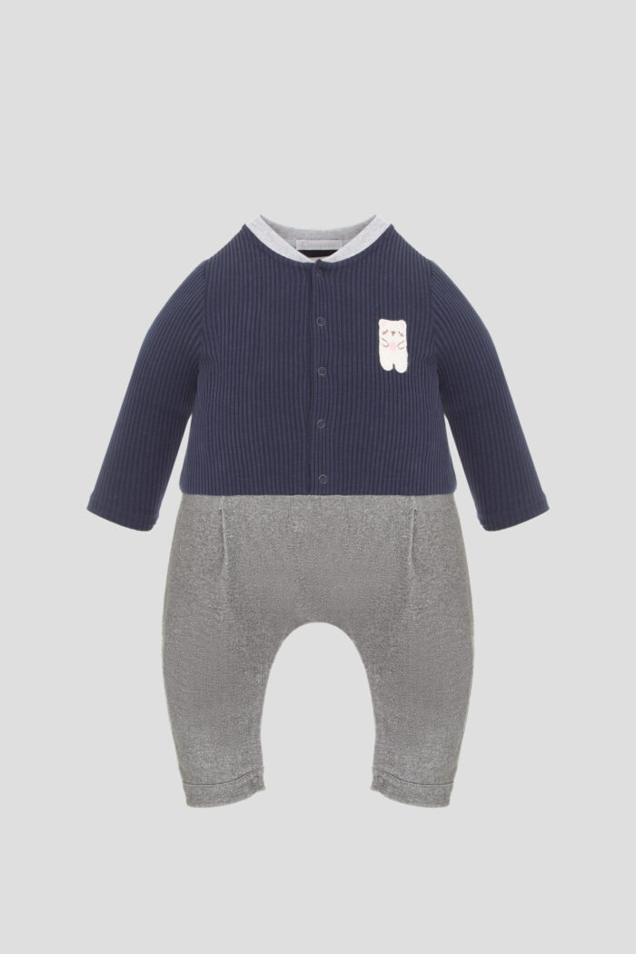 Overalls made of combined fabrics for a baby boy. The top of the model is made of blue knit fabric with a „noodle“ texture. There is a decor in the form of an adorable teddy bear. Button fastening is located on top of the overalls and on the legs. The model is made of natural breathable cotton for comfort. The item is perfect for babies thanks to its natural materials and loose fit. The overalls will be a great choice for cool weather outings or for home use.