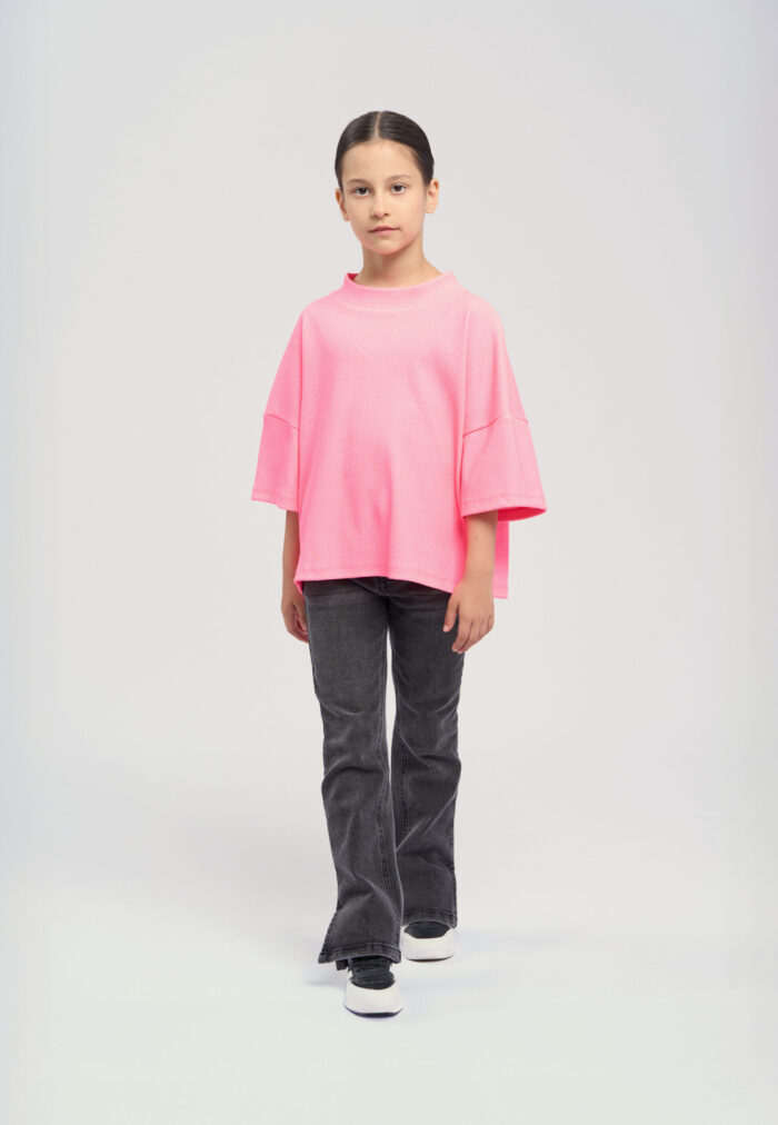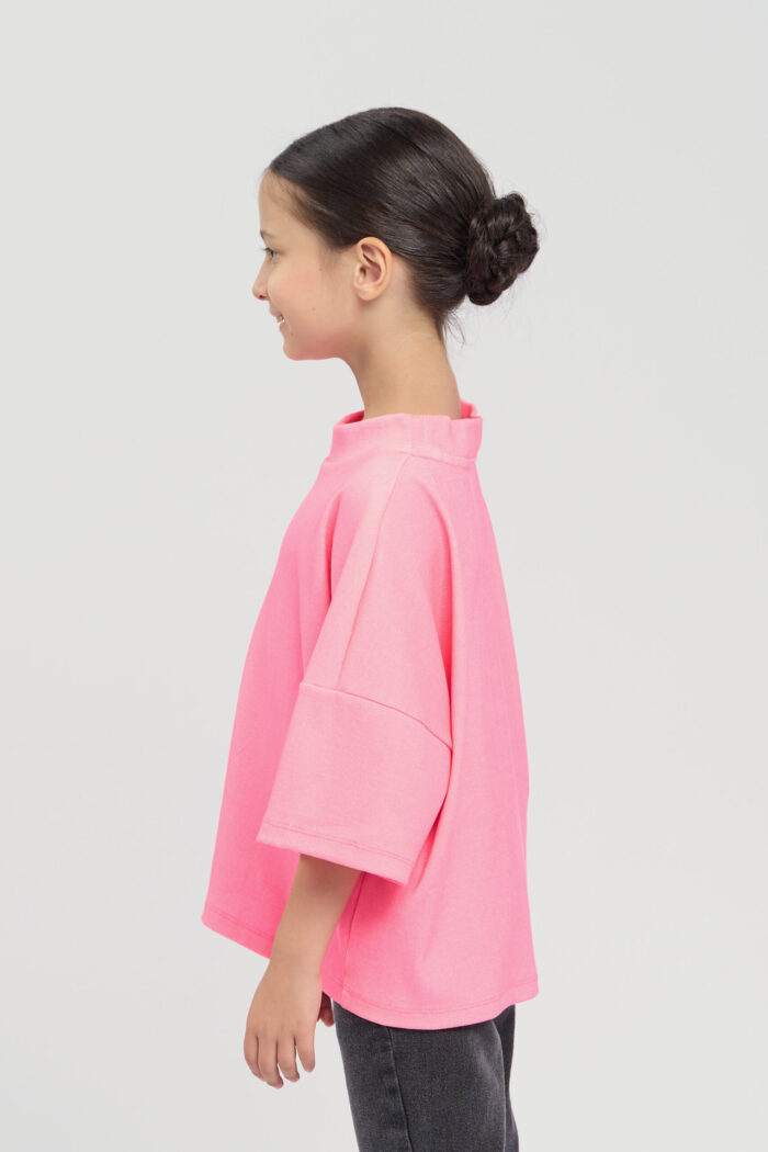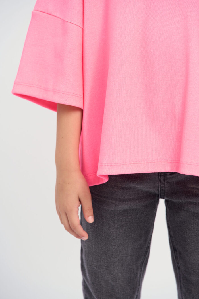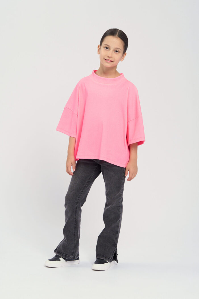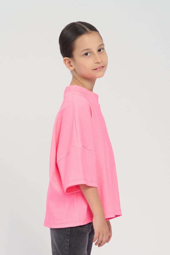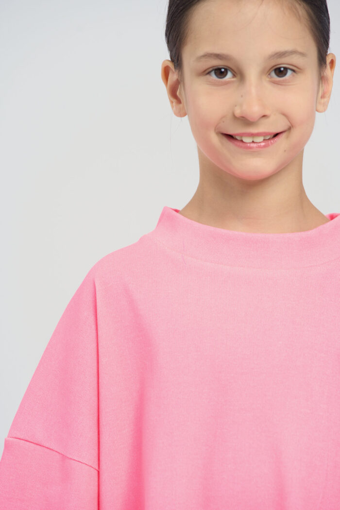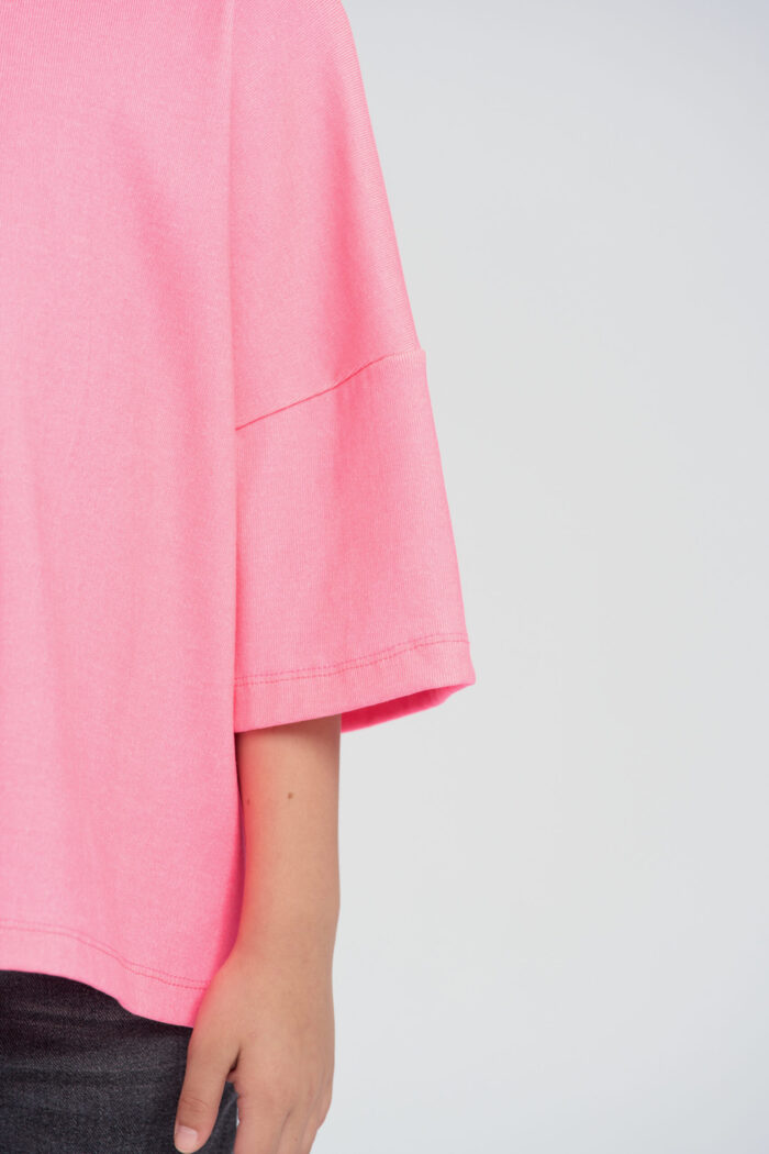Pink coloured oversized T-shirt for girls is made of natural cotton is the perfect combination of style and comfort. The wide neckline gives the model a casual and relaxed look. The dropped shoulder line and wide sleeves make the silhouette more expressive. Natural cotton provides softness, breathability and comfort. The pink colour adds freshness and brightness to the look.