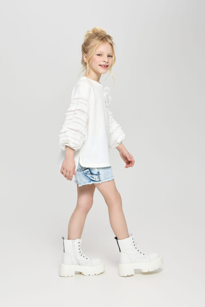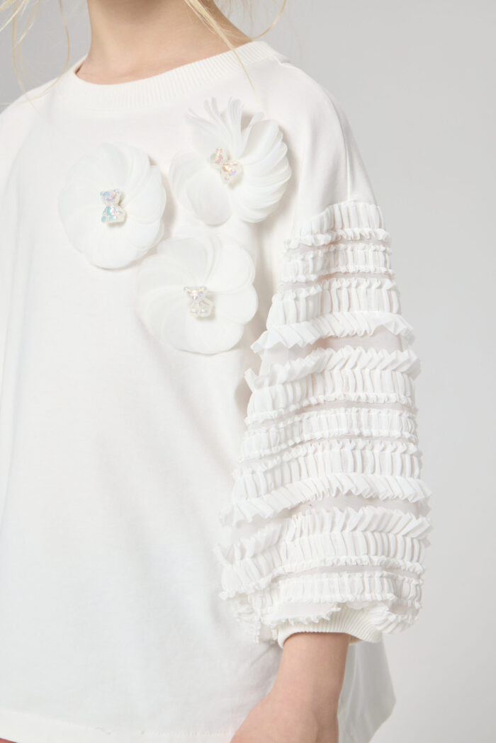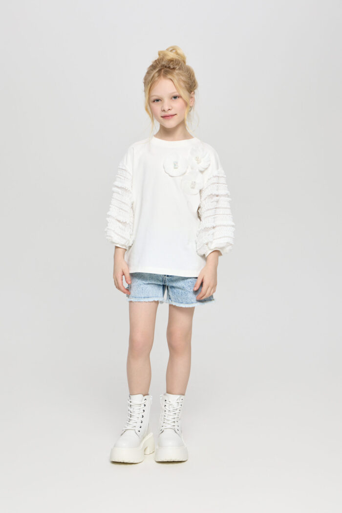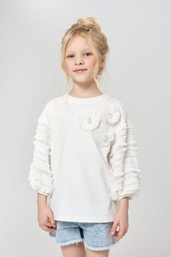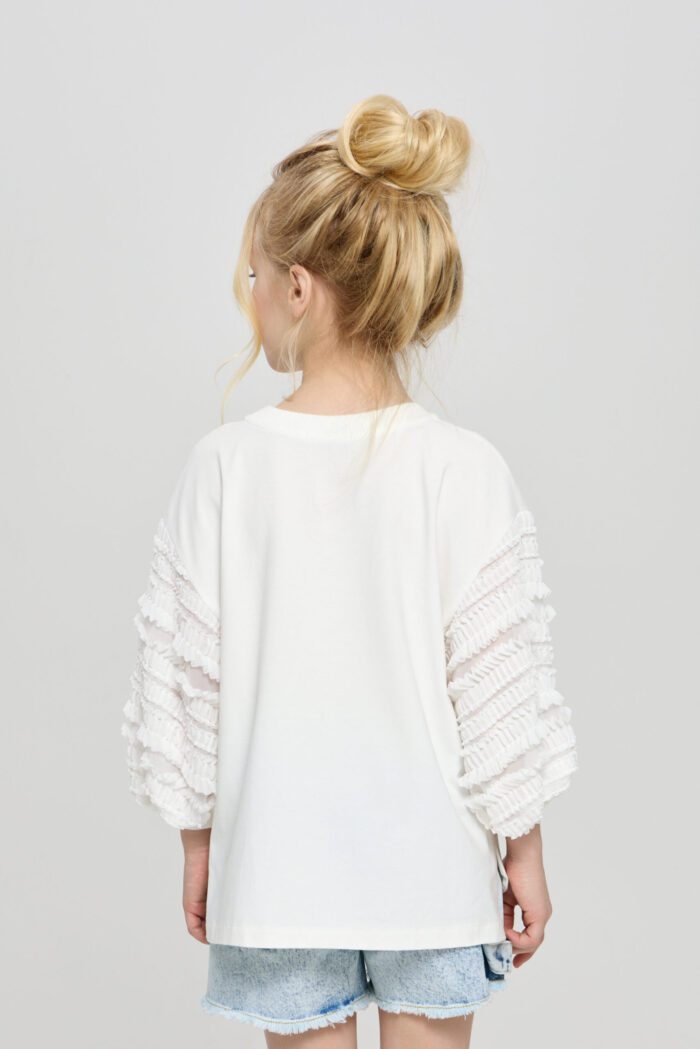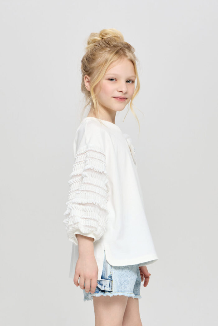 White long sleeve T-shirt for girls adorned with spectacular decoration is perfect for creating stylish looks. The free fit model with low shoulder line and long back looks very stylish and modern. The voluminous sleeves and designer decor attract attention. The versatile model is ideal for everyday use as well as for holidays. The long sleeve T-shirt can be perfectly combined with jeans, leggings, shorts or skirts.