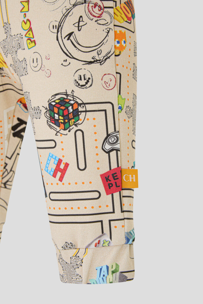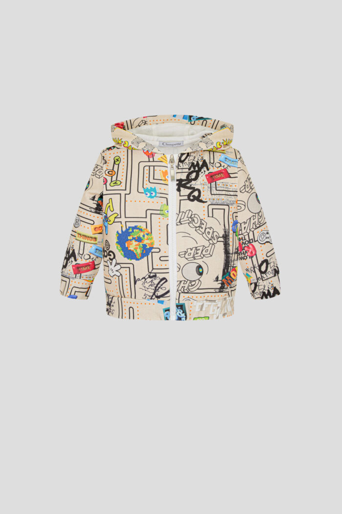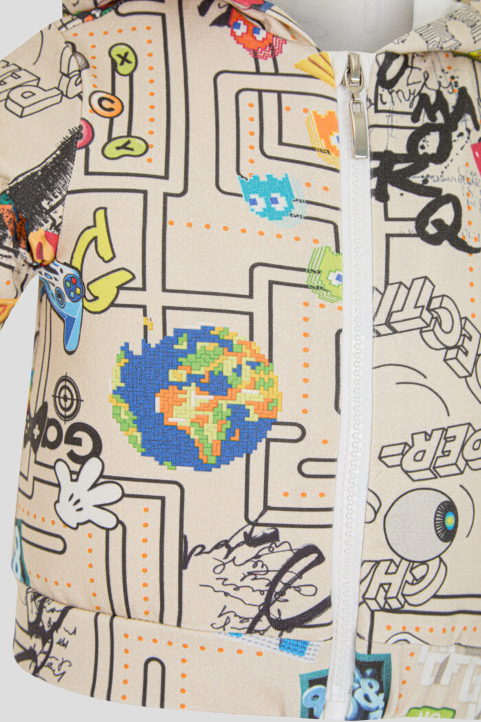 Printed knitted suit consisting of a bomber and pants, ideal for active baby boys. The hood on the bomber adds extra comfort. The bomber has a zip fastening, making it easy to use. The pants have a comfortable elasticated waistband, which ensures a good fit and comfort during wear. The set is easy to wash and dries quickly, making it a practical choice for parents.