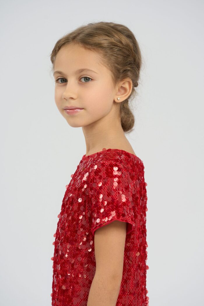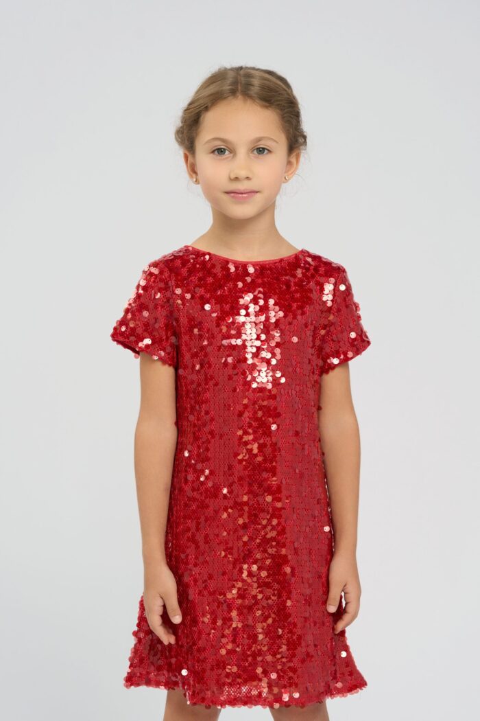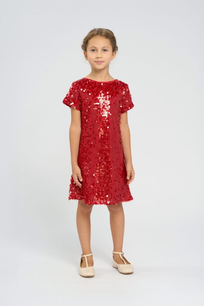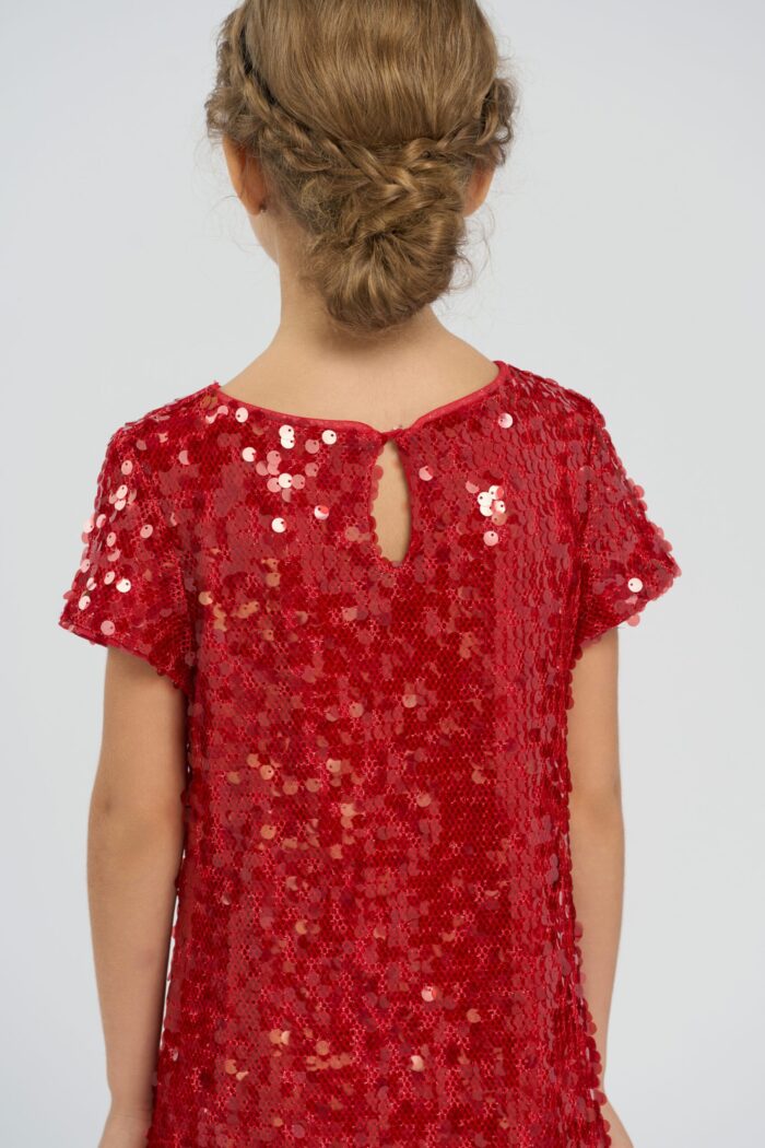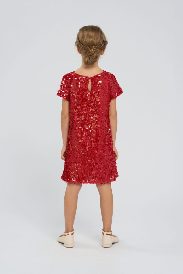 This spectacular red dress made of glittering sequins will become a real decoration of any celebration! Laconic design emphasises the elegance and style of the model. The round neckline adds tenderness to the look. Comfortable length of the dress allows you to move and play freely, without limiting the activity of the little fashionista. The button fastening at the back provides ease in putting on the dress. Bright red colour and sparkling sequins make this outfit festive, attracting attention to the girl. This dress will be a great choice for a birthday party or any other important event!