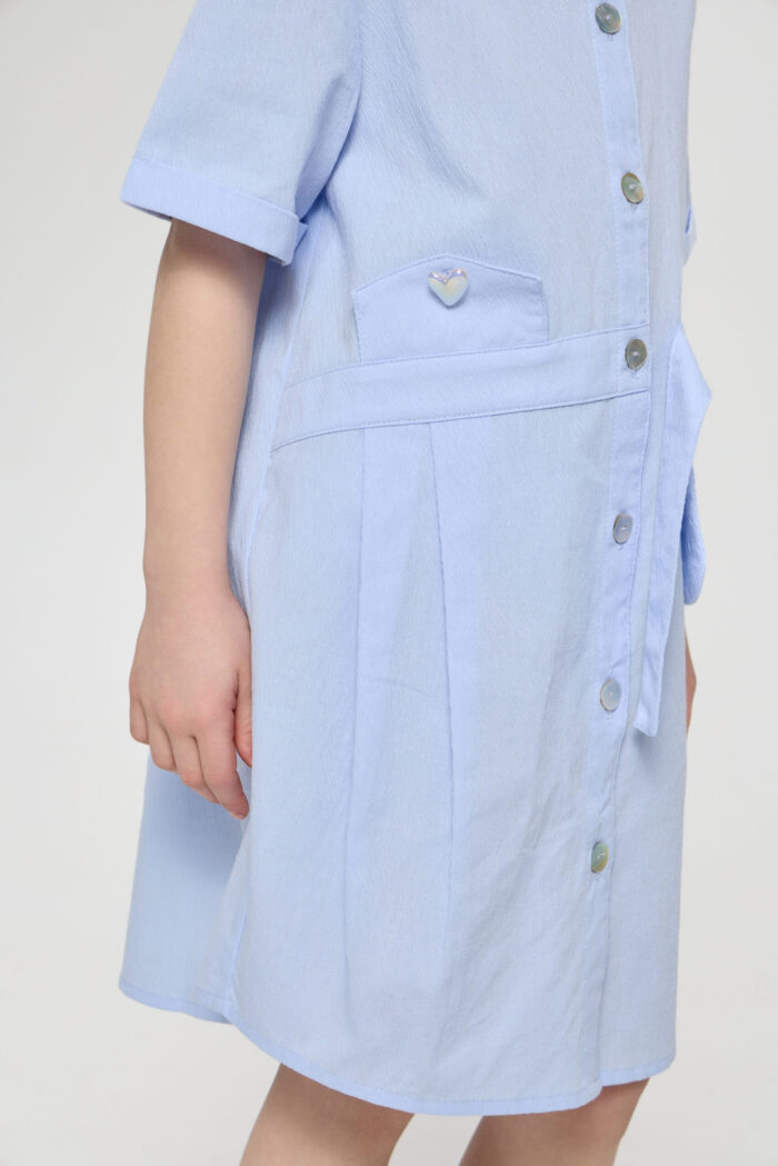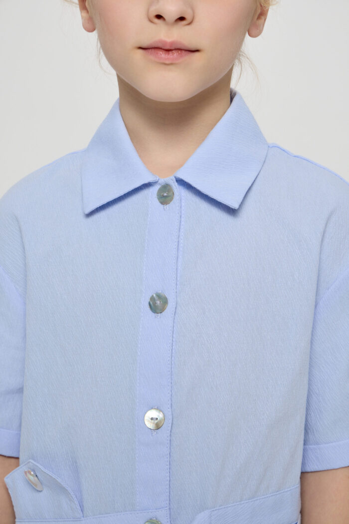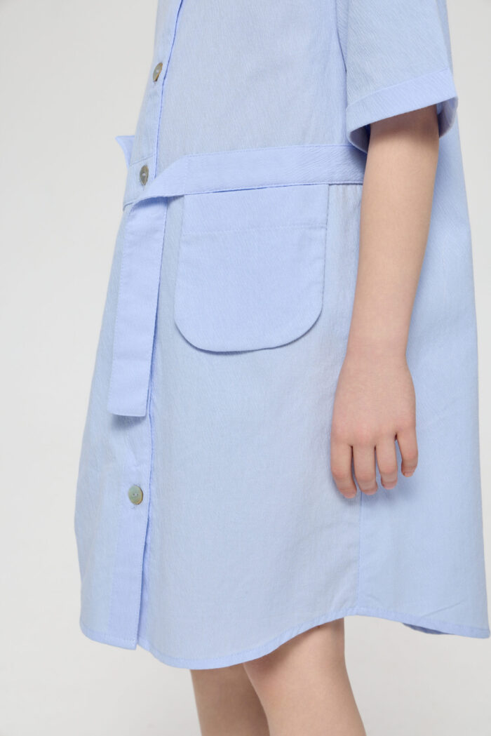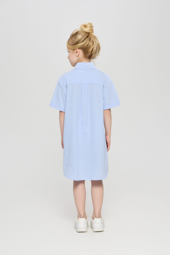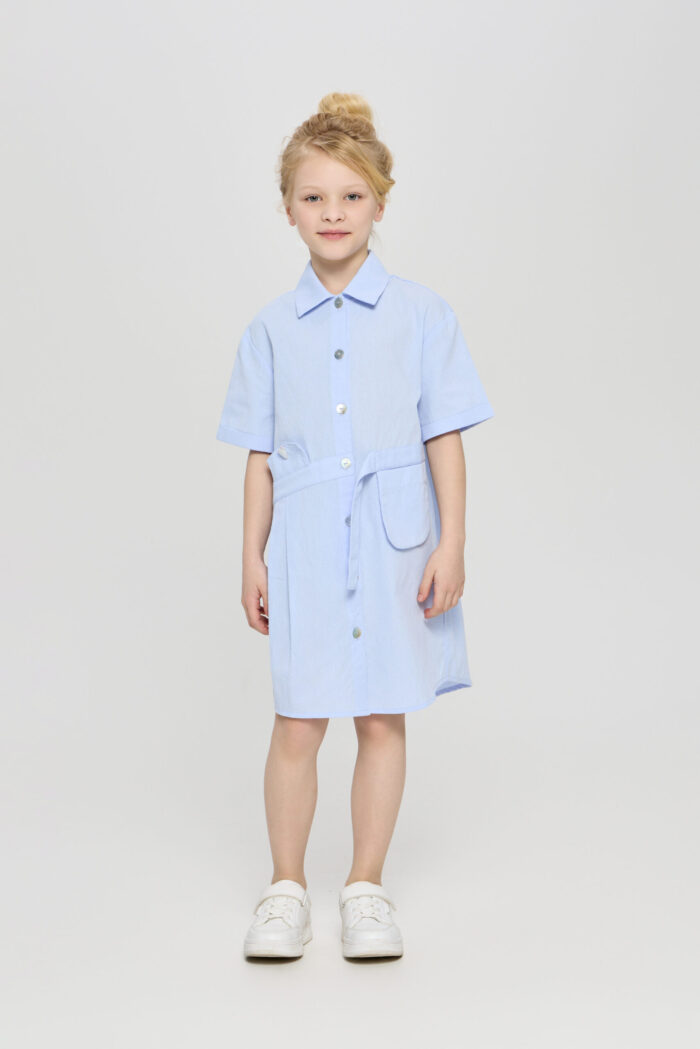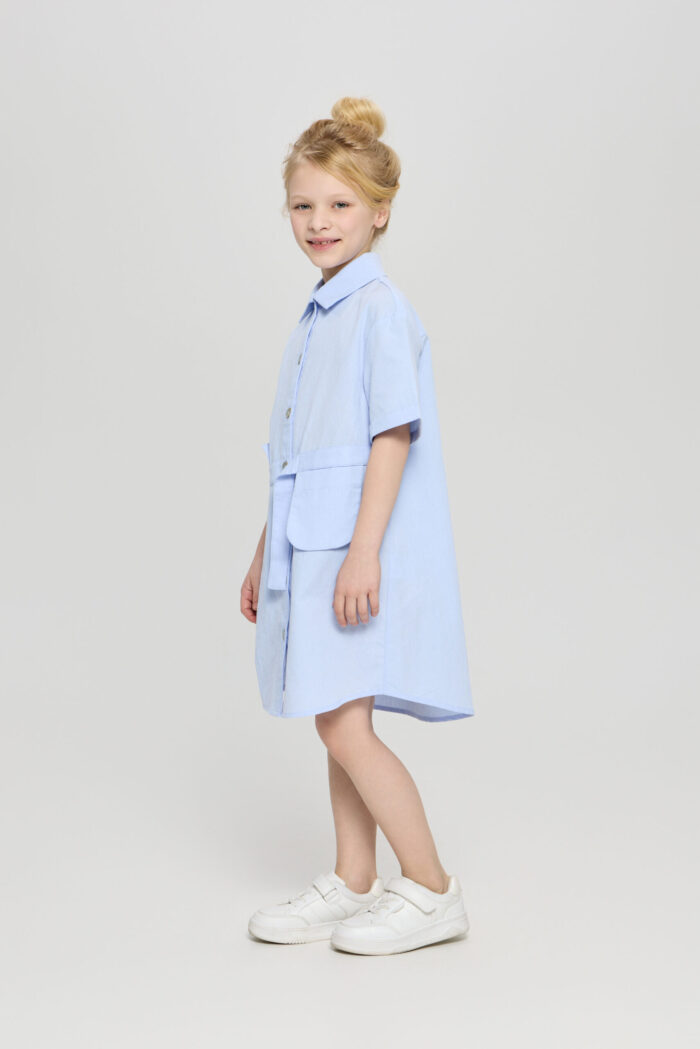 Every girl’s wardrobe must have a versatile dress. The shirt dress will be a perfect alternative for everyday look. This shirt-type model fastens with buttons along the entire length of the product. The bottom edge of the dress is rounded. The sleeves are three-quarter length. Original design accents such as the asymmetric waistband, patch and decorative plackets, classic collar make this dress a comfortable and relevant piece of clothing.