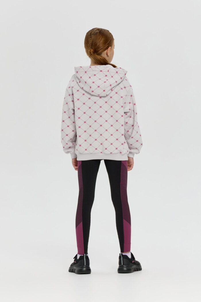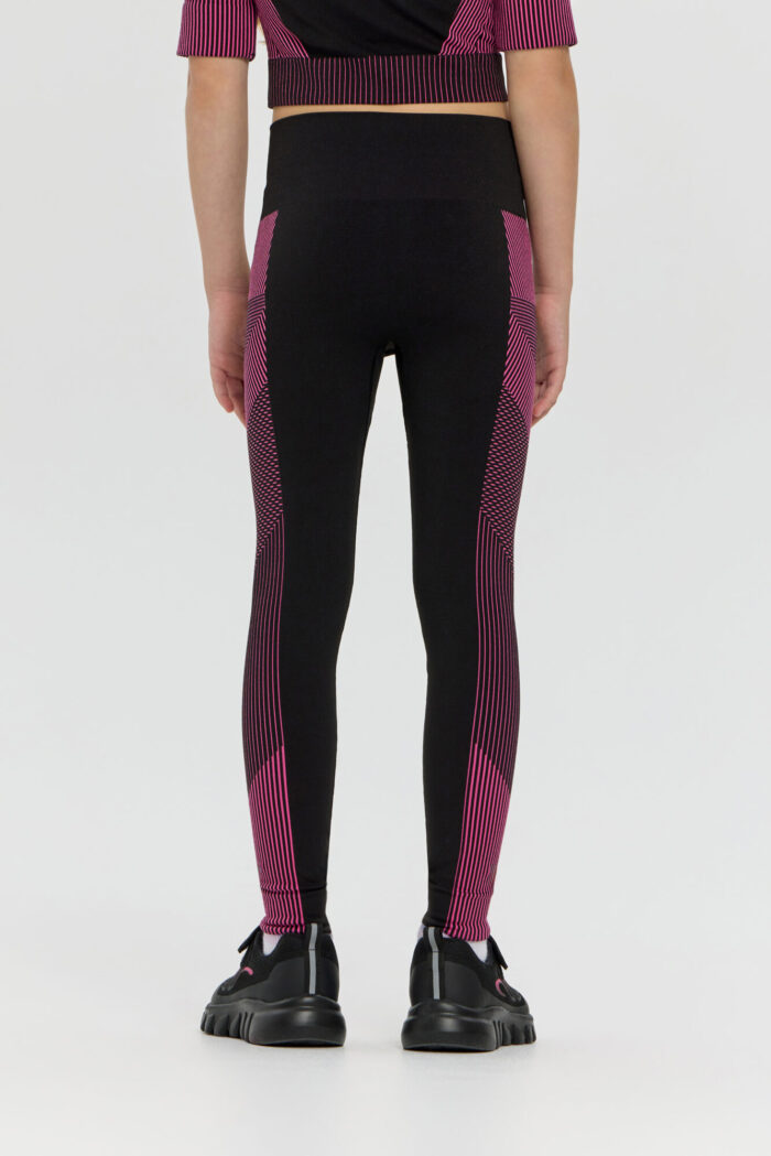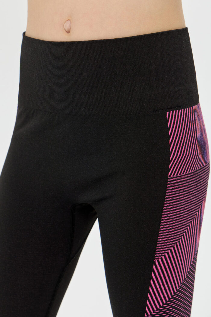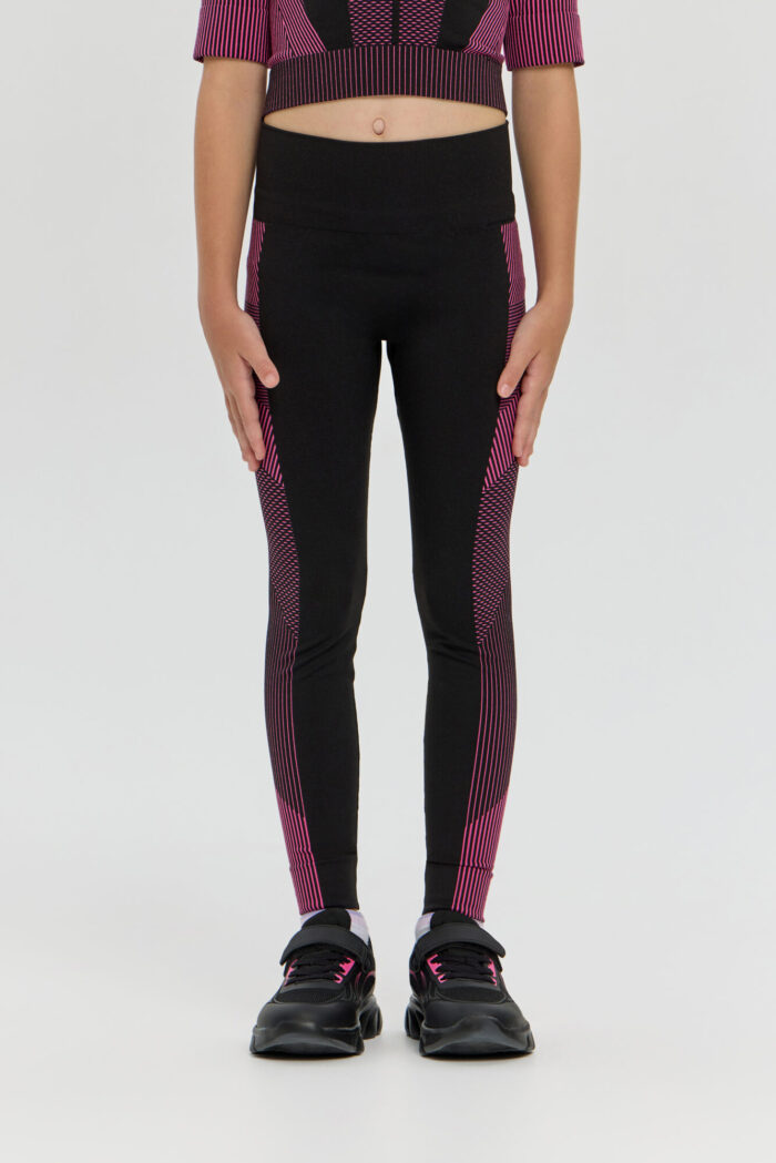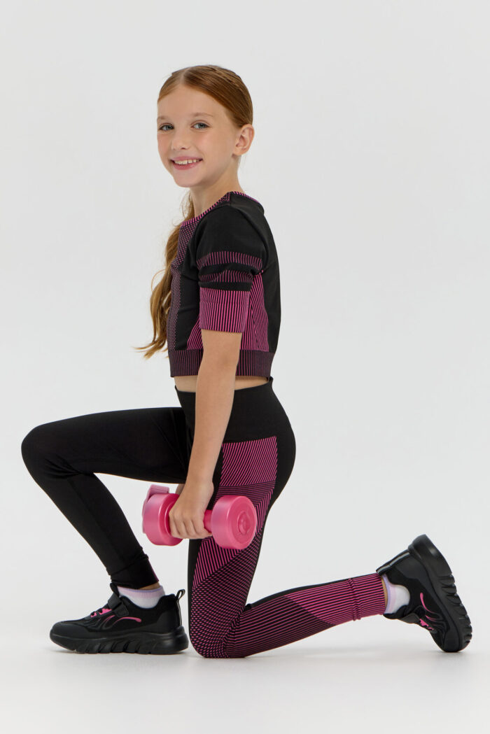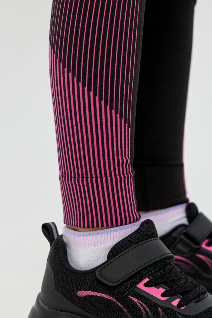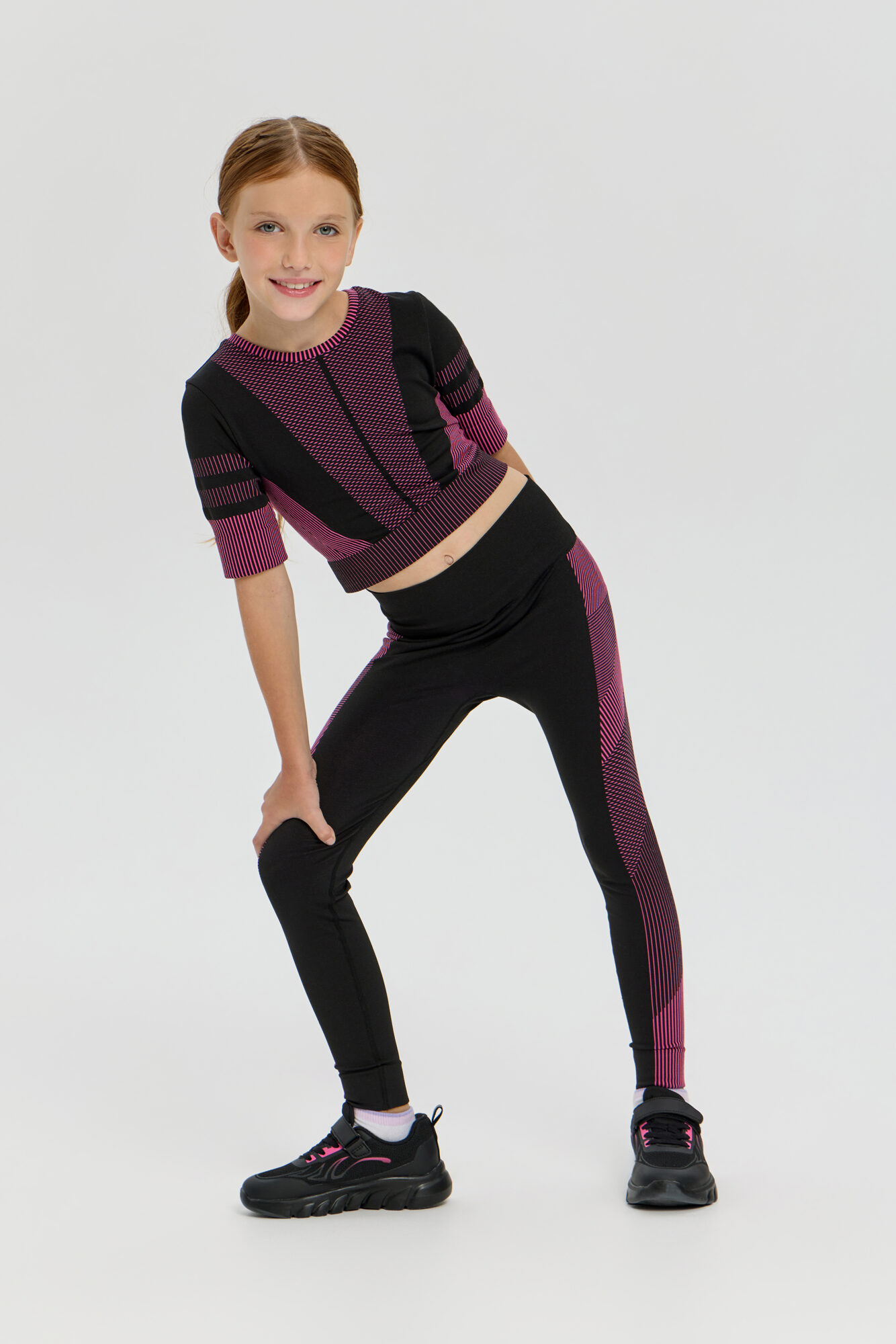 Black and pink sports leggings are an excellent and fashionable option for active girls. The elastic material with a high polyester and nylon content ensures a snug fit. Contrasting inserts visually elongate the silhouette and add dynamism to the look. Perfect for dancing, fitness training, yoga exercises and active plays.