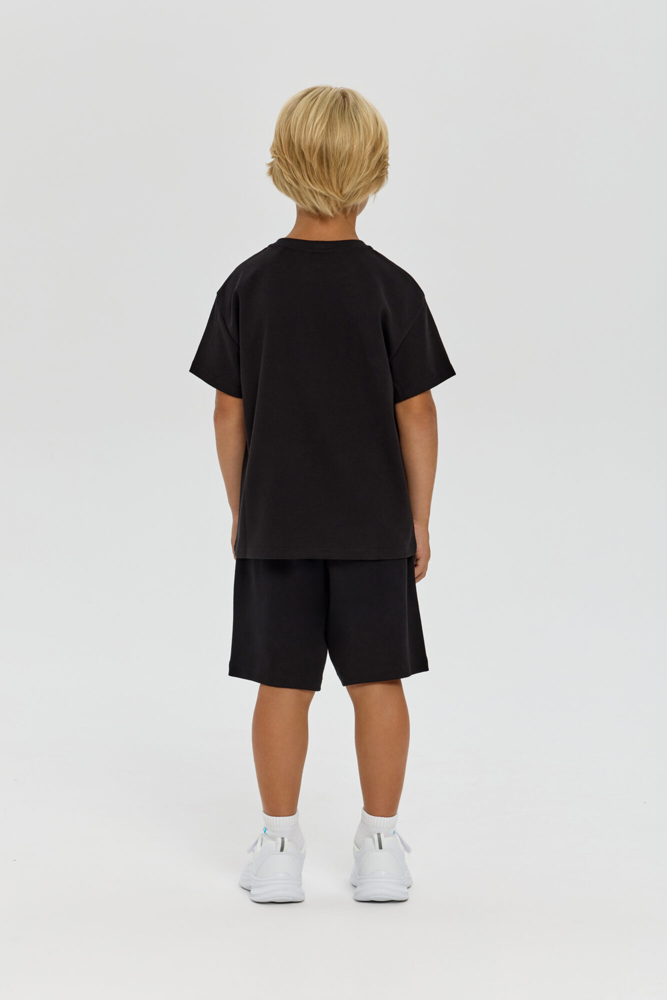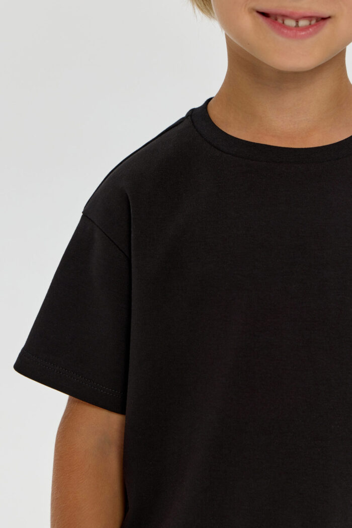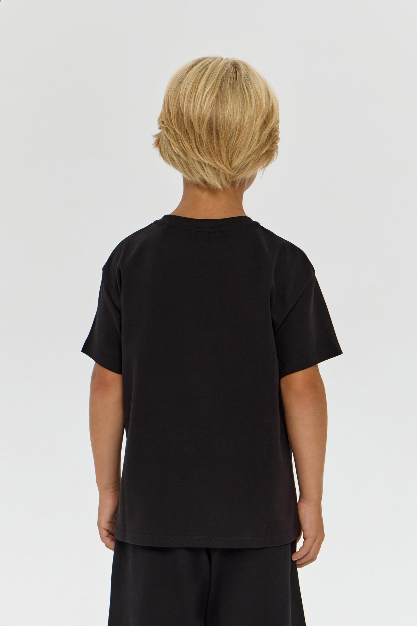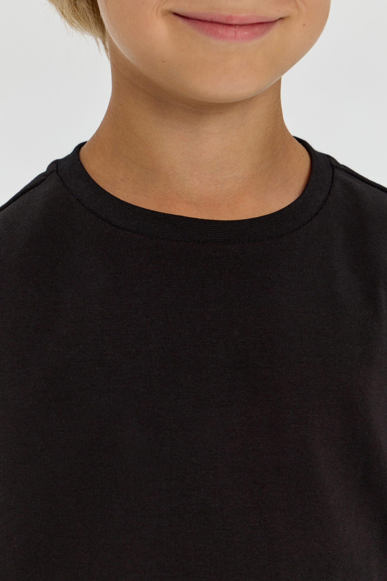 A black T-shirt is the basis of a sporty style for boys. The loose silhouette and simple design make this model versatile. The soft and elastic fabric ensures freedom of movement and retains its original shape. The T-shirt is perfect for both training and everyday wear. The neutral colour makes it easy to pair with any shorts or sports pants.