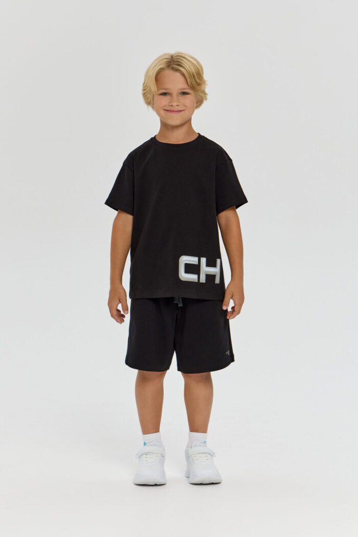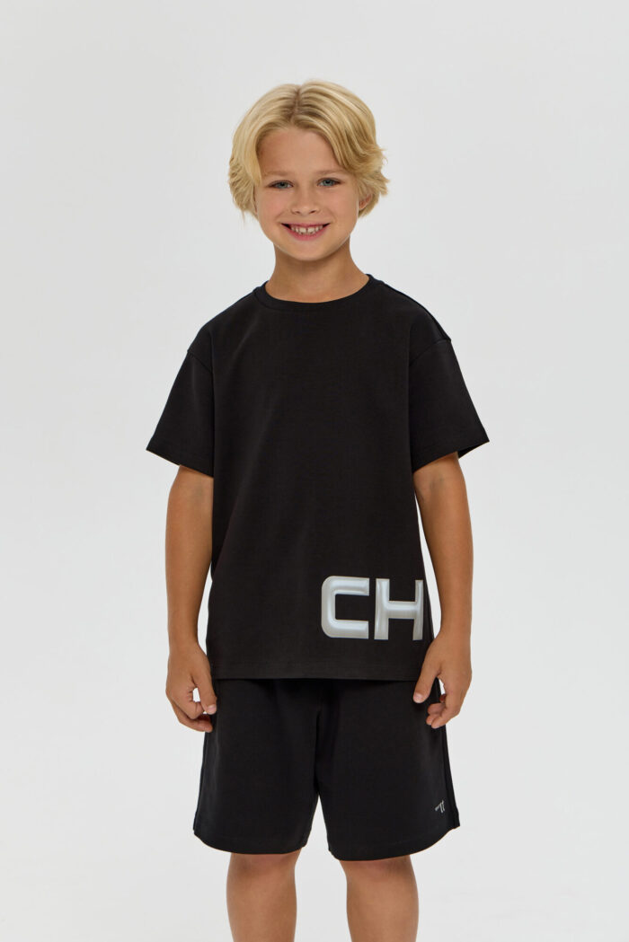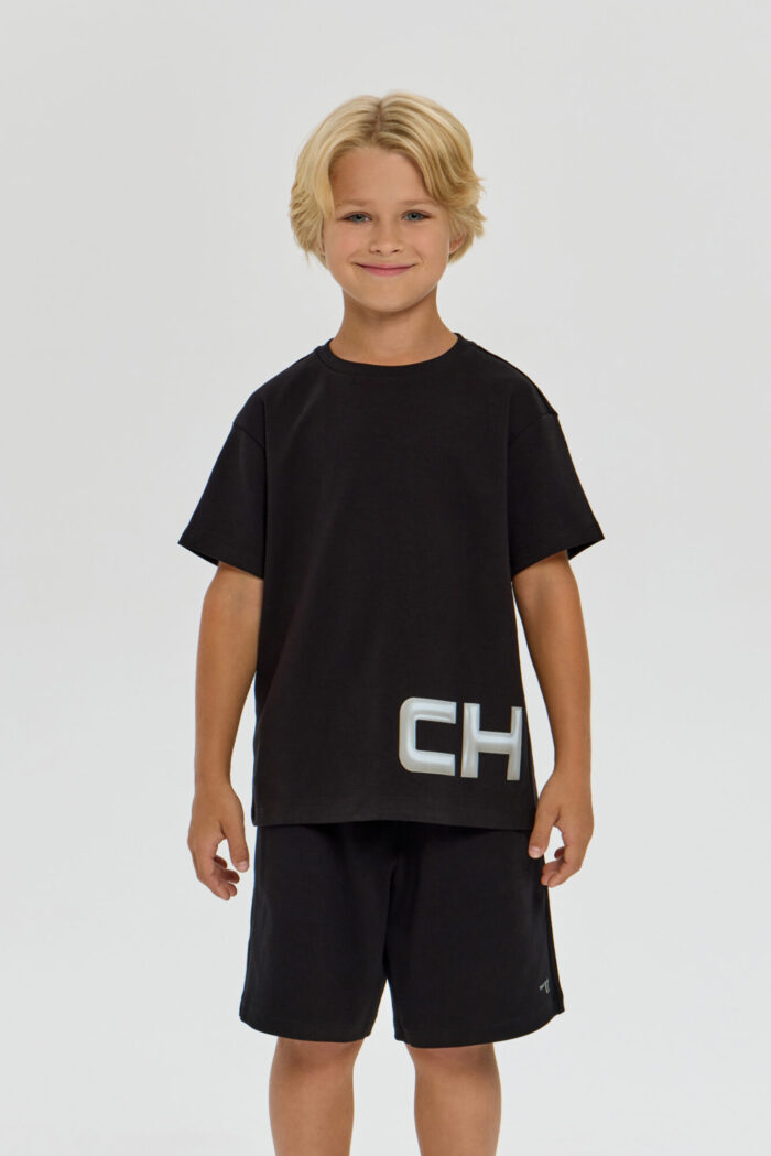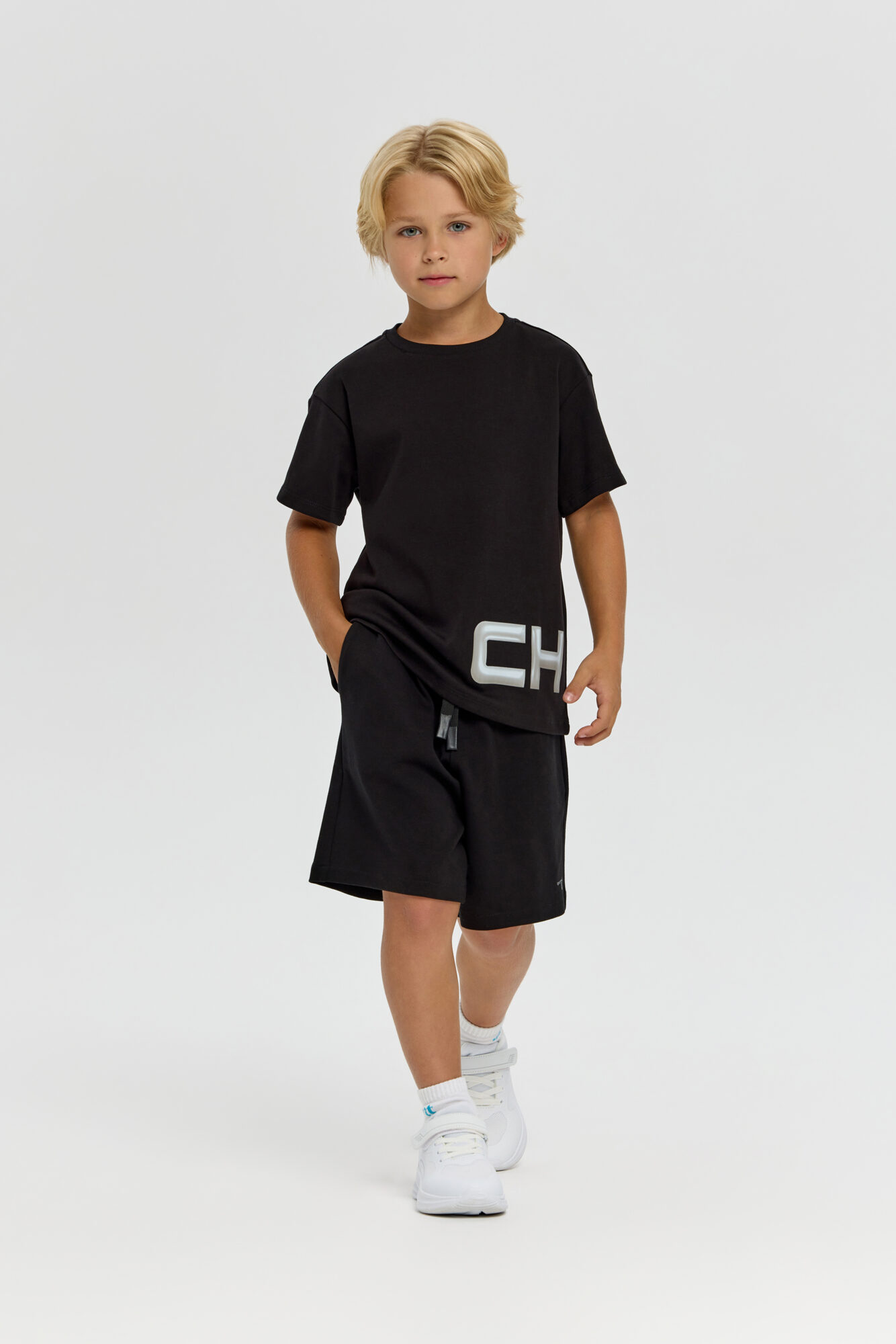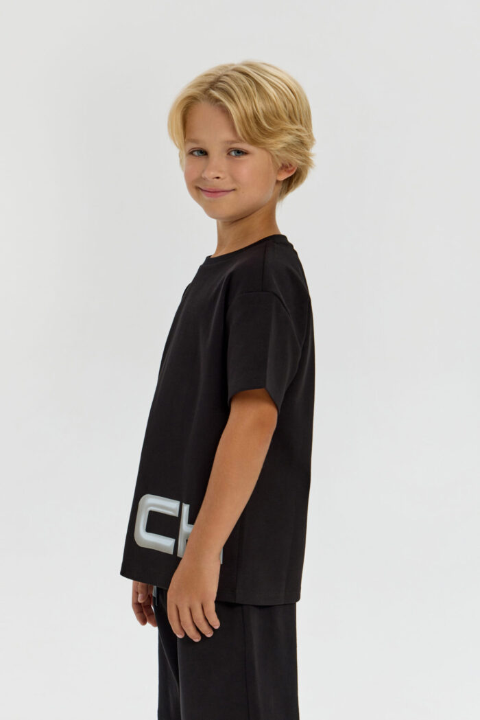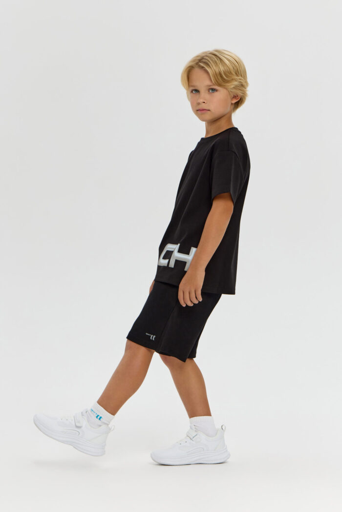 A black T-shirt is the basis of a sporty style for boys. The loose silhouette and simple design make this model versatile. The soft and elastic fabric ensures freedom of movement and retains its original shape. The T-shirt is perfect for both training and everyday wear. The neutral colour makes it easy to pair with any shorts or sports pants.
