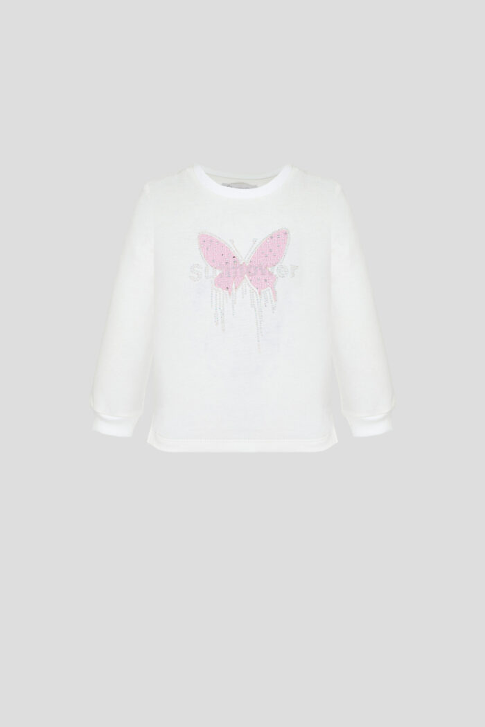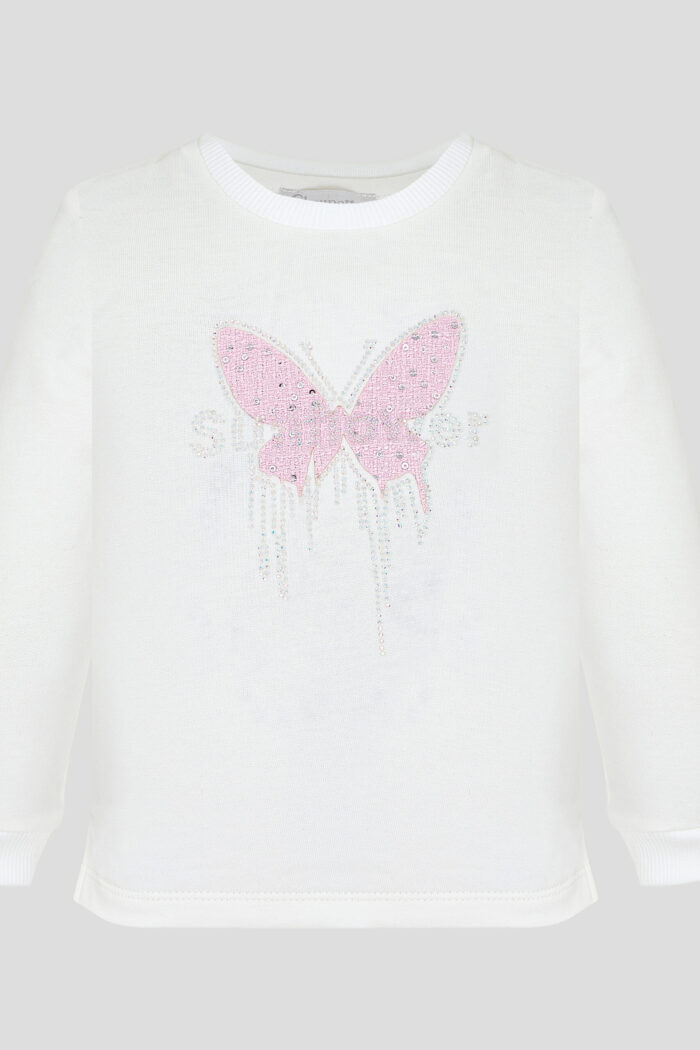 Stylish sweatshirt for girls is made in a delicate ecru colour, the model will become a vivid accent in the wardrobe. The model has a loose fit and long sleeves. Convenient slits on the sides and practical buttons on the shoulders facilitate the process of changing the child’s clothes. The sweatshirt is decorated with a colourful decoration in the form of a voluminous butterfly. The model can be easily combined with various items of clothing. Made of 100% cotton, the sweatshirt guarantees your child special comfort.