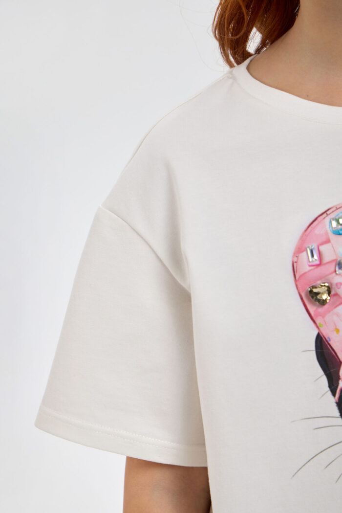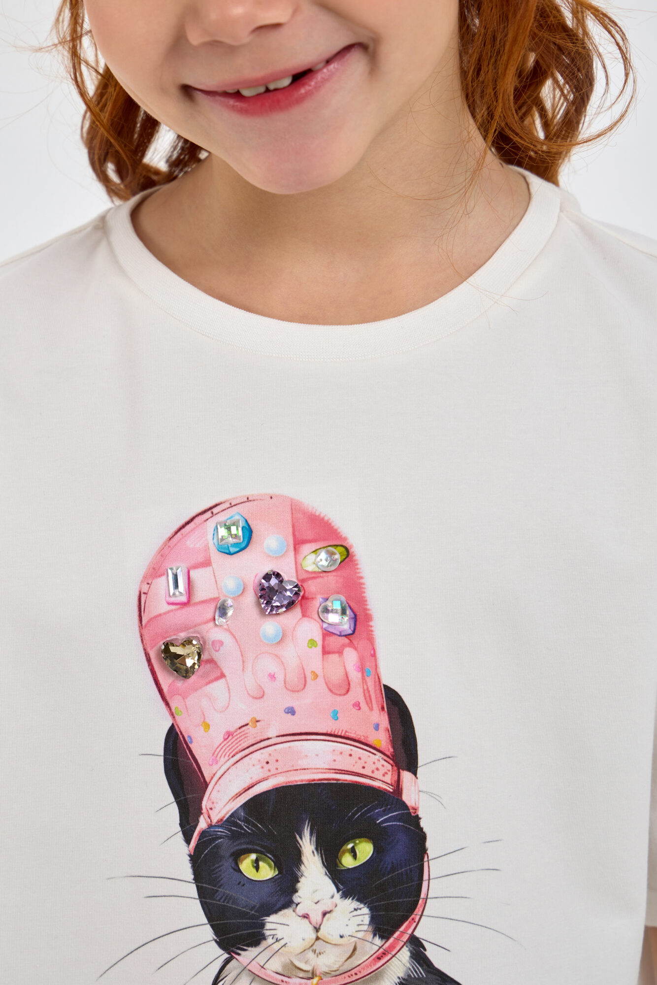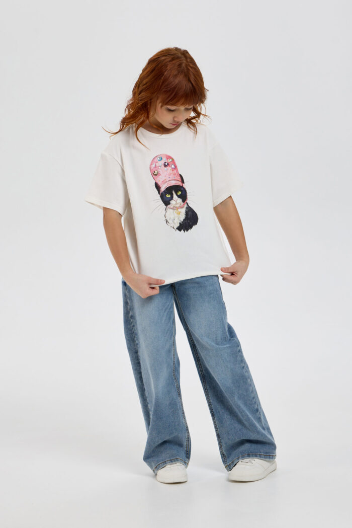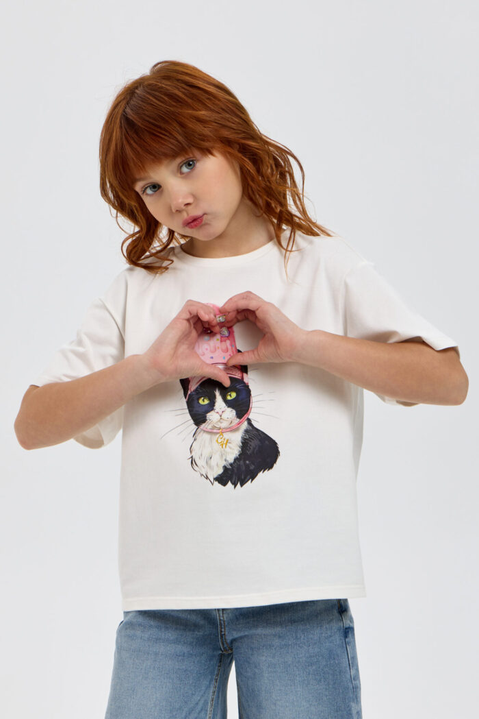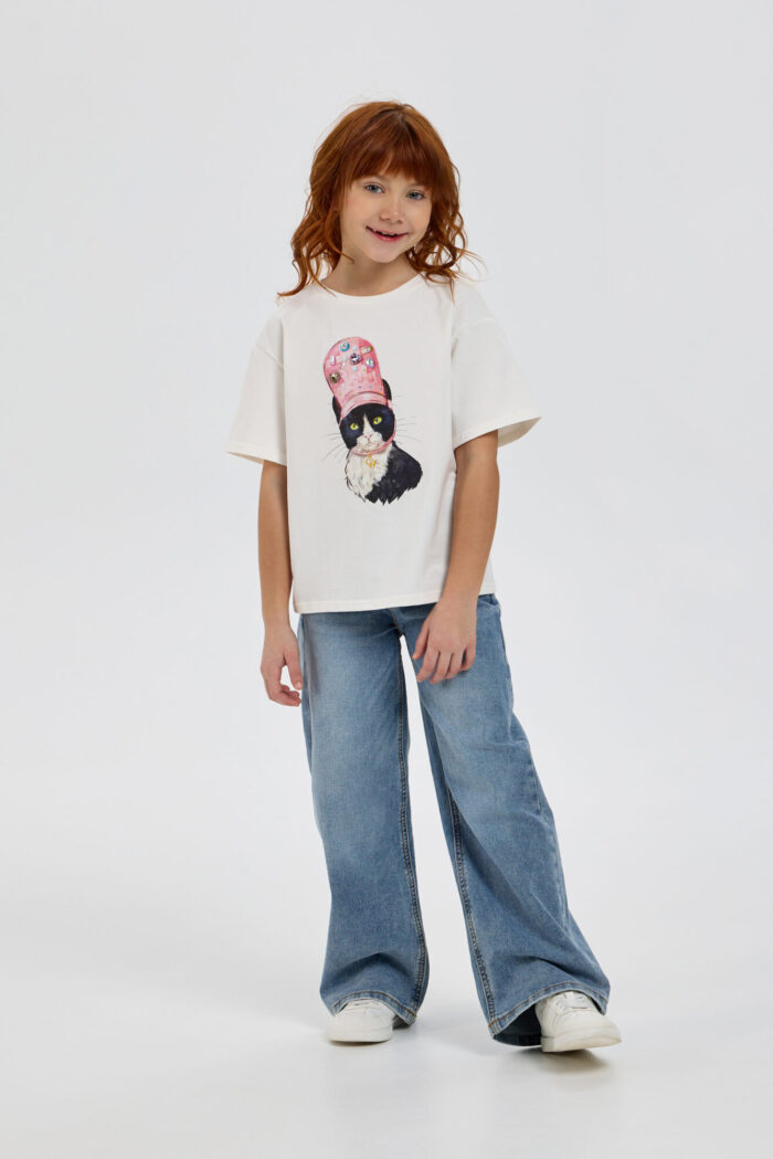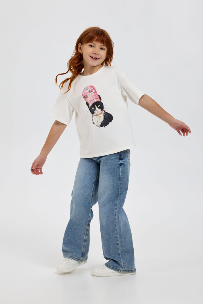 This stylish T-shirt for girls, featuring a designer print and a 3D appliqué, is a wonderful choice for creating trendy and vibrant everyday looks. It has a loose fit with slightly dropped shoulder seams. Thanks to the soft, breathable cotton fabric, your child will stay comfortable all day long: the material allows the skin to breathe and doesn’t cause any discomfort. The bright, vibrant print and 3D appliqué immediately catch the eye and highlight the young lady’s unique style. The T-shirt pairs perfectly with jeans, shorts, skirts, and leggings, creating a variety of fashionable outfits.