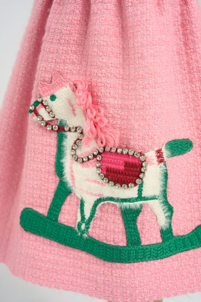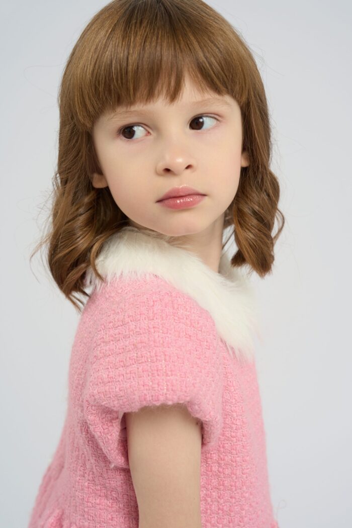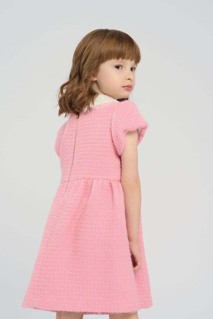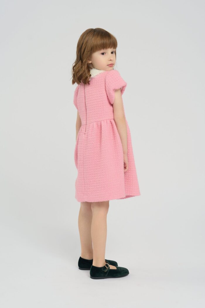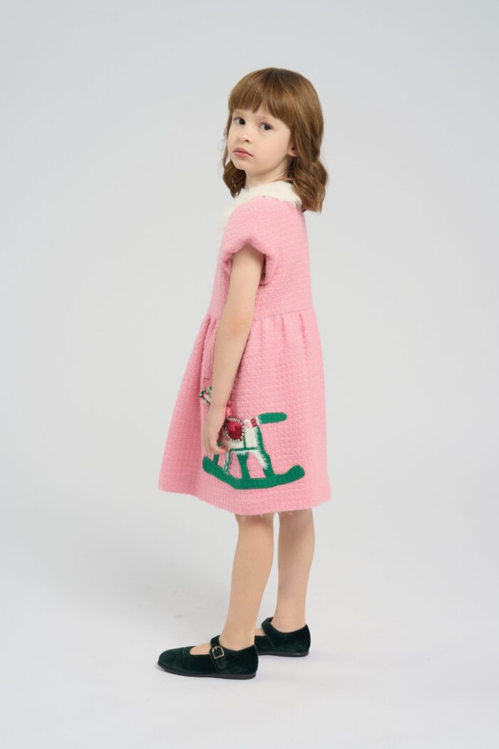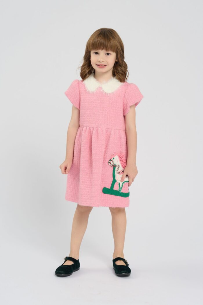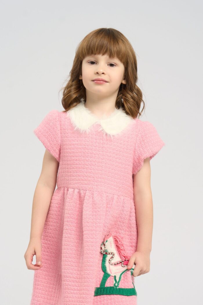 The dress in soft pink colour is the perfect choice for little fashionistas. The model is made of textured fabric. The main accent of the design is the applique in the form of a horse, which gives the outfit a playful and original look. The fluffy white collar adds elegance to the model. The dress for a girl is ideal for holidays, family events or just for walking. It has a lining made of natural cotton.