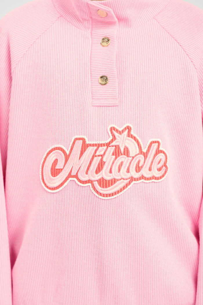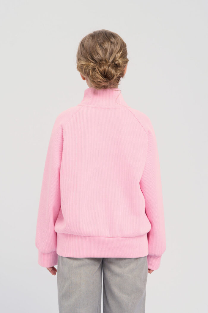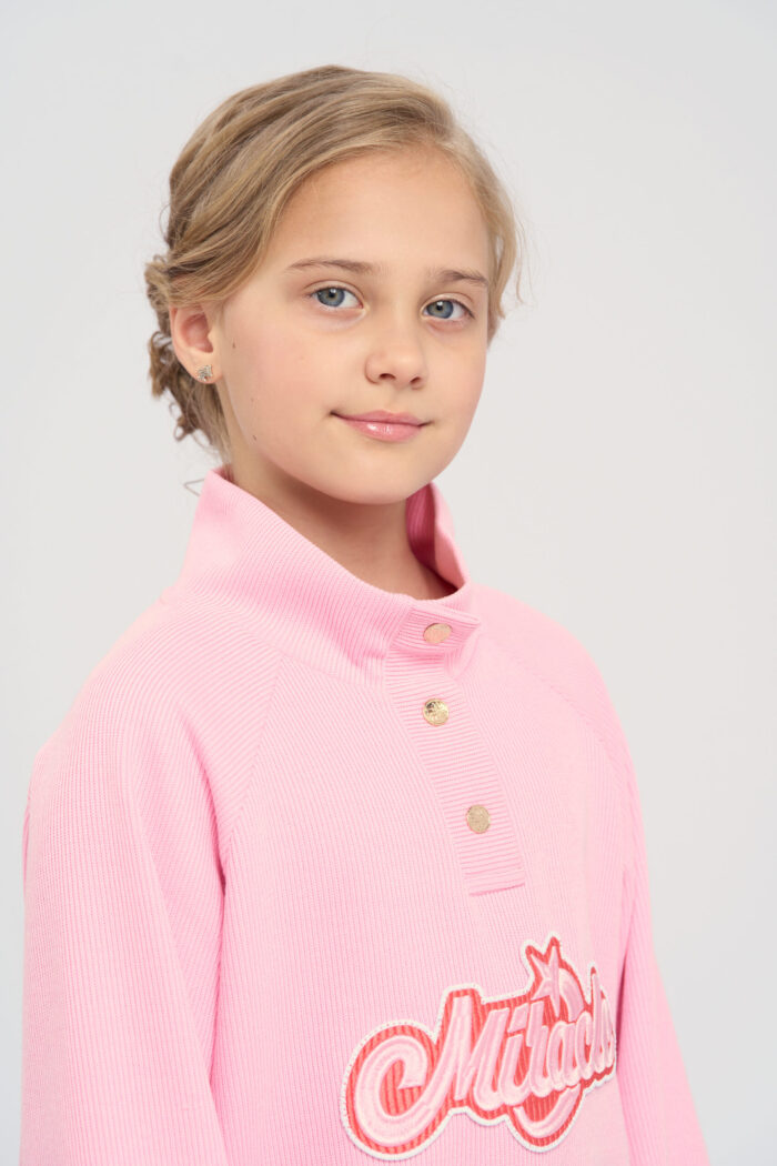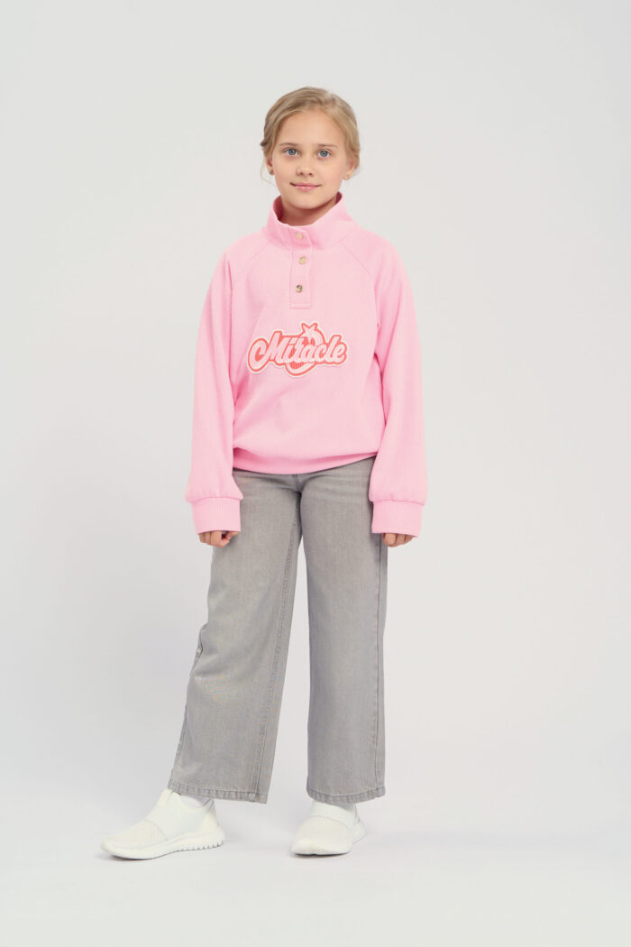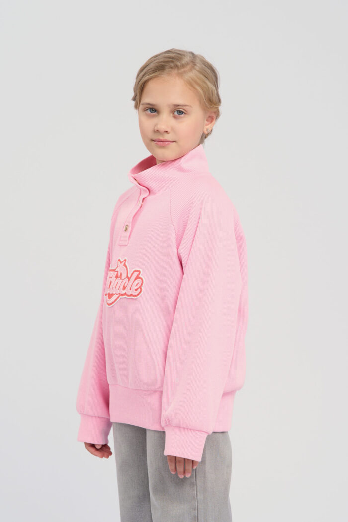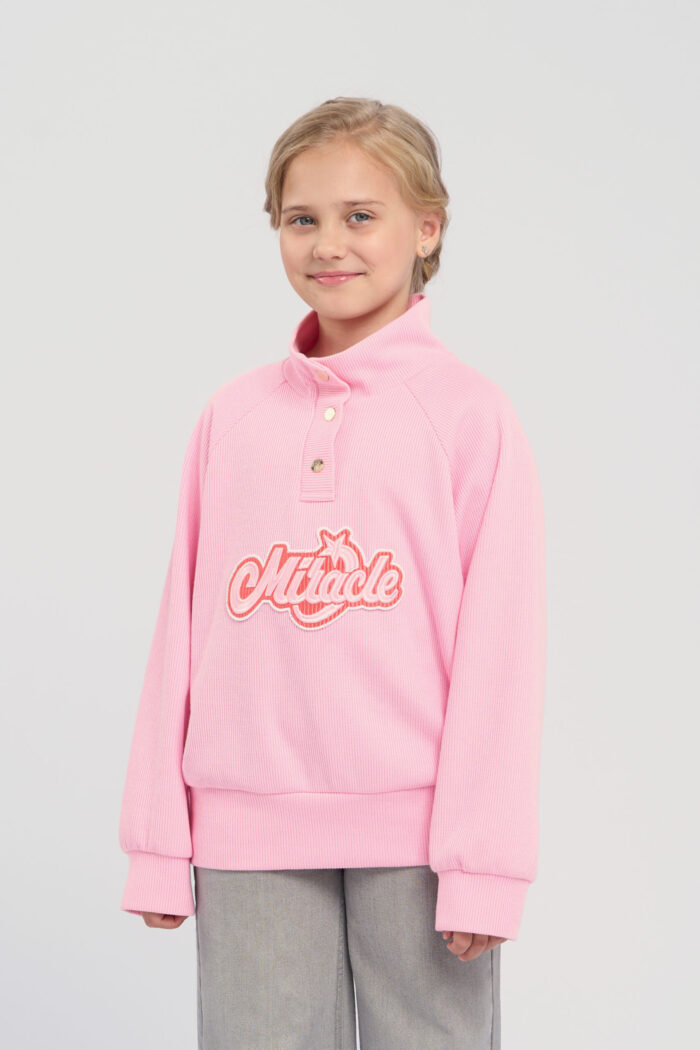 The jumper for girls is in a trendy pink colour and is decorated with an applique of the word «miracle». Made of soft and pleasant to the touch material, it provides comfortable wear and is perfect for everyday outfits. The stand-up collar protects your child from the chill. The straight silhouette makes the sweatshirt comfortable to wear. Gold-toned buttons under the collar harmoniously decorate the design.