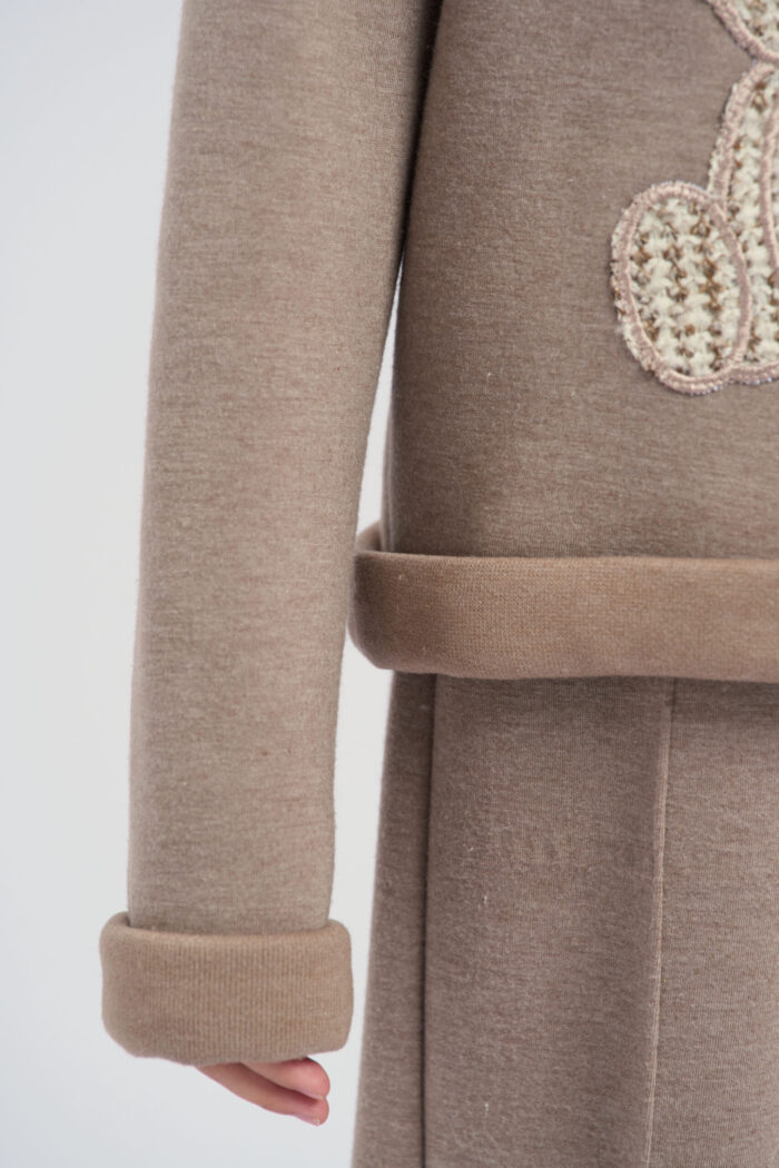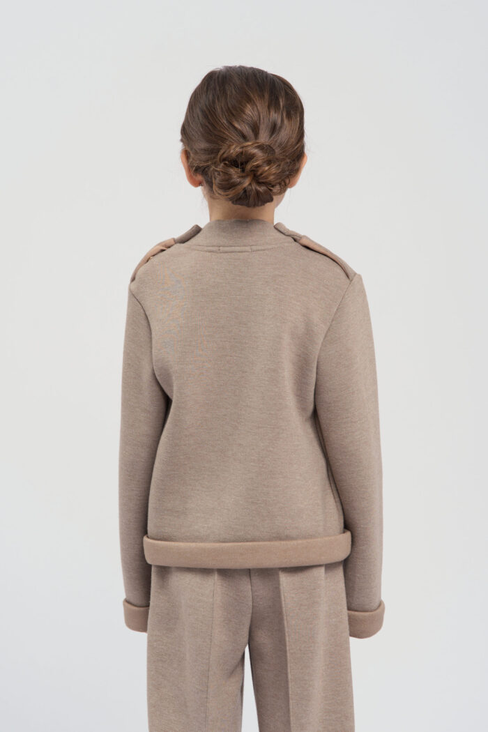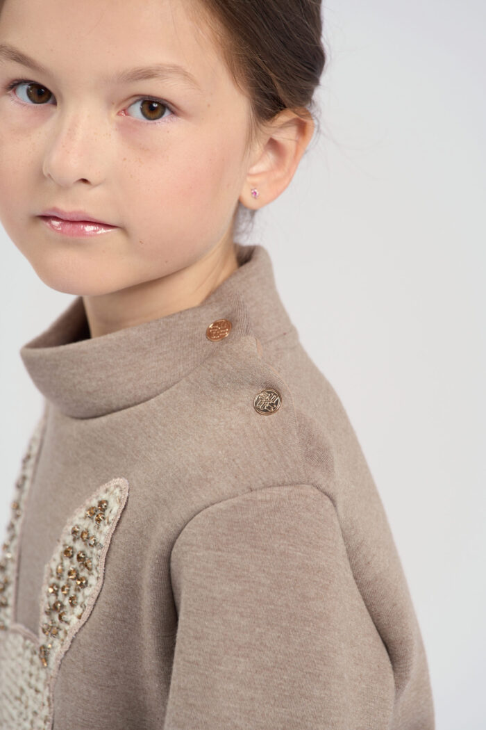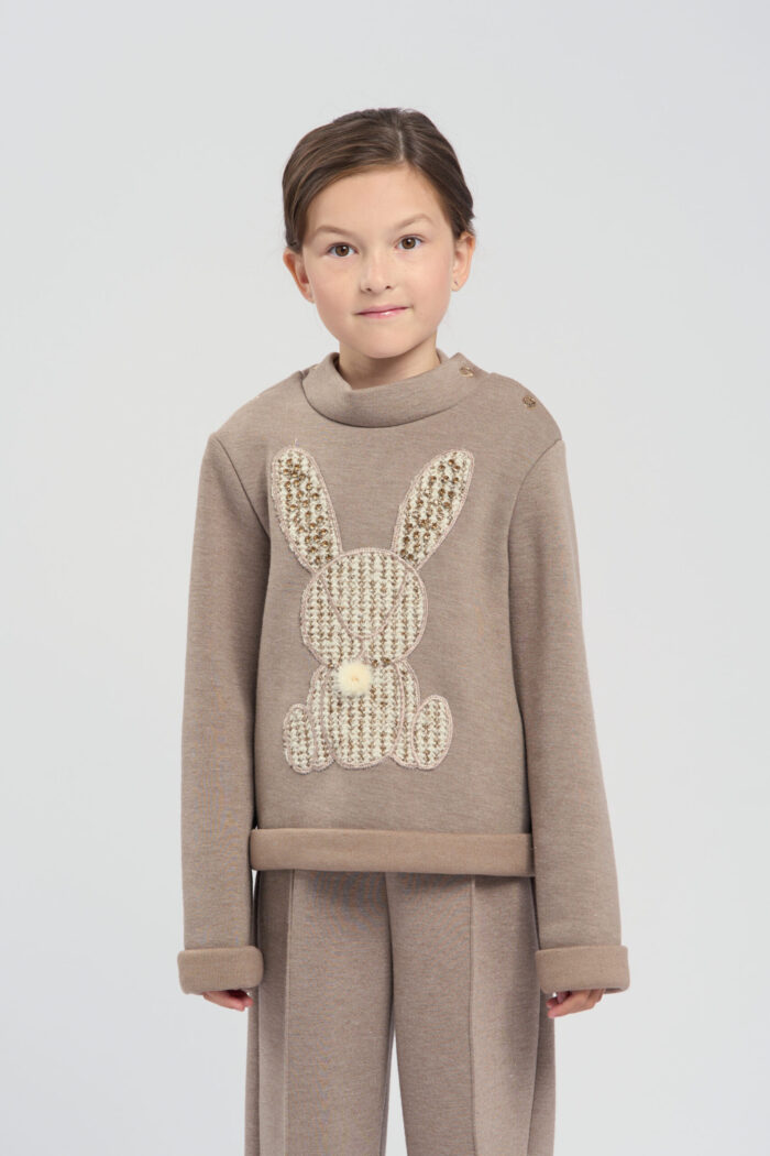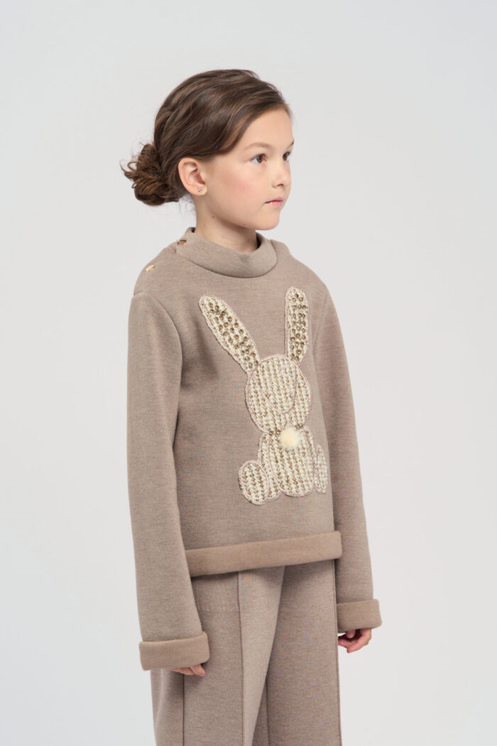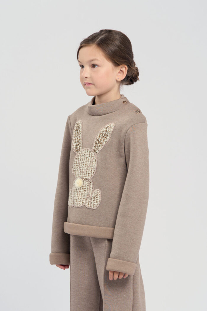 Jumper for girls is made of brown knit fabric. The model combines comfort and original design. The textured bunny embellishment adds a playful accent. Such an element makes the jumper funny and attracts attention. The neckline is decorated with buttons on the sides, which makes the jumper comfortable to put on. The cuffs on the sleeves emphasise a stylish and neat look. The jumper is perfect for everyday wear or special occasions.