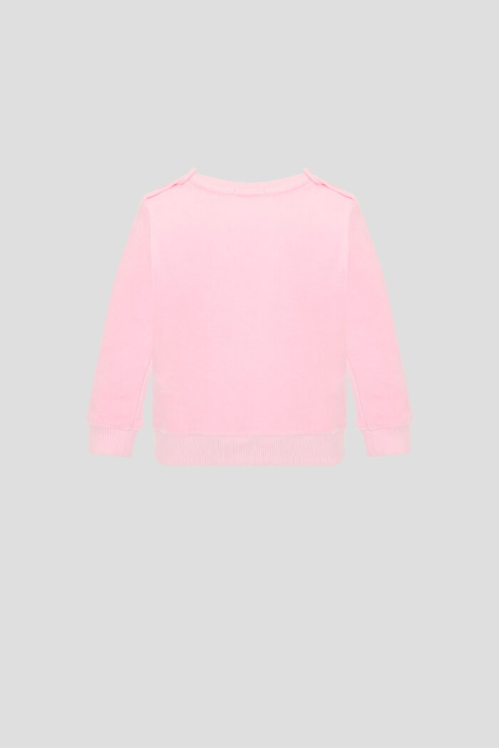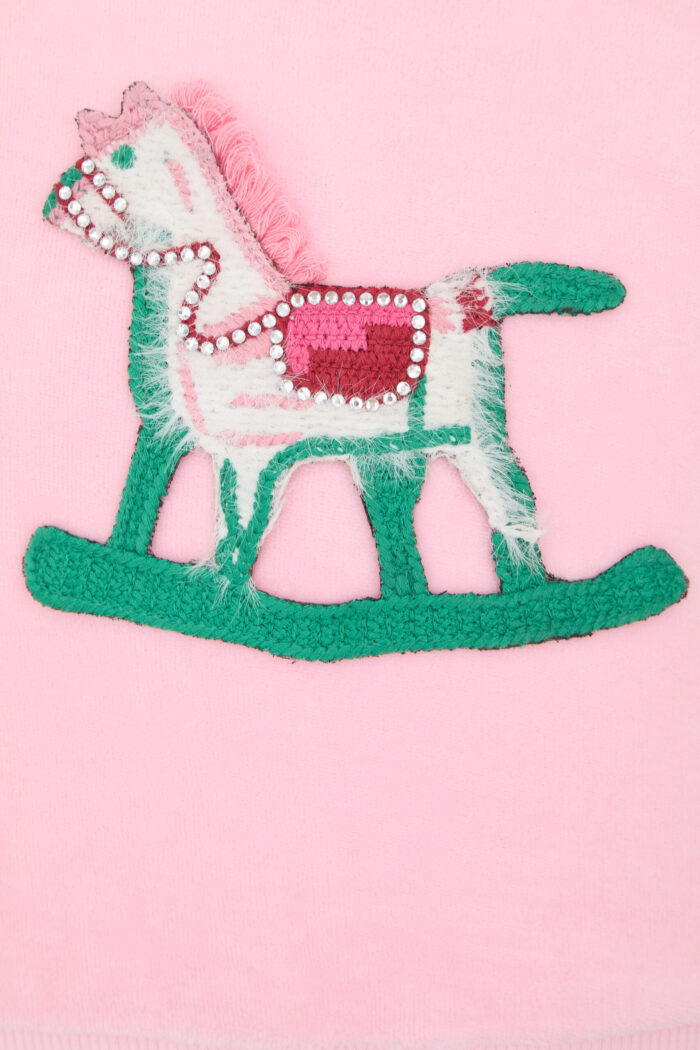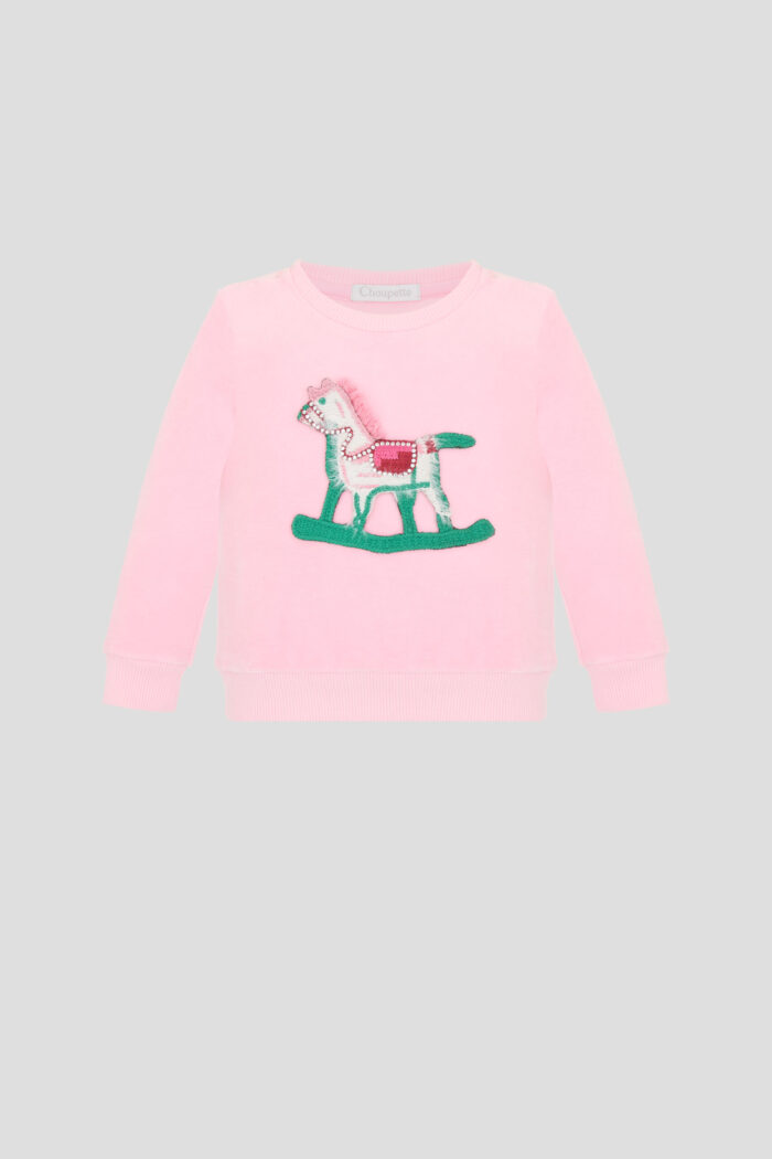 Fashionable jumper for a girl in delicate pink colour. In the centre there is an applique in the form of a toy horse.