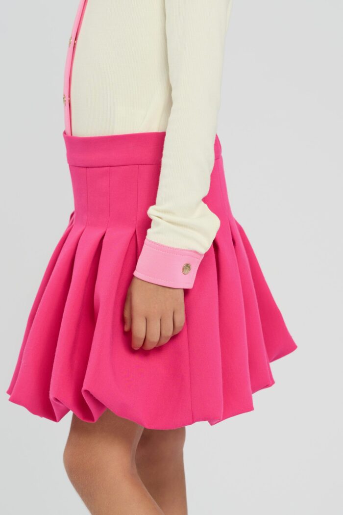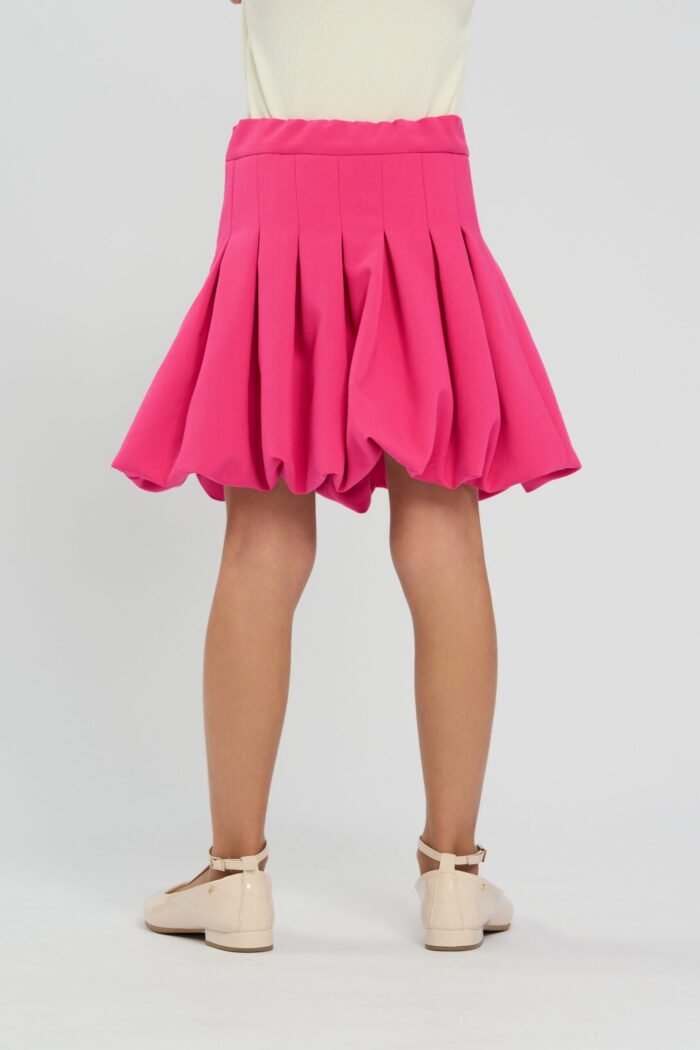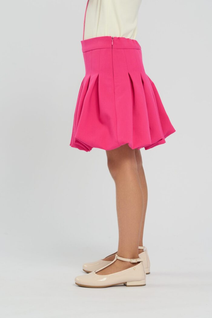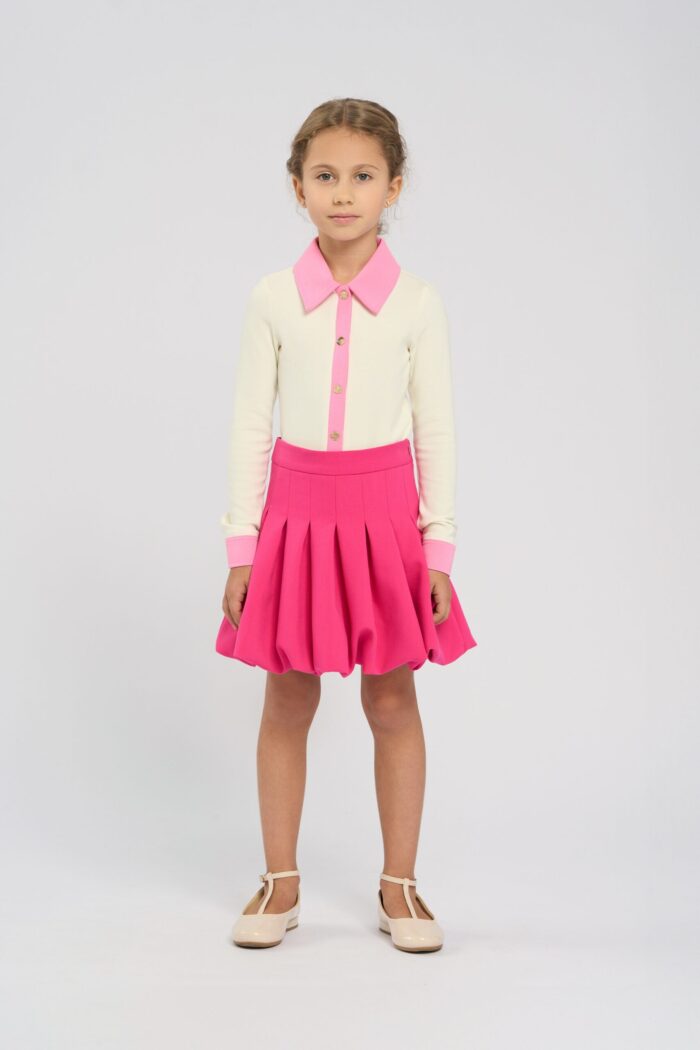 The pleated skirt for girls will be a spectacular addition to the look of a little fashionista. The model has an actual volume formed by pleats. Active pink colour makes it an effective part of any set. The skirt will harmoniously complement any top. A narrow waistband is responsible for a comfortable fit. Viscose lining is pleasant to the body. There is a zip fastener on the side.