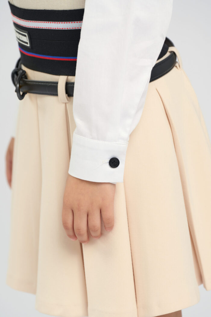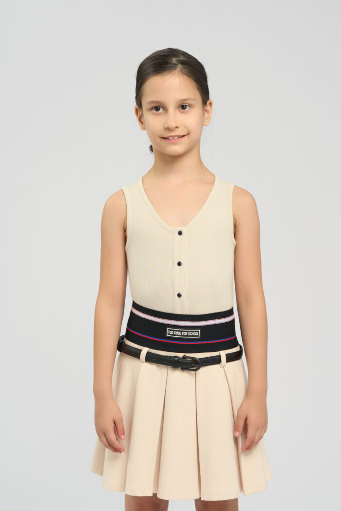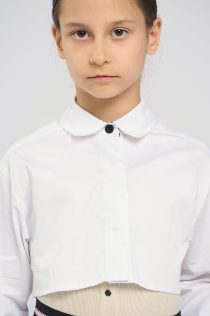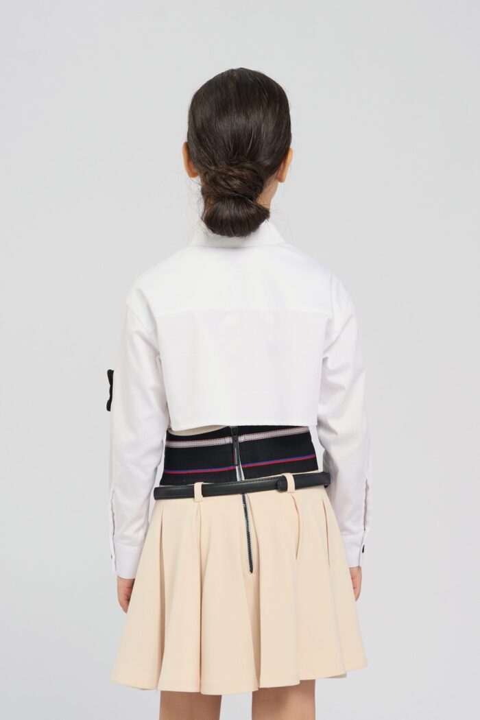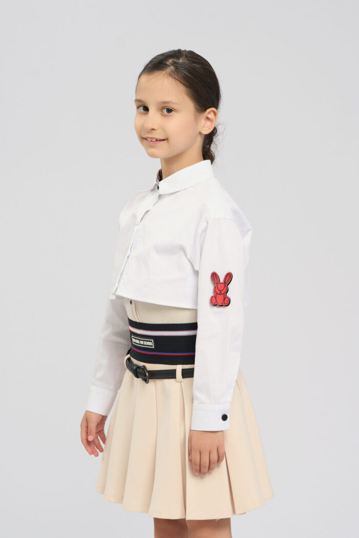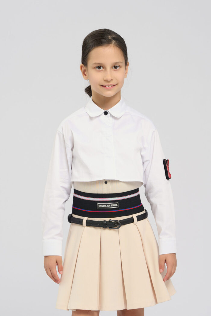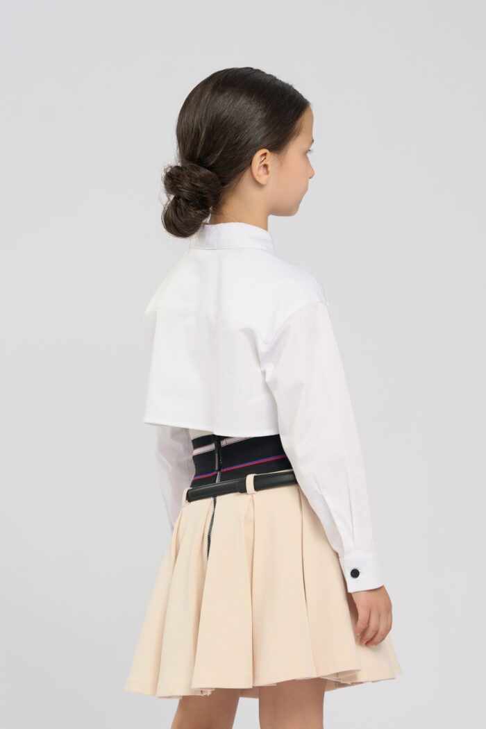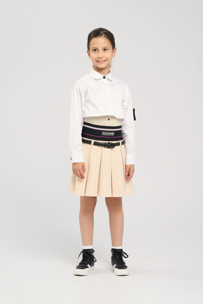Blouse and top for girls is a set of short white blouse and knitted textured top in fashionable beige colour. The blouse has a shortened cut, which emphasises the waist and goes well with high-rise skirts or pants. The blouse is fastened with hidden buttons, which gives it an elegant look. The bottom top has a textured knit that creates an interesting visual effect. Universal design allows you to wear the top separately or in combination with a blouse. The set is perfect for creating a casual or more dressy look. It can be easily combined with various accessories.