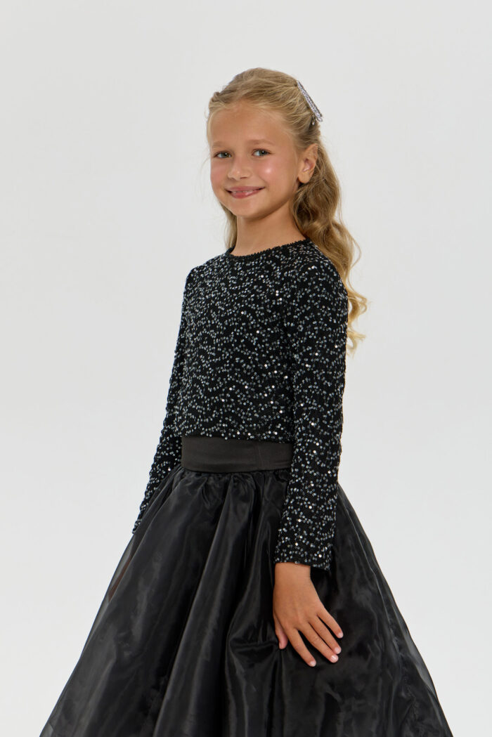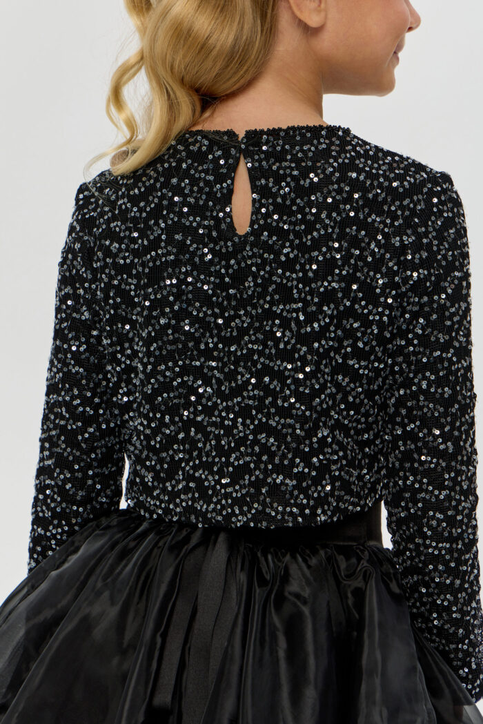 Black blouse decorated with shiny sequins is a great accent piece for a girl’s wardrobe. This fashionable item can transform any outfit, making it memorable. Thanks to the softness of the fabric, it is a pleasure to wear. A sequined blouse is a great option for special occasions. It is an excellent choice for a birthday party or other festive event, perfectly complementing a celebratory look. The blouse goes well with skirts and pants in neutral shades.