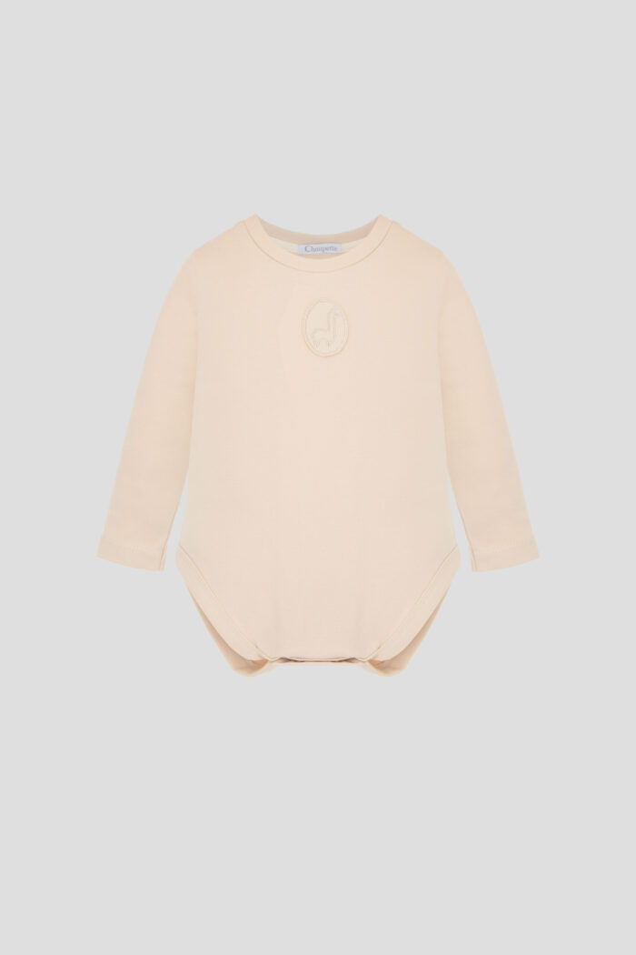Beige-coloured baby bodysuit is a universal baby’s clothing. The model has a round neckline and button fastening between the legs and on the shoulders. The body is decorated in the centre with an alpaca patch. The natural fabric indicates the high hygienic properties of the garment. Cotton absorbs moisture well, which helps to keep baby’s skin dry and prevents discomfort. Cotton does not cause allergies and irritations, which is especially important for sensitive skin.