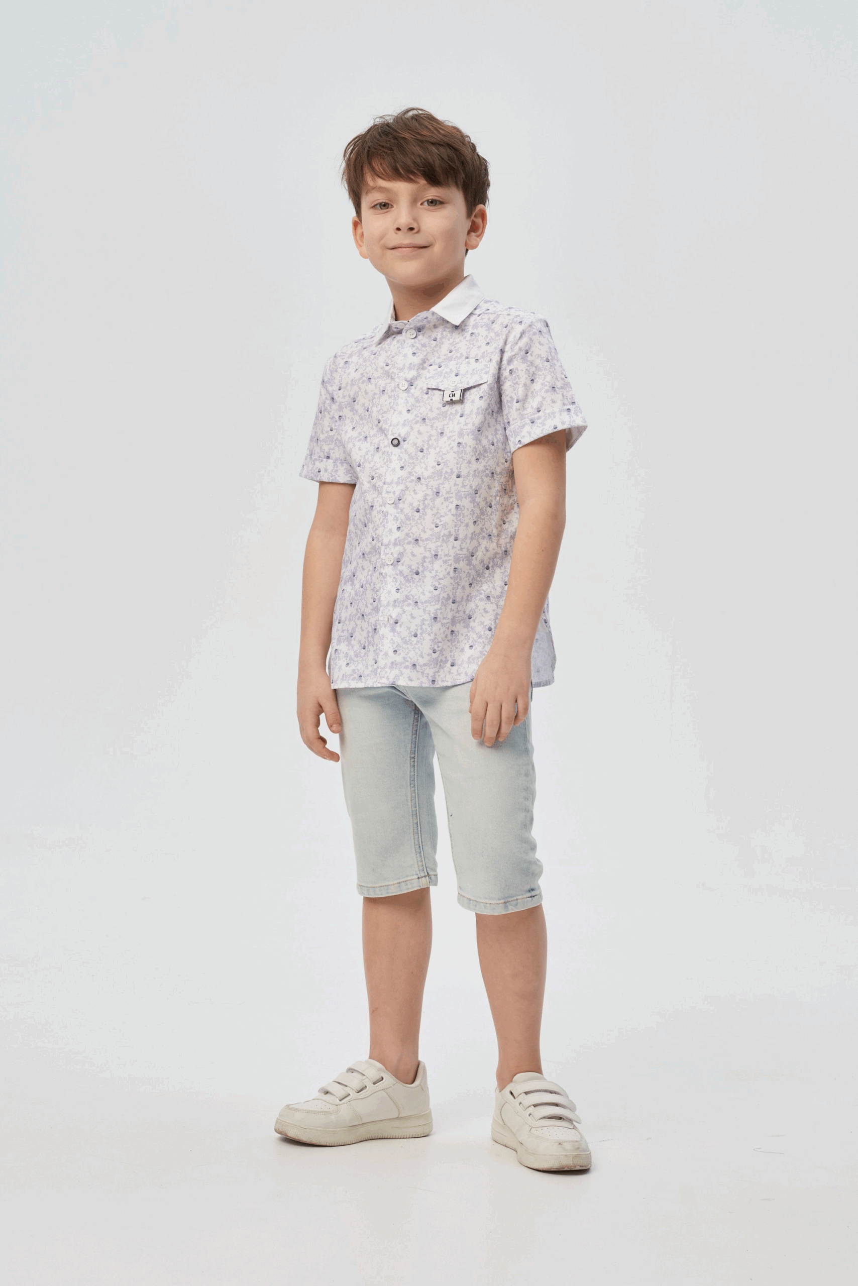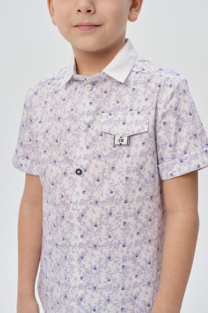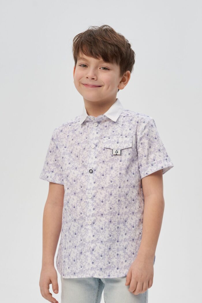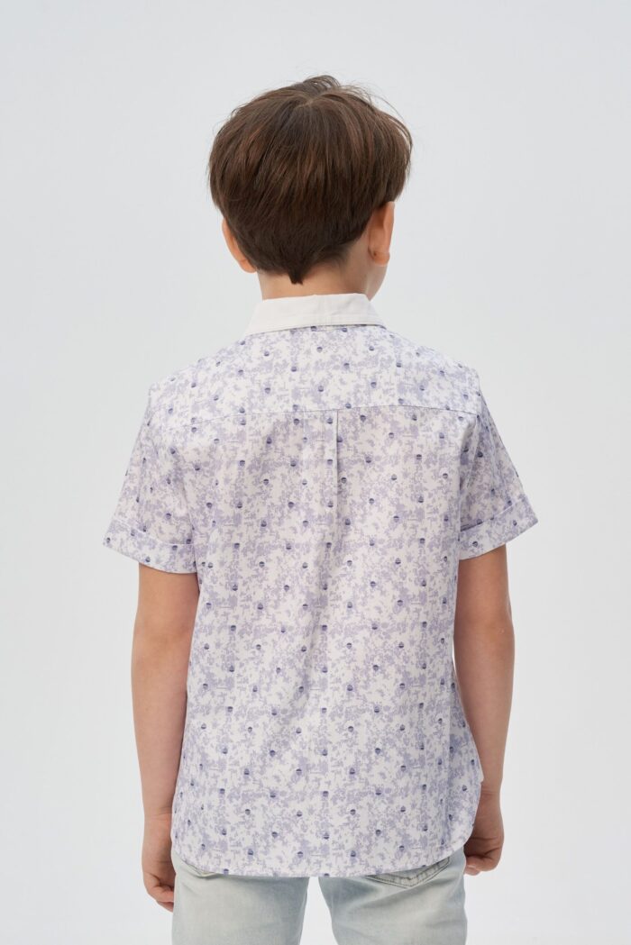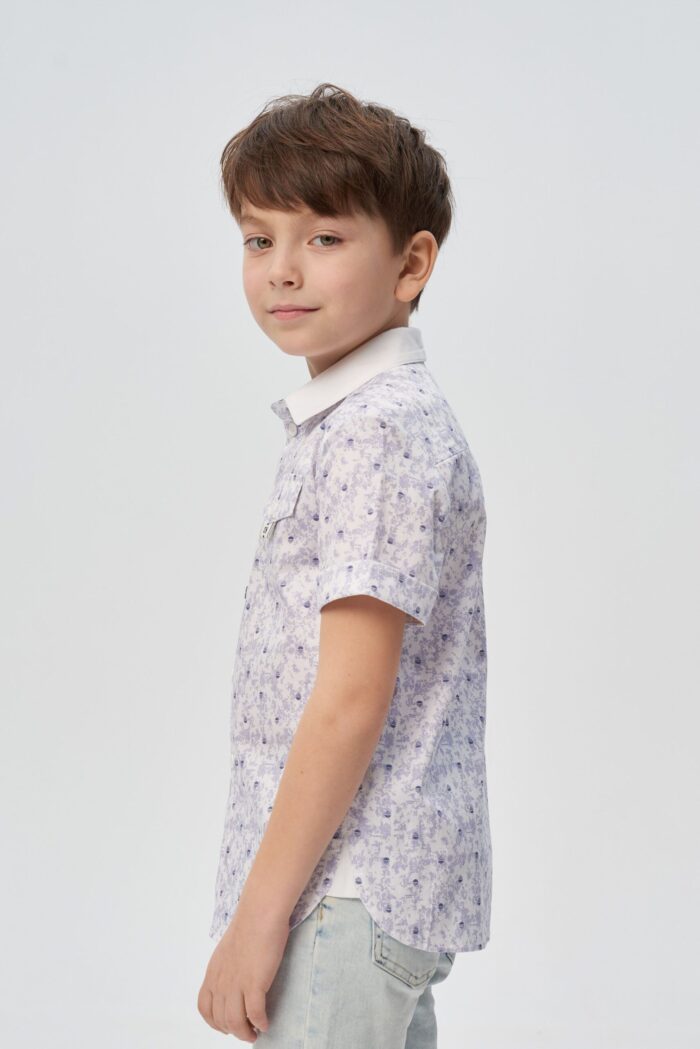 Una camisa de algodón con un estampado de tendencia y manga corta encajará perfectamente en el armario de un niño. El tejido natural es importante para la delicada piel del niño. Es transpirable y evacua la humedad. El cuello en contraste es lo más destacado del diseño. El bolsillo de parche en el pecho no sobrecarga el diseño. La camisa se abrocha con botones. La camisa se abrocha con botones.
