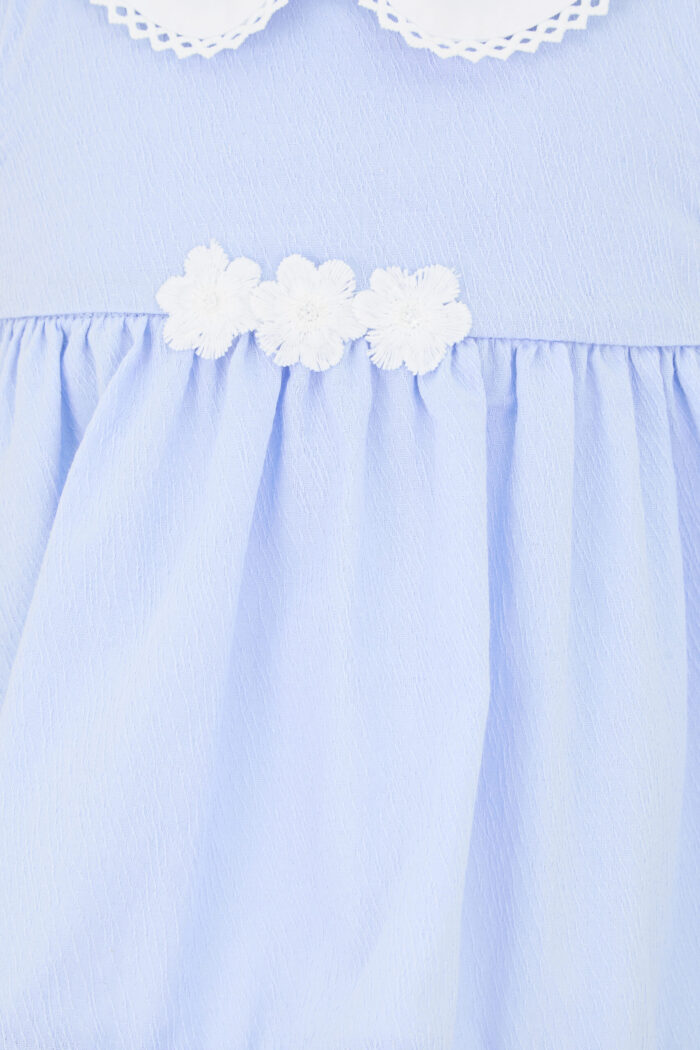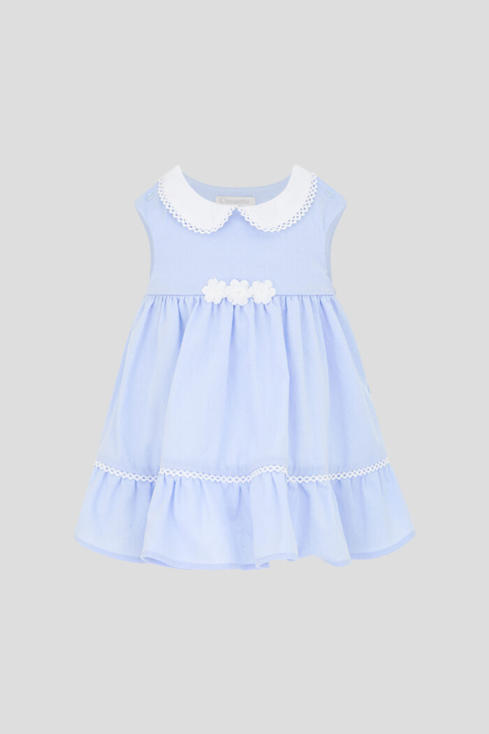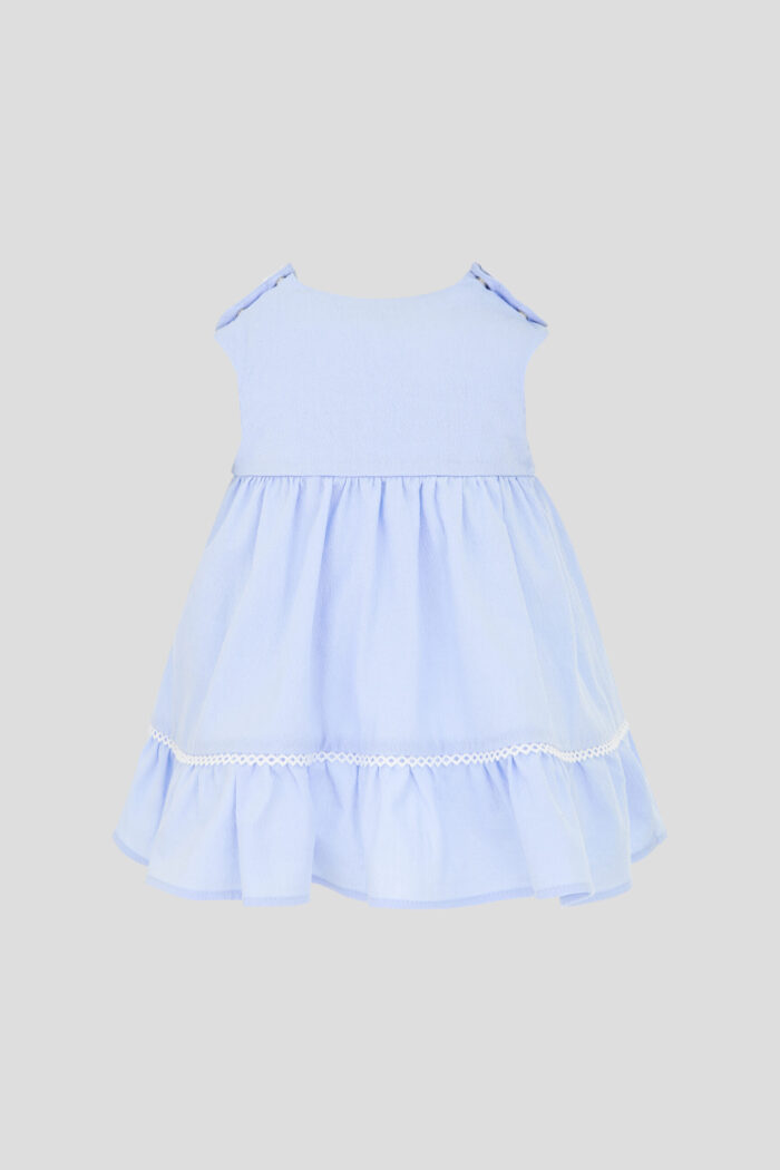 A marvellous dress with flounces will perfectly complement a baby girl’s summer wardrobe. Loose fit, no sleeves and a collar make the model comfortable. Convenient snap-buttons on the shoulders simplify the process of changing clothes. Contrasting flowers on the waistband are a vivid accent in the design. Light flounces at the bottom of the dress, decorated with white braid, give the outfit lushness and expressiveness. This dress will be a great option for all kinds of children’s holidays.