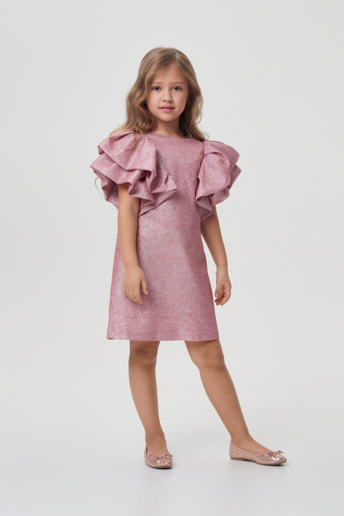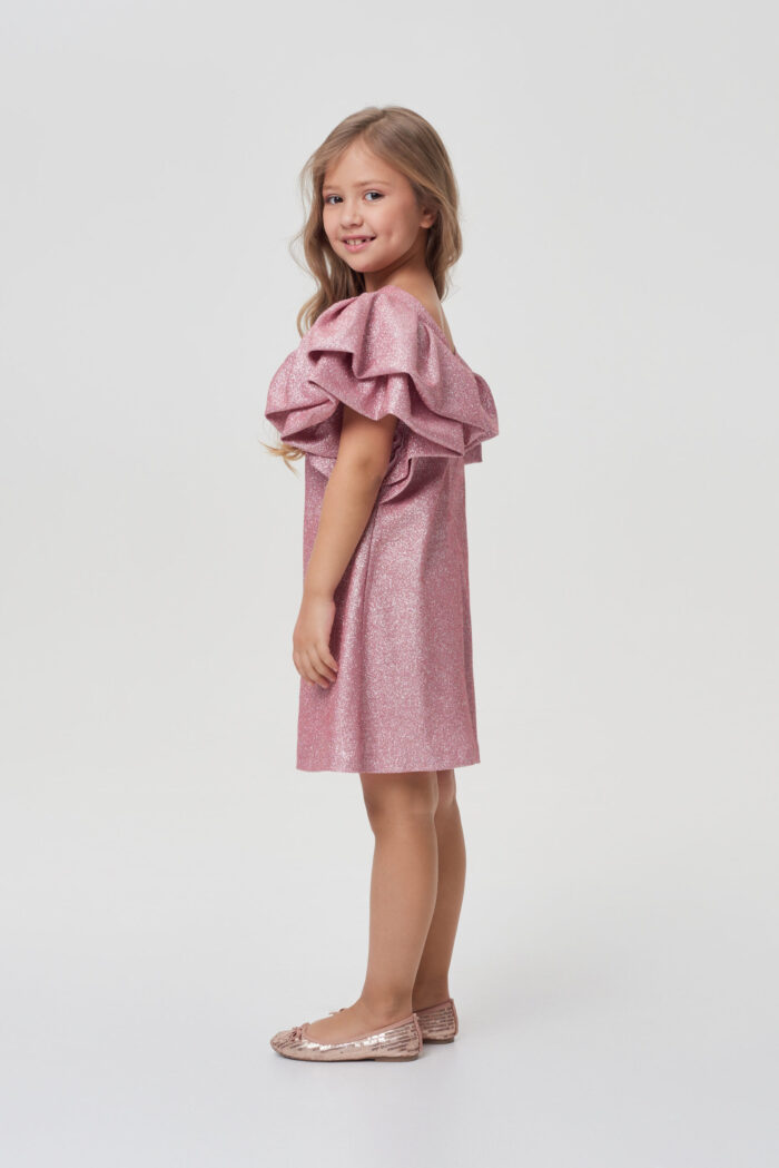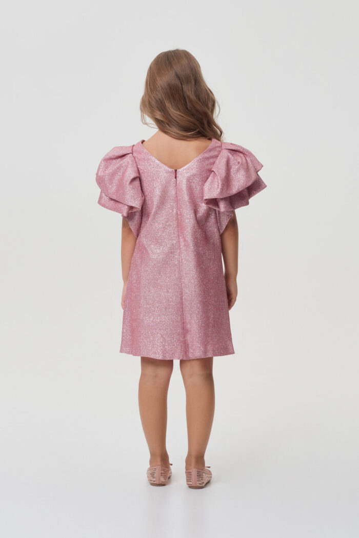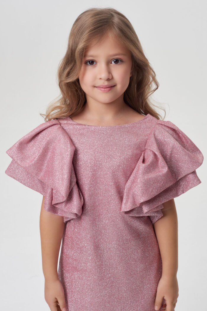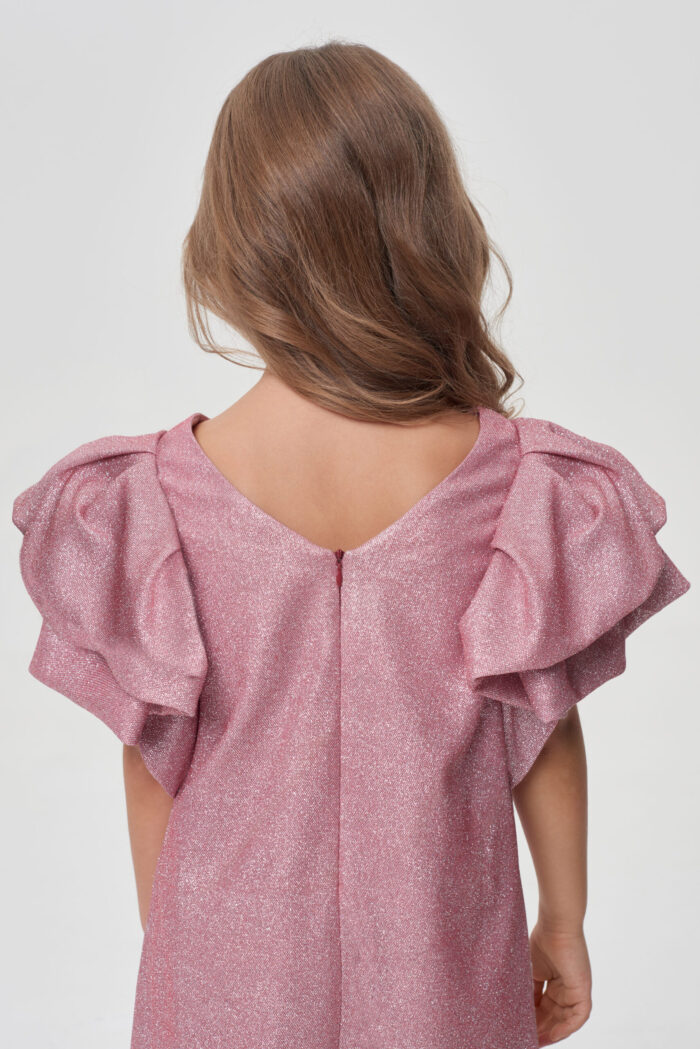 The dress for a girl is made in a delicate pink colour, it will become a real decoration of any holiday. The dress has puffy two-tiered sleeves, which give the look of playfulness and charm. The main fabric of the dress is decorated with sequins, which give the outfit a festive glitter and charm. Light and airy texture makes the dress comfortable to wear, allowing the girl to feel free and confident. The back features a neat zip fastening for a perfect fit and comfortable putting on.