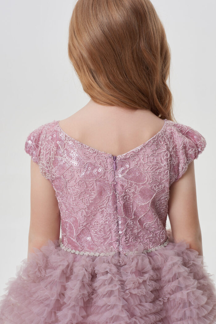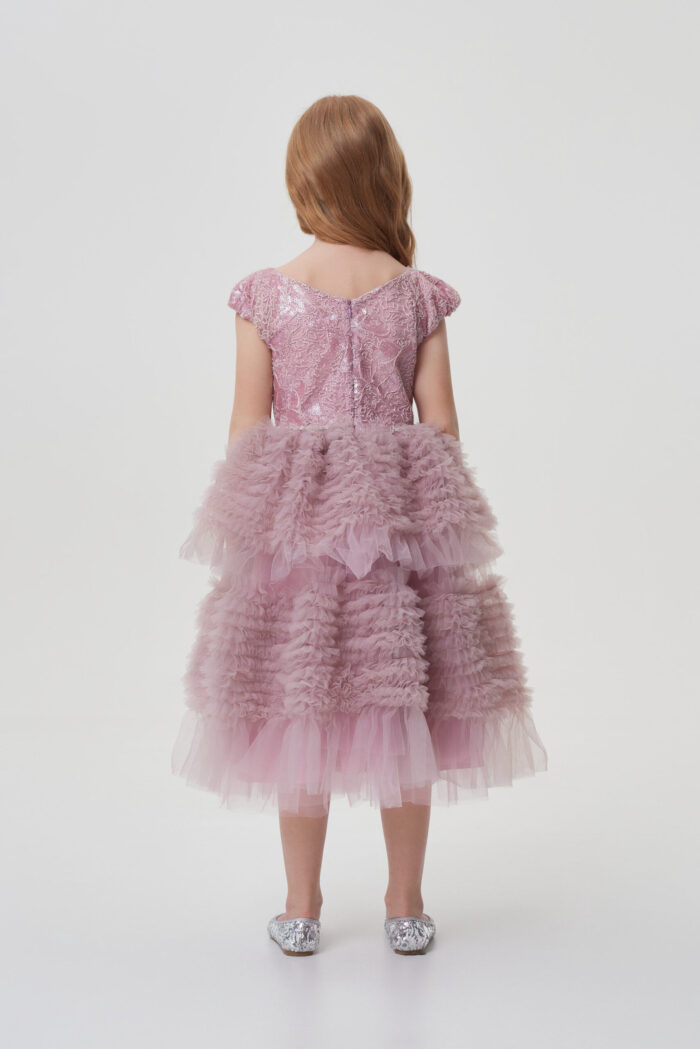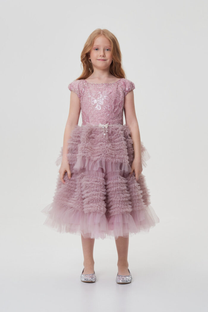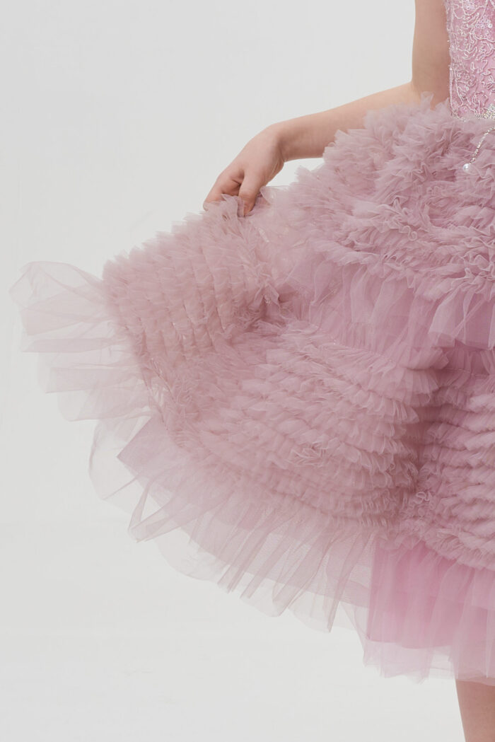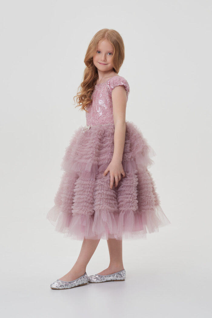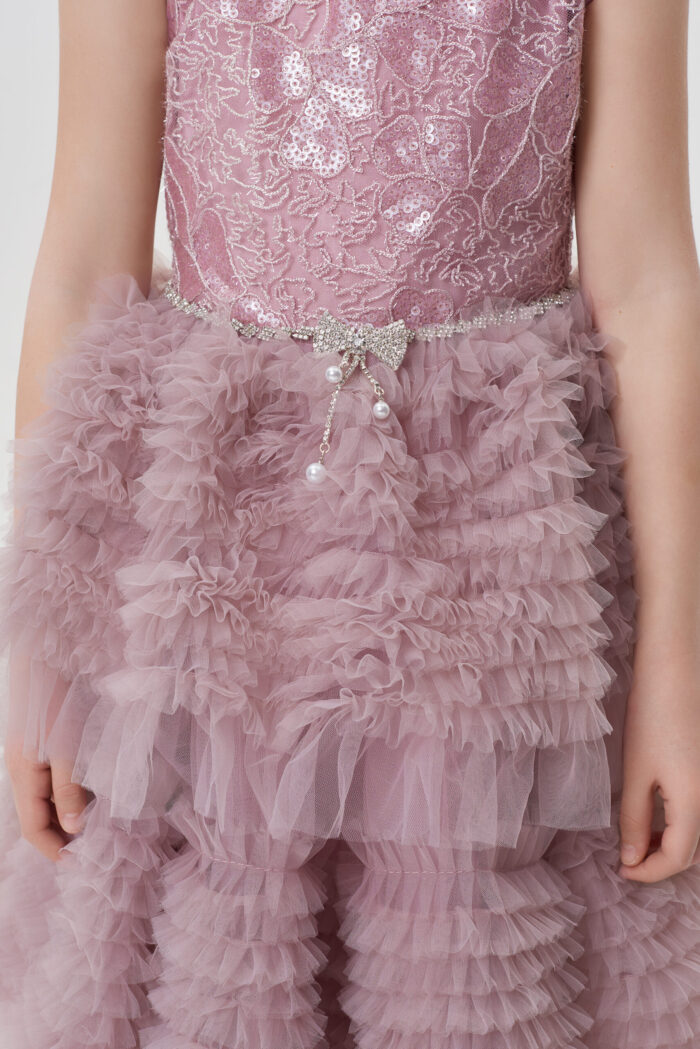 Exquisite dress in delicate pink colour is created for a fabulous evening. The top bodice is made of textured fabric with sequins. It neatly fits the figure, but does not restrain movements. The lush long skirt falls down spectacularly, it is trimmed with light tulle, which gives it additional volume and airiness. There is a spectacular decorative element at the waistline. The zip on the back provides convenience when putting on the dress. The dress will be an ideal choice for holidays, matinees or family celebrations.