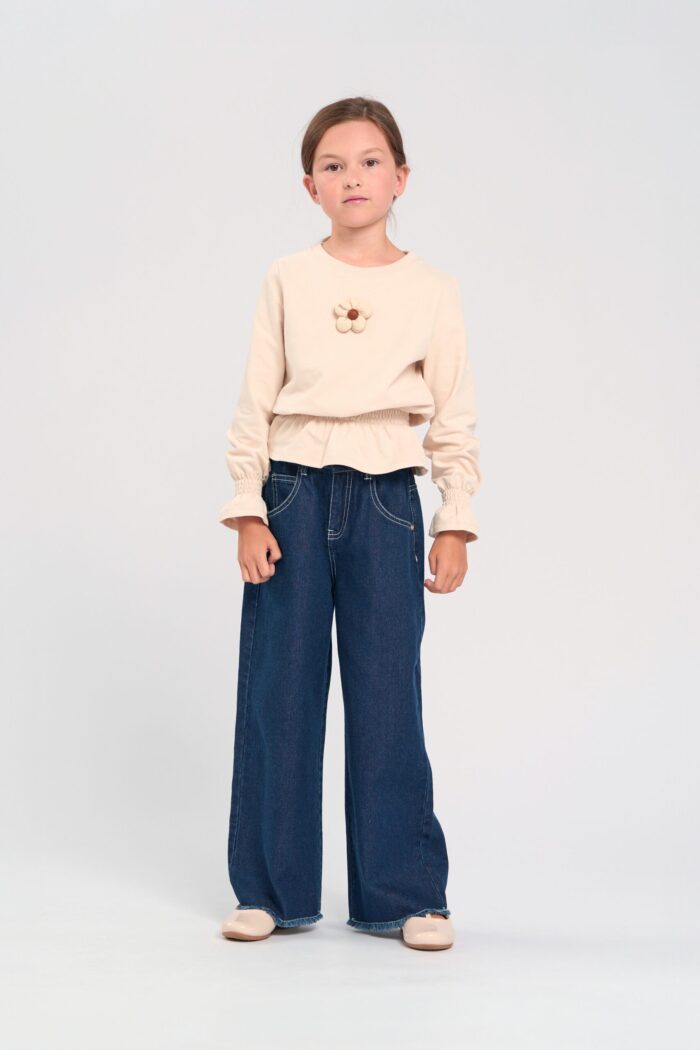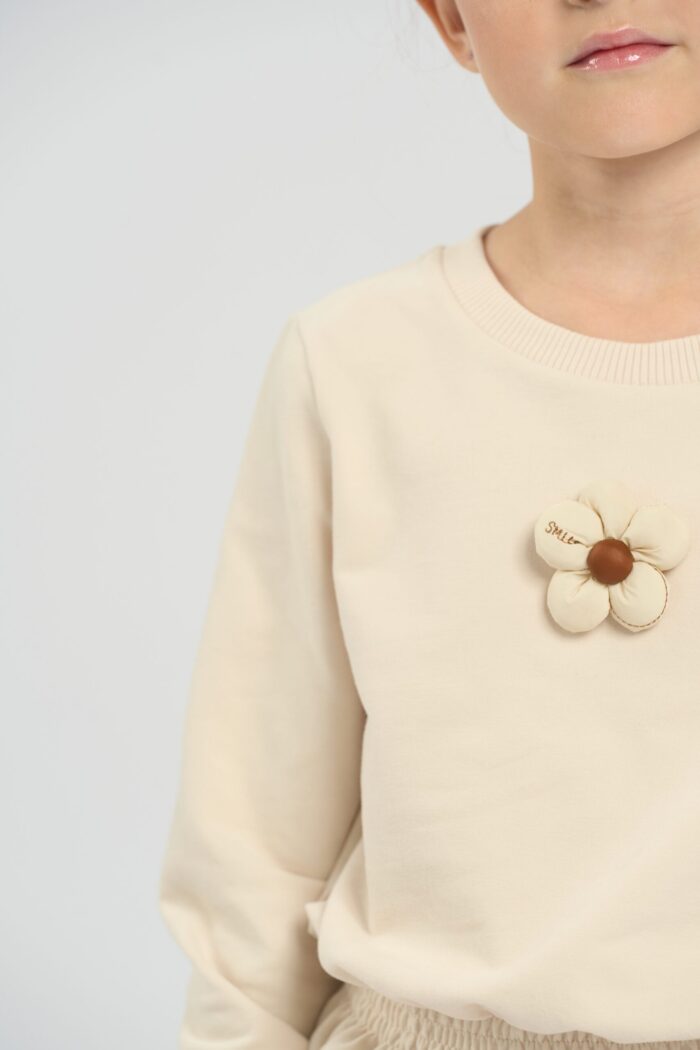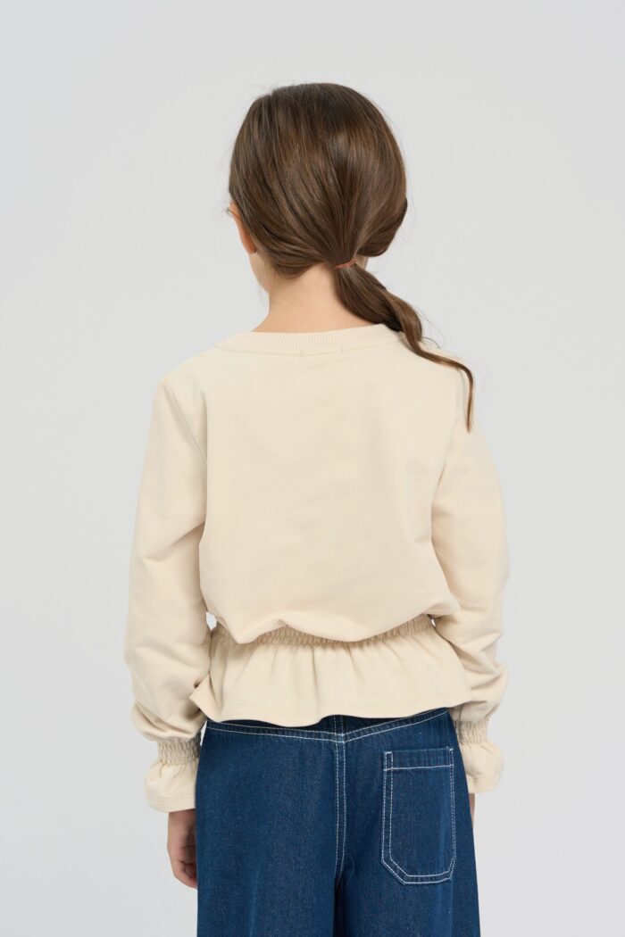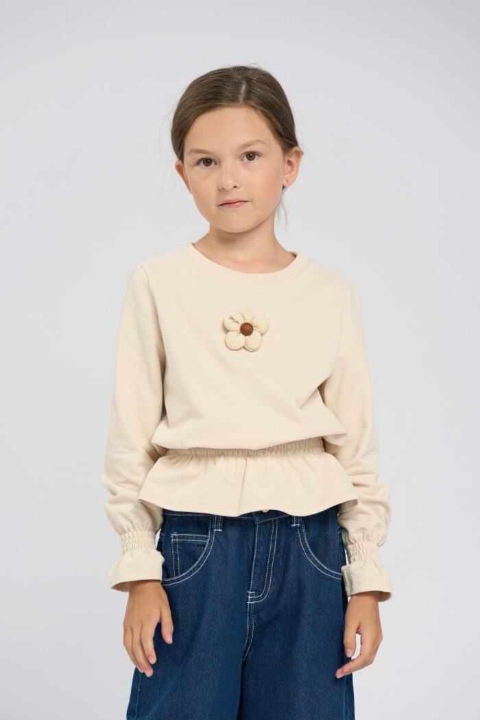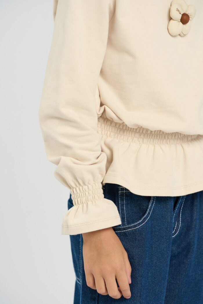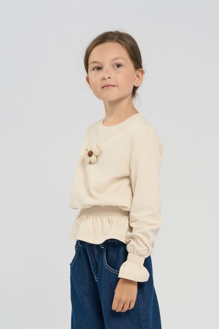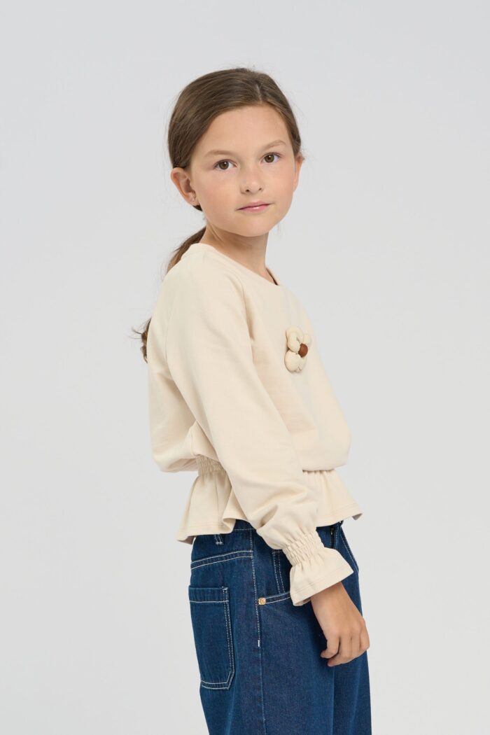 Long sleeve t-shirt for girl is made of soft futer in a pleasant creamy colour. The comfortable cut ensures freedom of movement, while the long sleeves protect from the autumn chill. A special accent in the design is a charming decoration in the form of a floral applique. At the waist there is a comfortable elastic band forming a lush flounce. Delicate creamy colour can be easily combined with various wardrobe items. The long sleeve t-shirt is perfect for both everyday wear and special occasions.