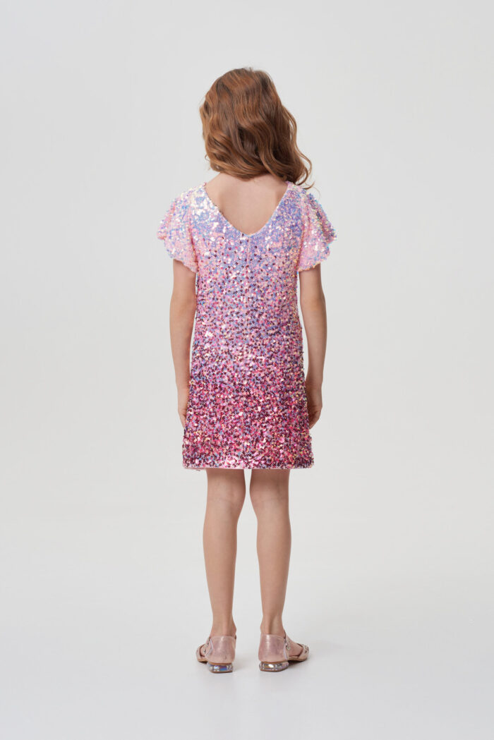 This dress in delicate pink shades is created especially for a magical holiday! Shimmering sequins are scattered all over the surface of the model, which catch the light and create a sparkling effect. This adds to the brightness and festive mood of the outfit, making it the perfect choice for special occasions. The short wingtip sleeves give the dress a playful and lightweight feel. They neatly frame the shoulders, creating the look of a real princess. The comfortable silhouette allows the girl not only to look gorgeous, but also to feel confident and comfortable throughout the holiday.