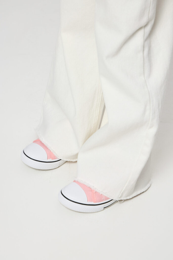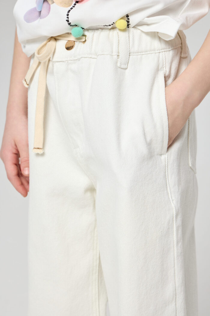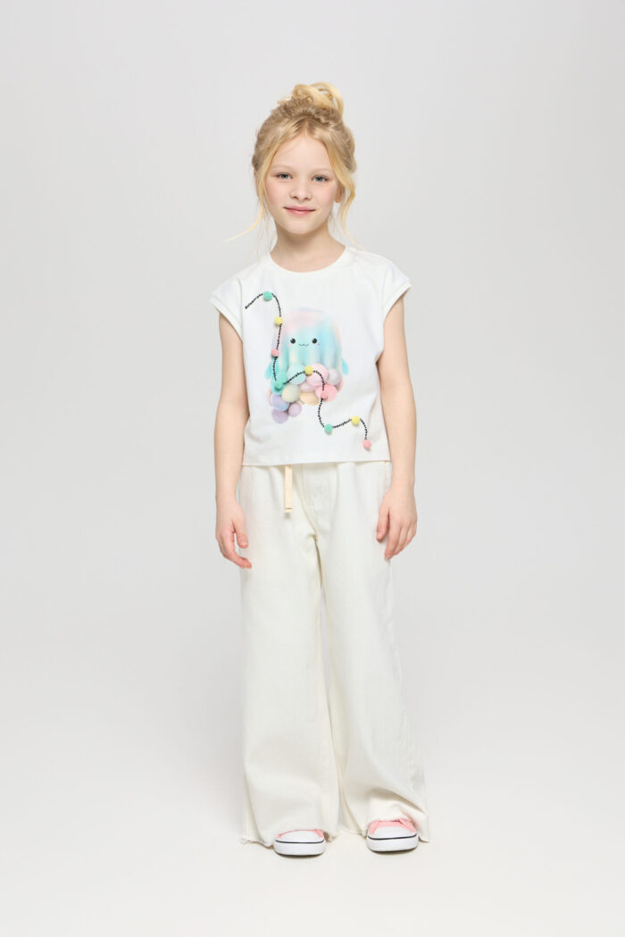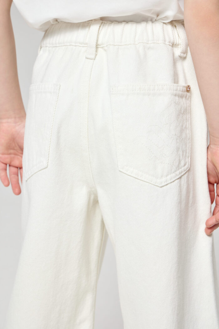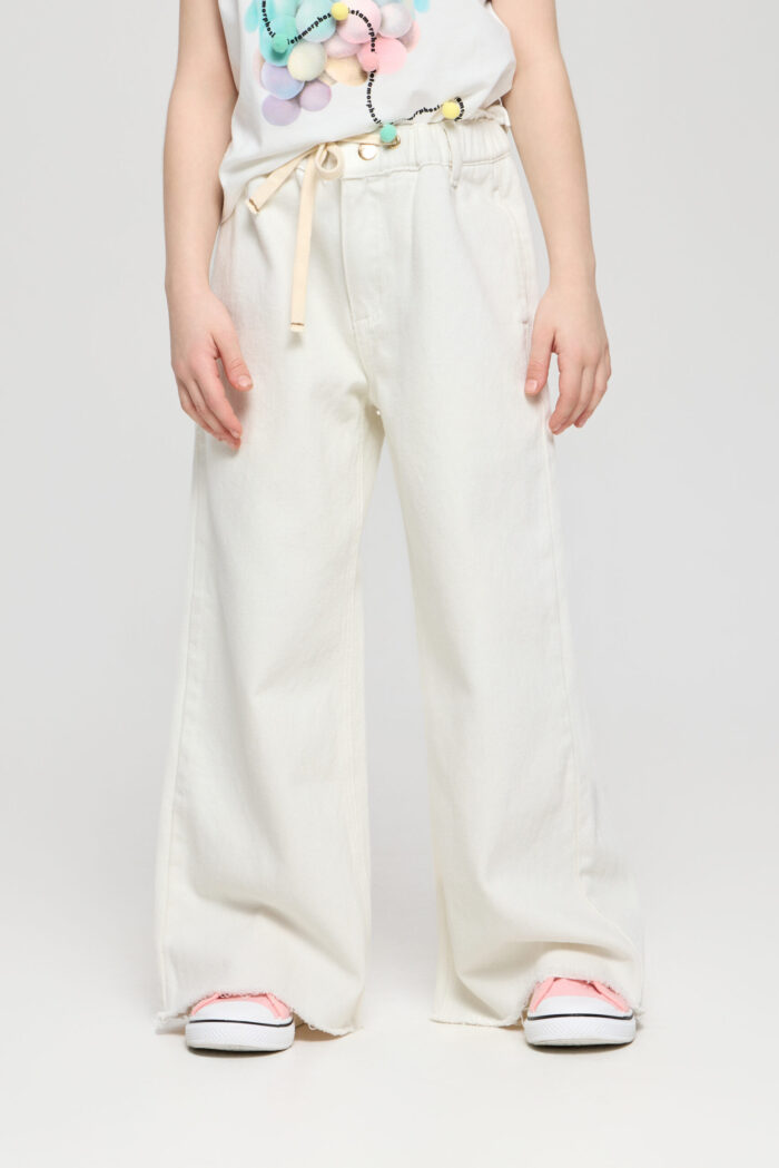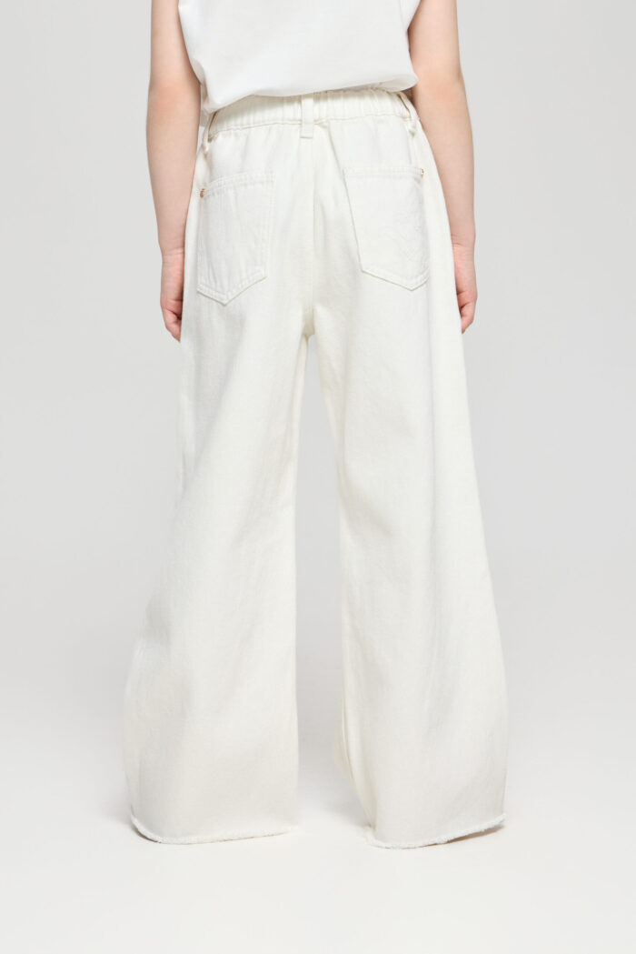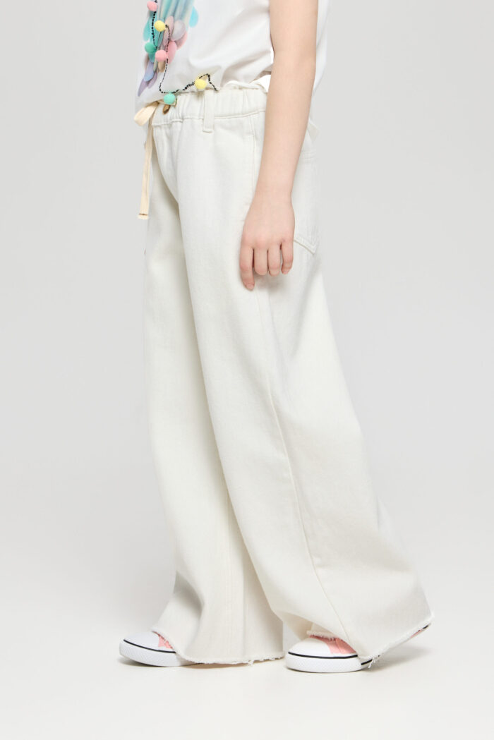 White coloured jeans for girls – a basic piece in the summer wardrobe. The wide fit does not restrain movements. The adjustable elasticated waistband is additionally equipped with a waistband for a perfect fit. The deep pockets on the sides and back are ideal for storing small things. Combine the jeans with a variety of T-shirts, tops and jackets.