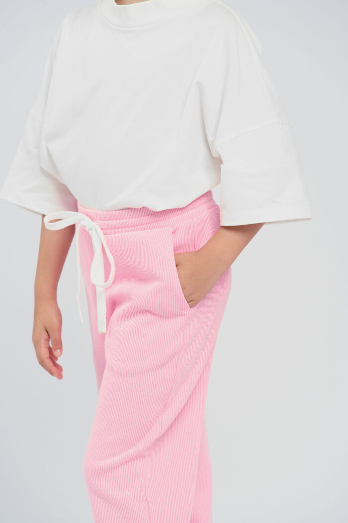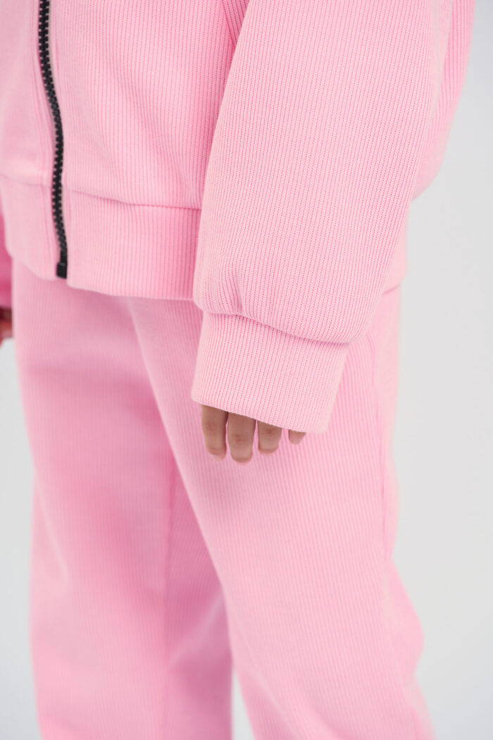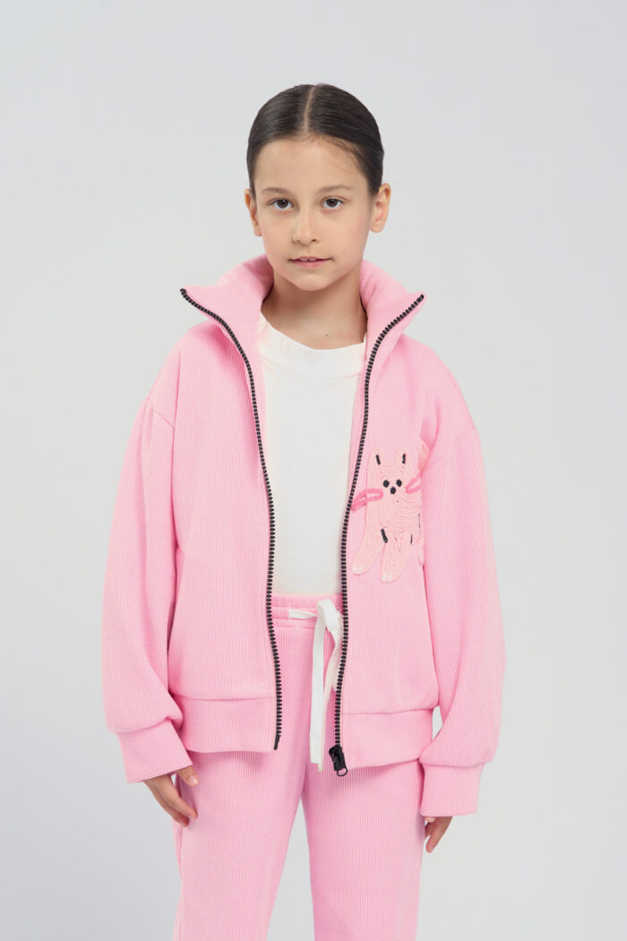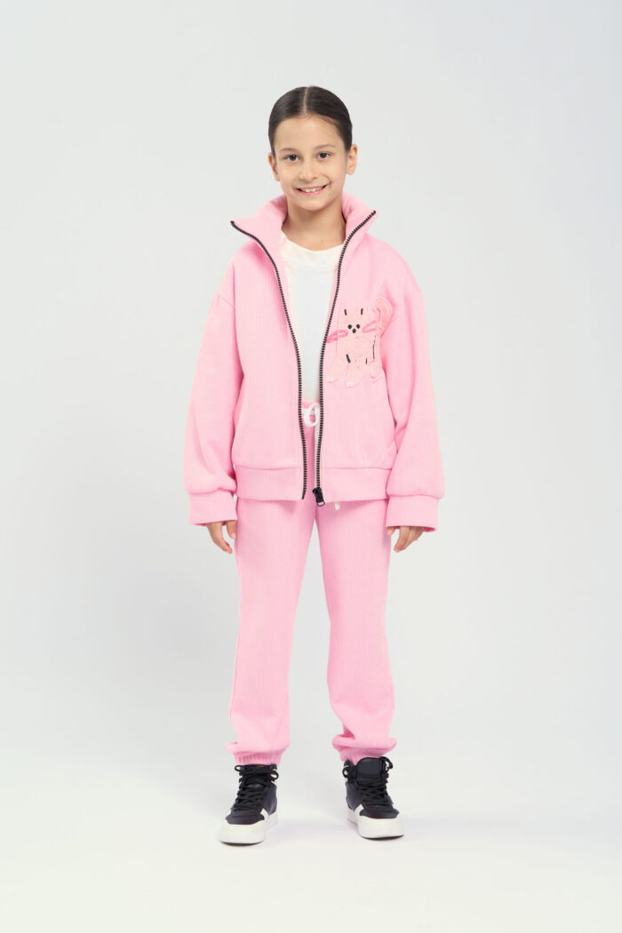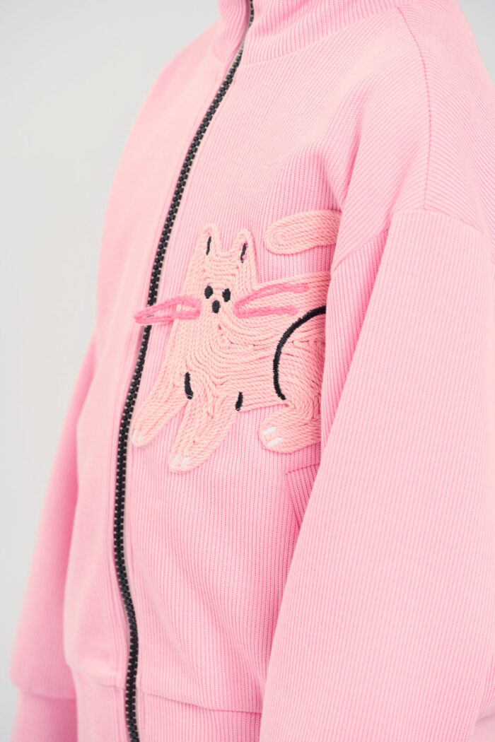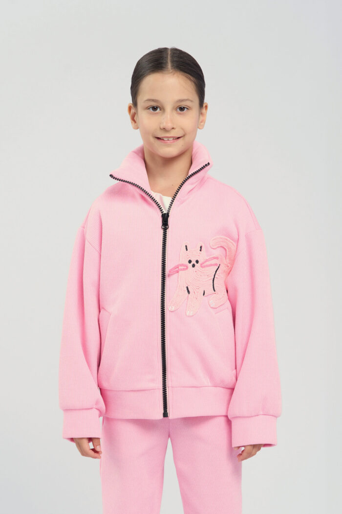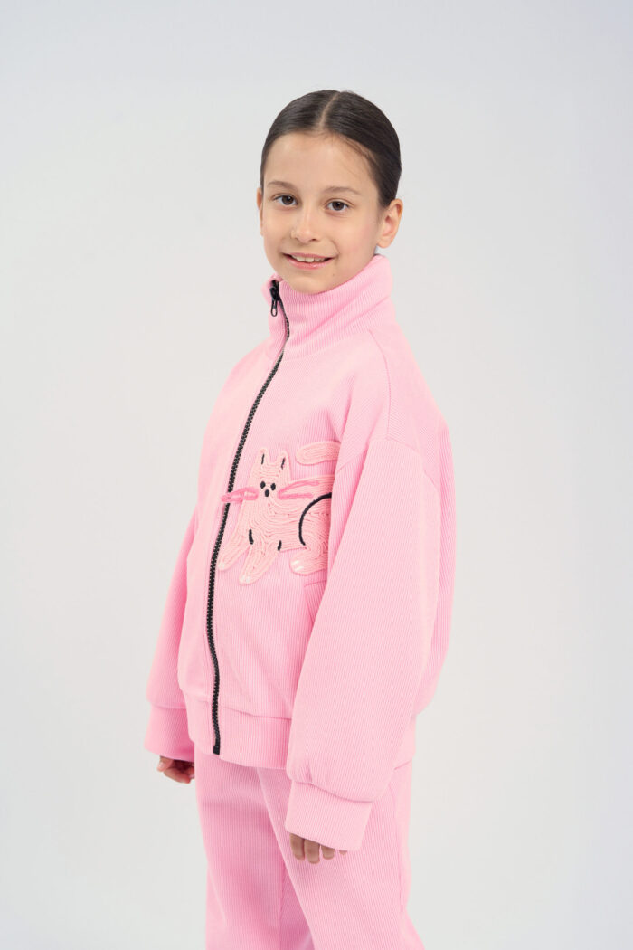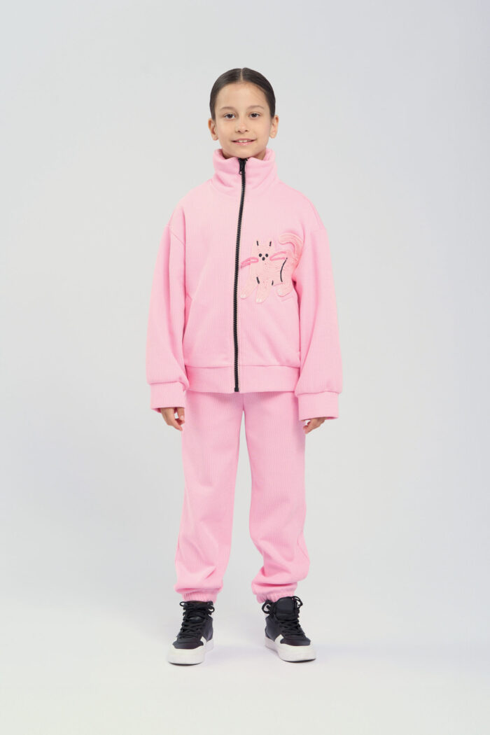 Pink suit for a girl consists of a zip-through sweatshirt and pants. The fabric with high cotton content is pleasant to the skin. It’s the perfect outfit for active play. The sweatshirt is decorated with embroidery in the form of a cute cat.