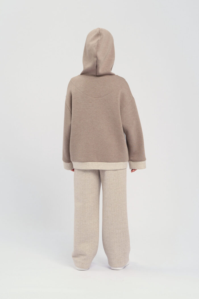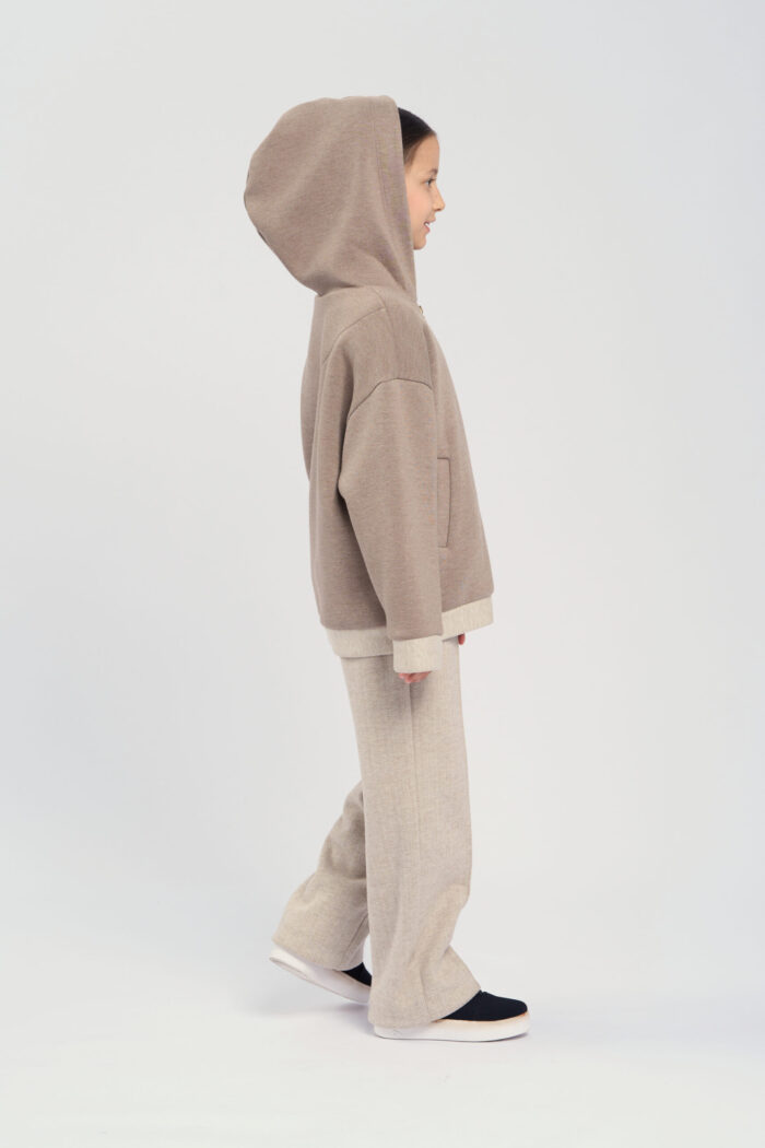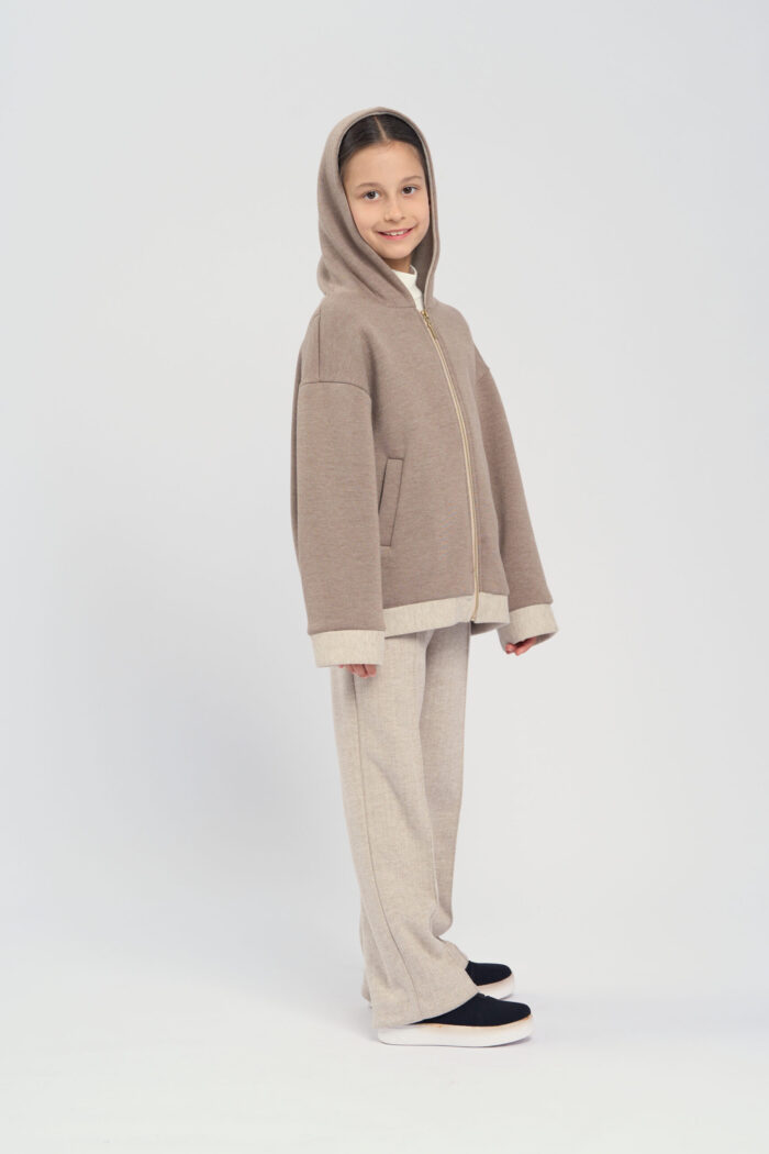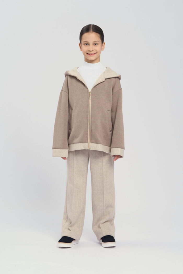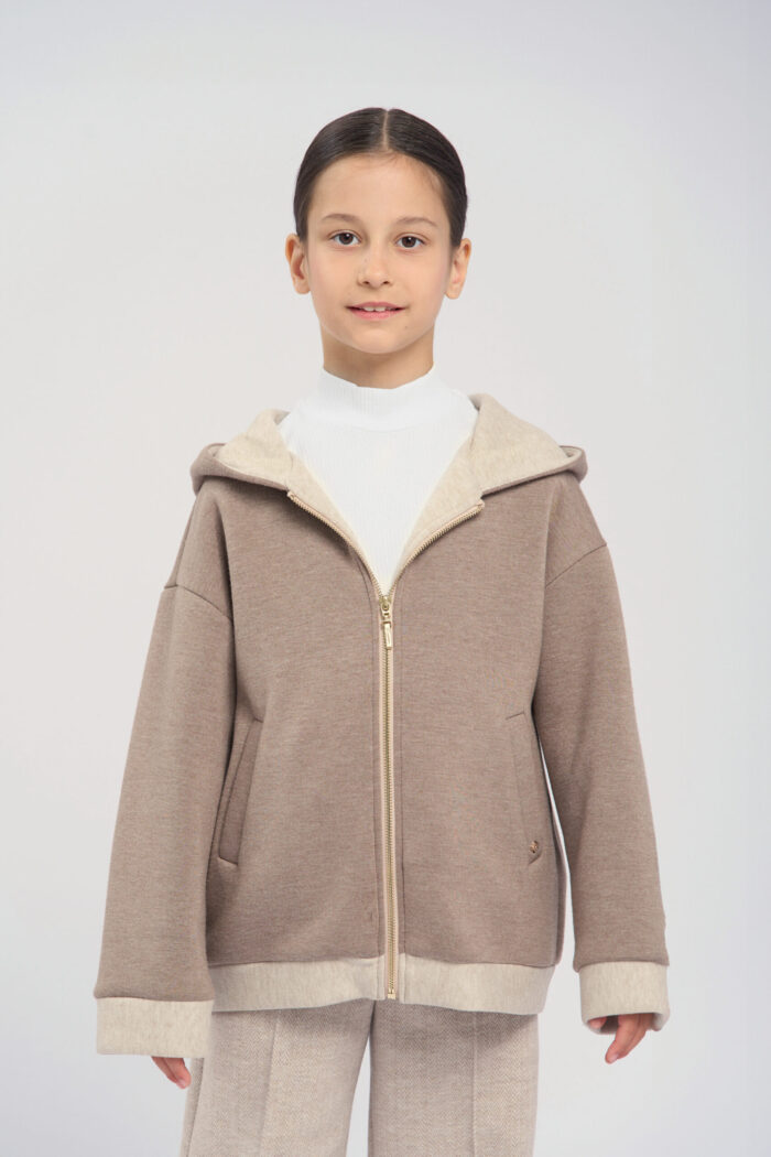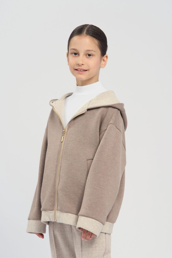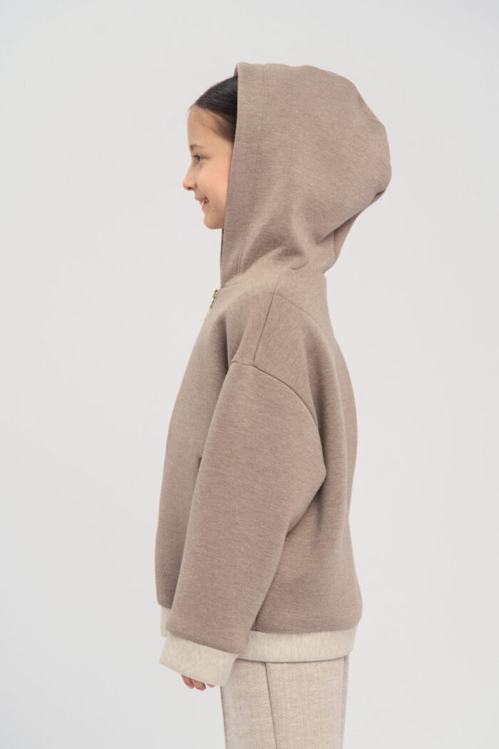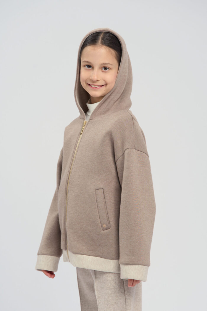 Soft knitted hoodie for girls in a sandy colour. The textured fabric is very pleasant to the touch, making it ideal for everyday use. The long zip at front allows child to easily put on and take off the hoodie. The hood adds protection from wind and cold. There are handy pockets on the sides, allowing child to carry small items. The hoodie is perfect for active walks, sports or just for a cosy everyday look.