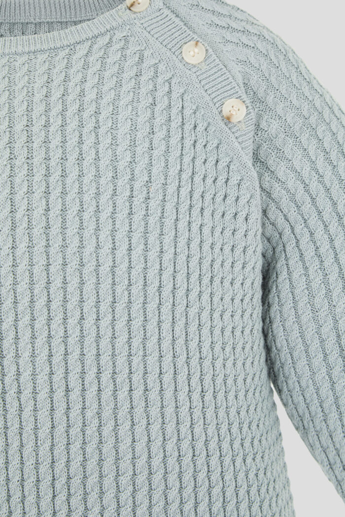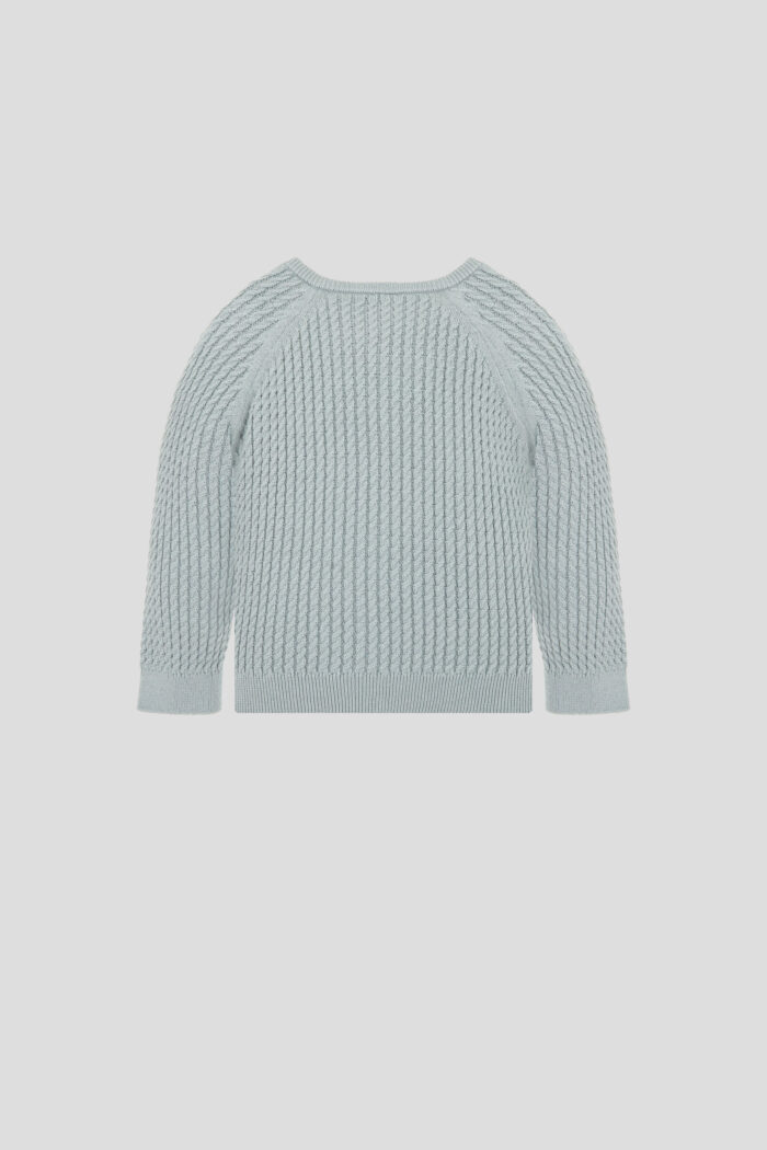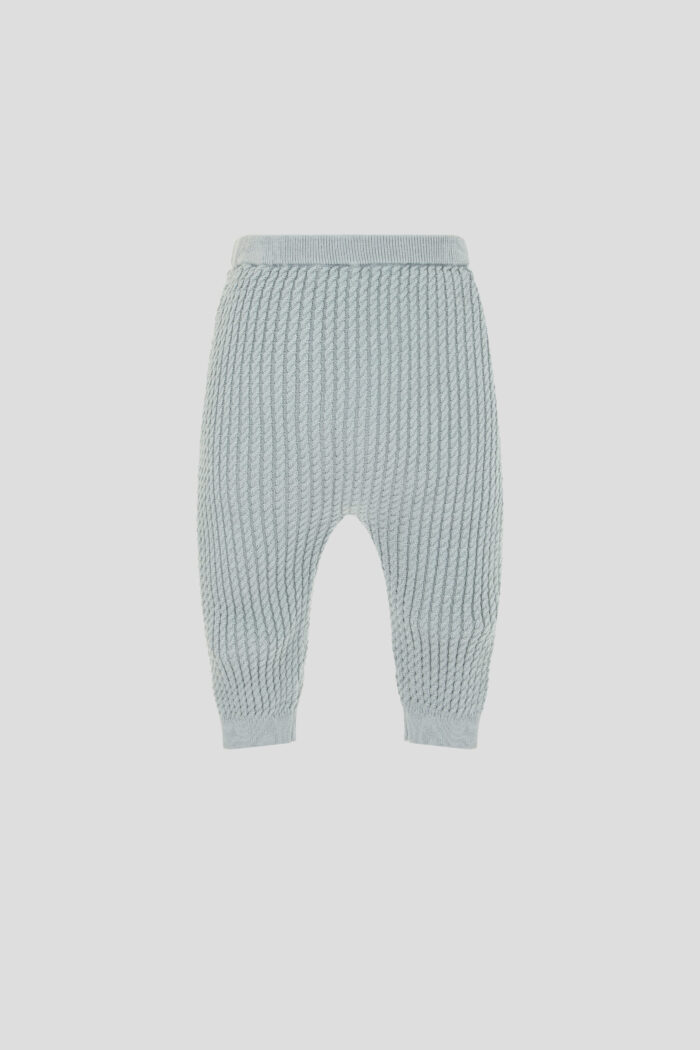 Knitted children’s suit in gray-blue color will be a great choice for baby boys. The set consists of a cozy long sleeve T-shirt and stylish pants. The long sleeve T-shirt is equipped with a convenient button closure. Soft and pleasant to the touch material does not cause discomfort, ideal for sensitive skin of the child. The pants have an elastic waistband with a decorative tie. The gray-blue color makes the set versatile and easy to combine with other items of children’s closet.